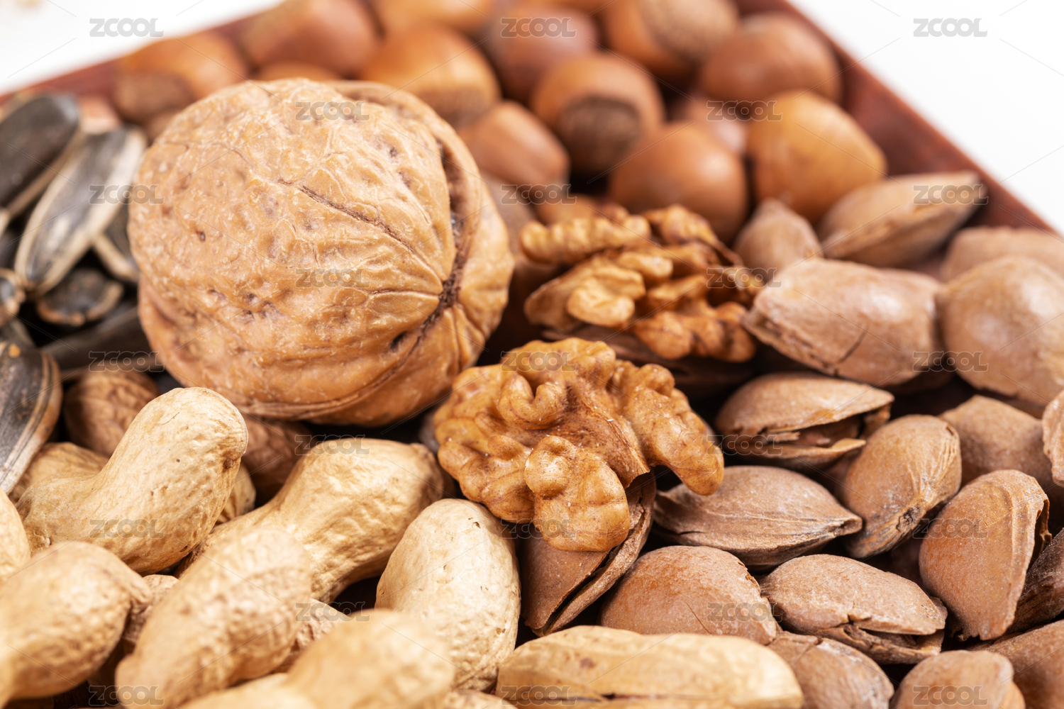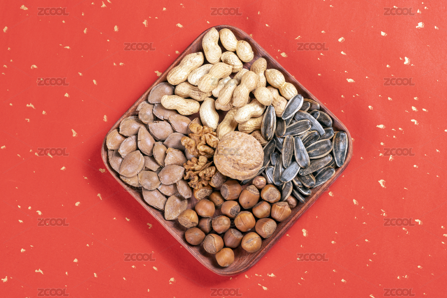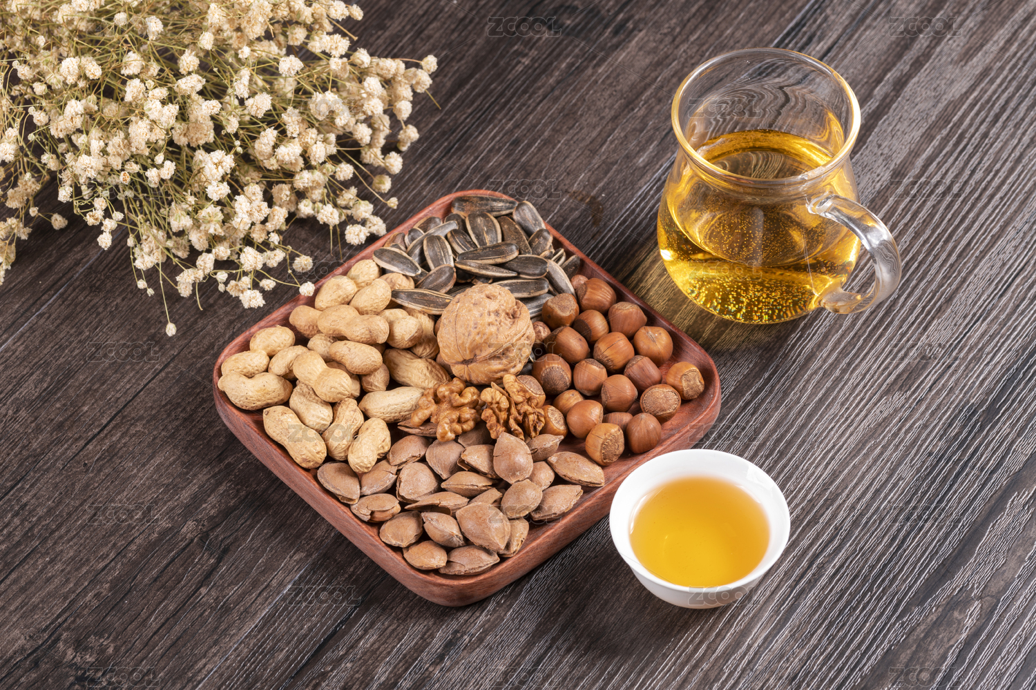 干果果盤擺放在桌面上旁邊放有茶水