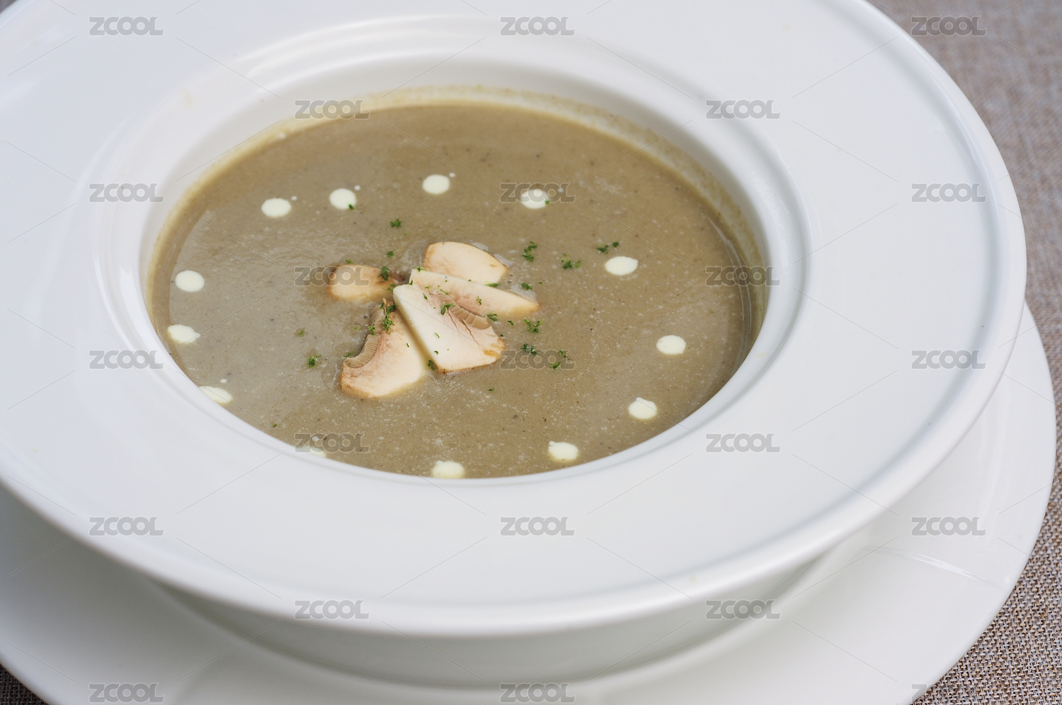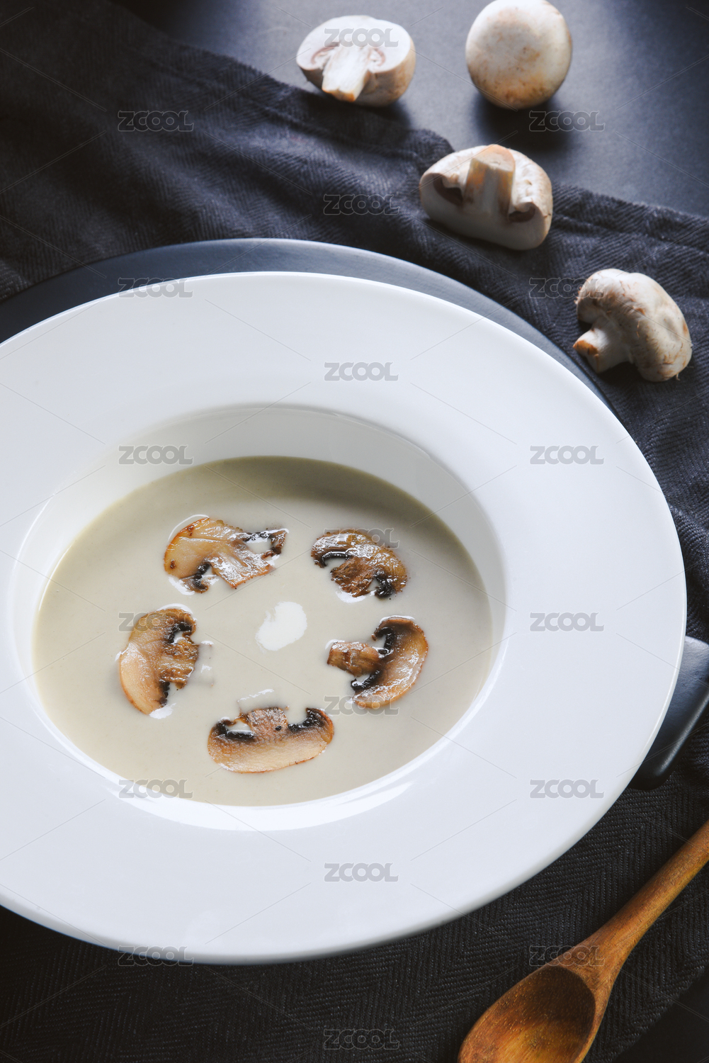 西餐盤子里的奶油蘑菇湯配蒜香烤法棍