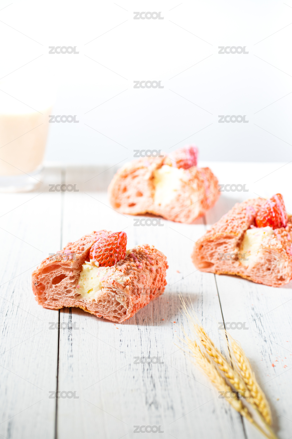 放在白色木板上的草莓軟歐包和牛奶
