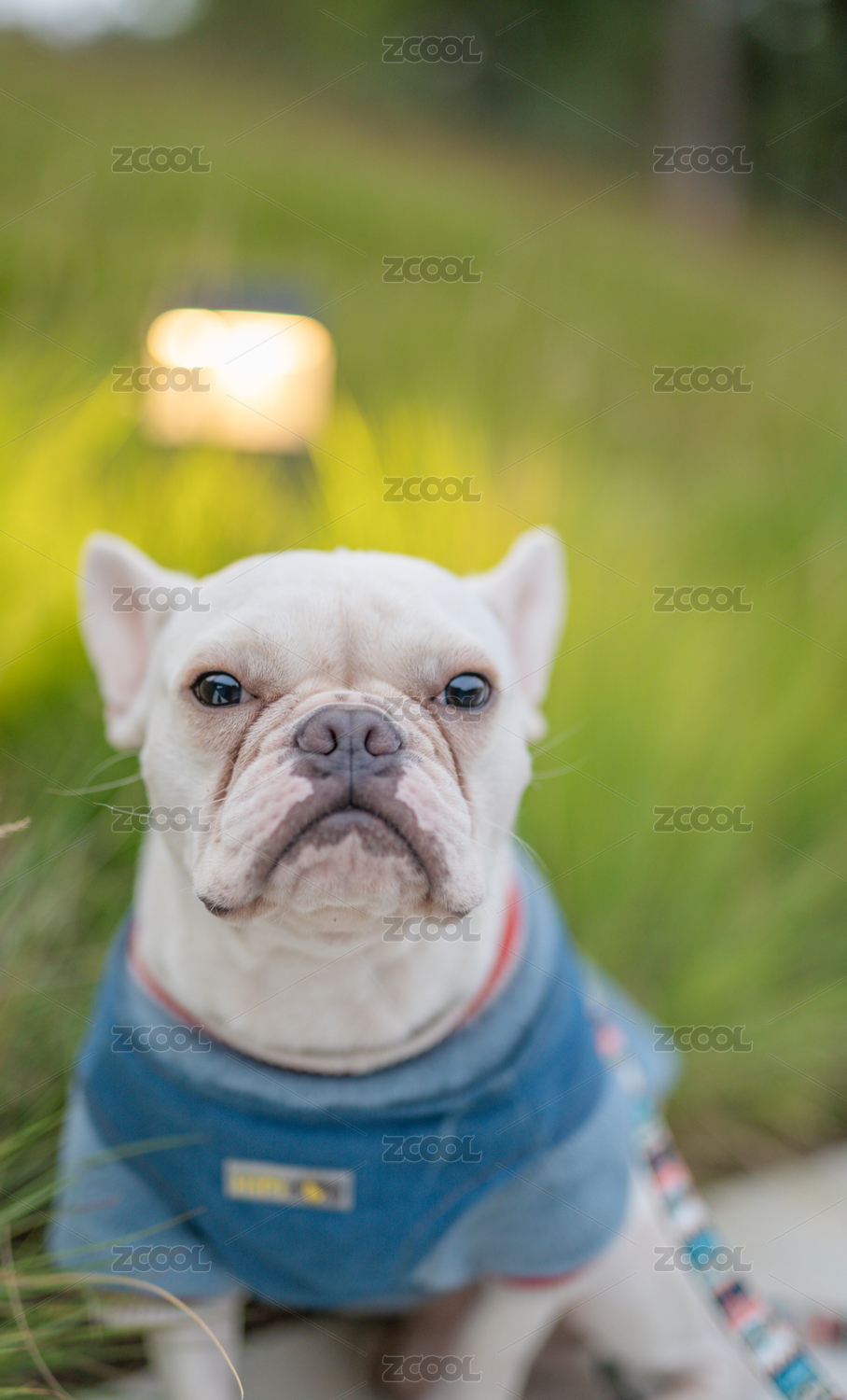 穿衣服的可愛白色法斗站在灰色背景前發(fā)呆