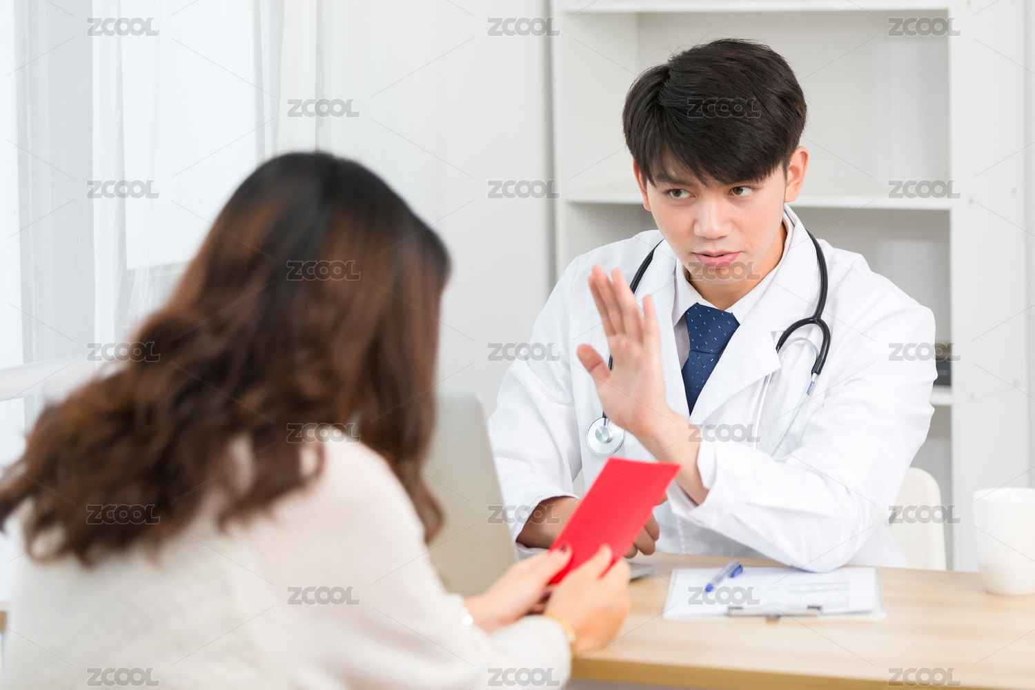 坐在辦公室里的正直的亞洲男醫(yī)生拒絕接受患者贈送的紅包