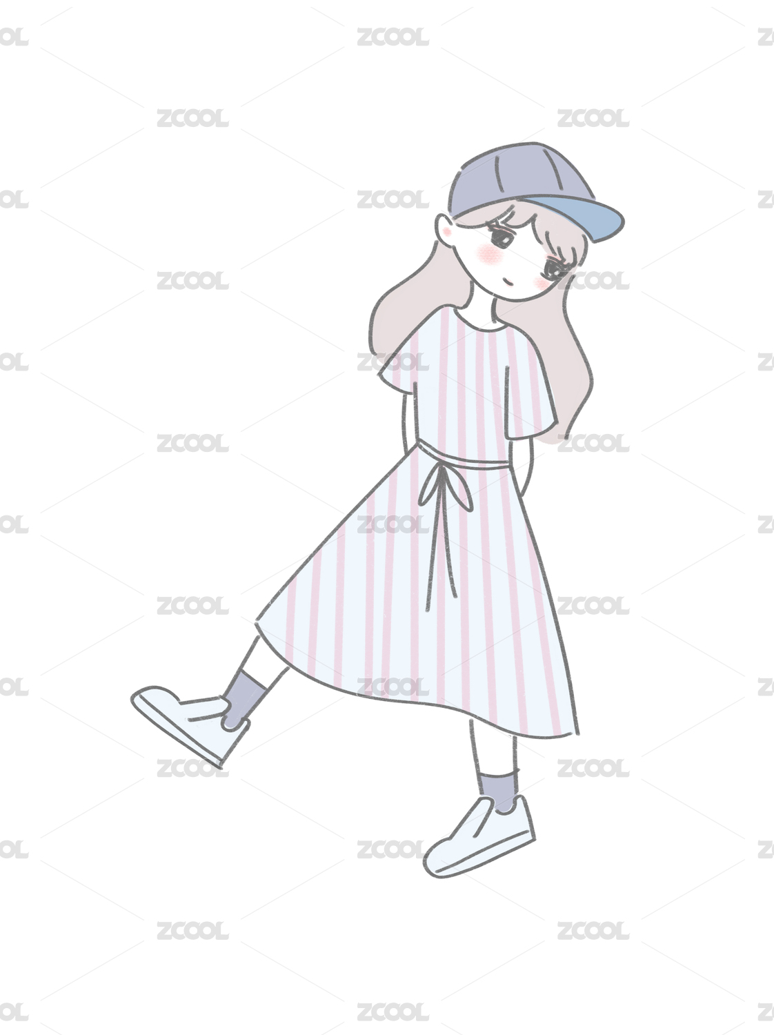 手繪插畫戴帽子的時(shí)尚女孩穿搭走路回頭微笑
