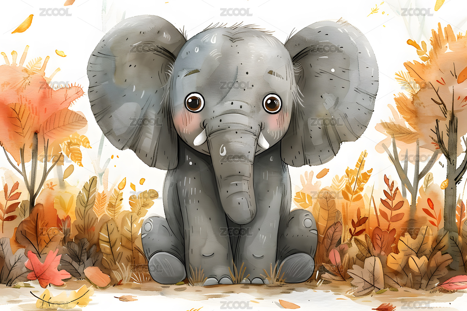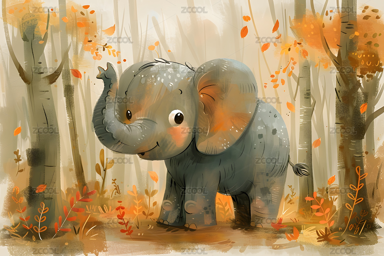 兒童水彩插畫森林里的大象