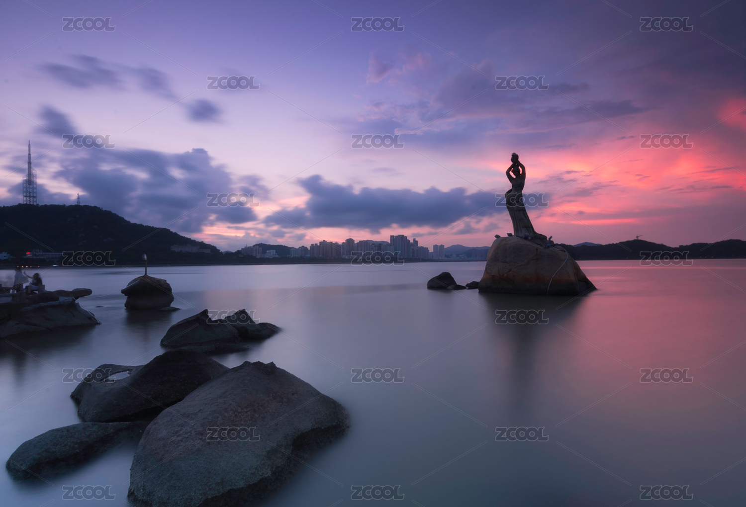廣東省珠海市珠海漁女雕像清晨日出朝霞