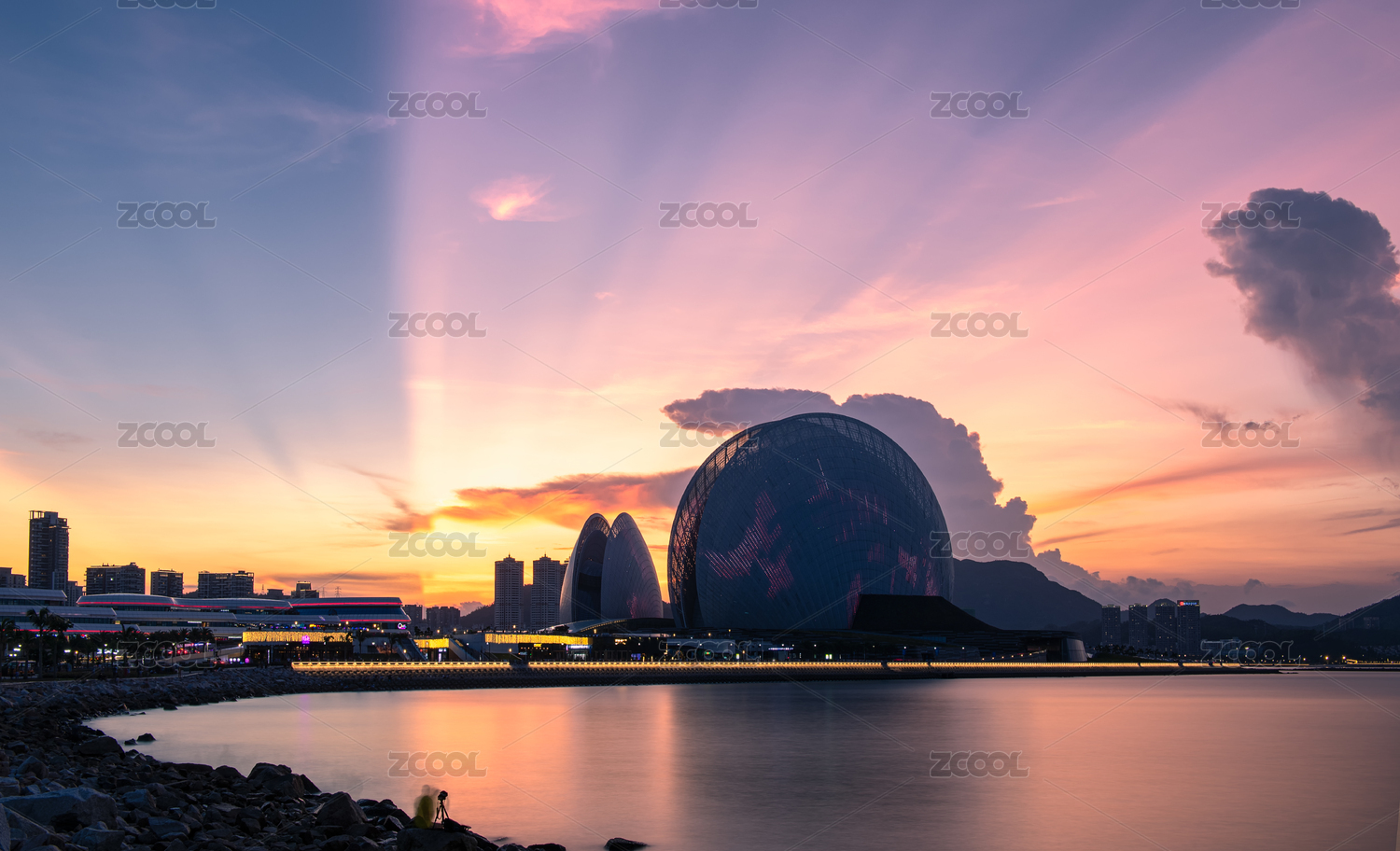 中國廣東珠海日月貝歌劇院,傍晚時分出現(xiàn)了罕見的火燒云