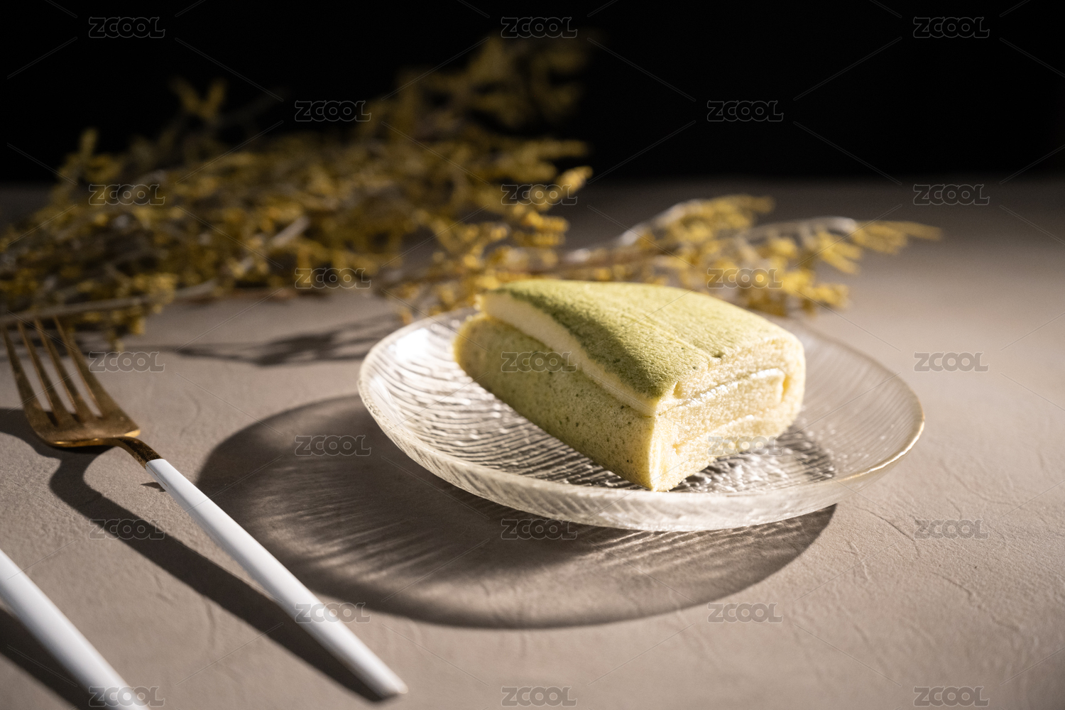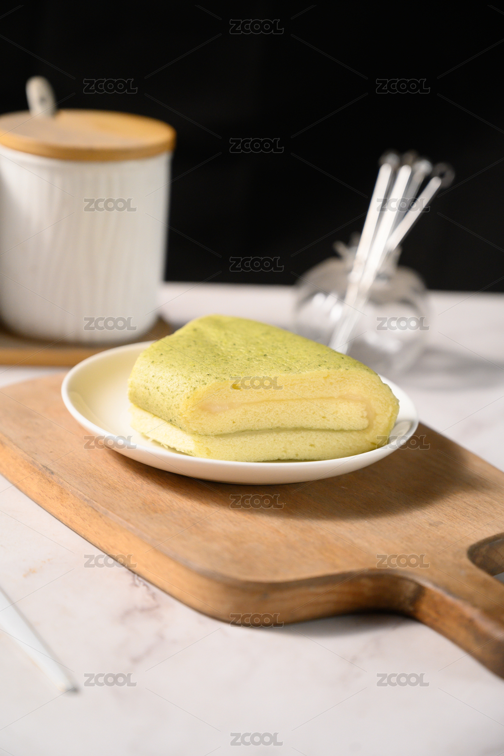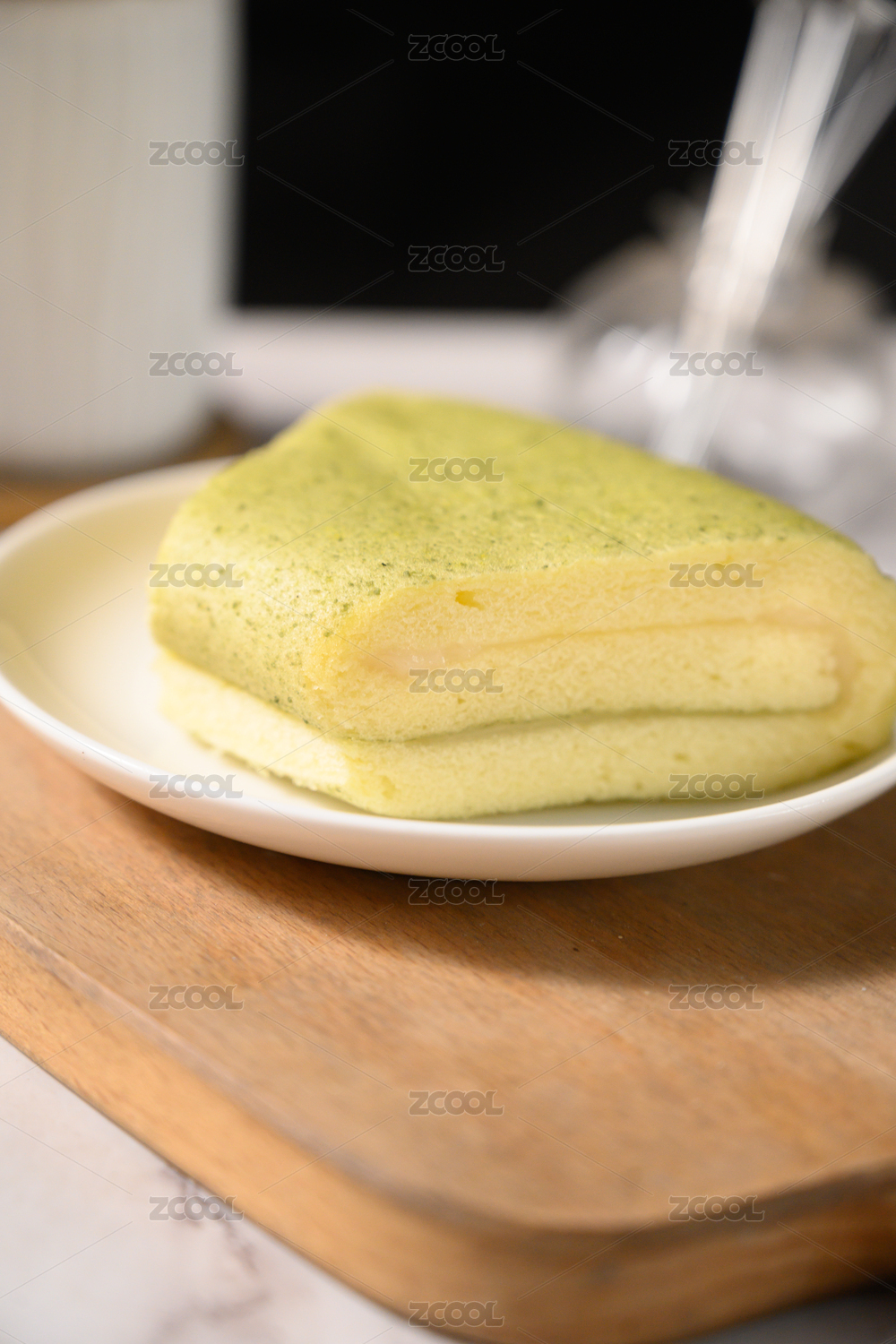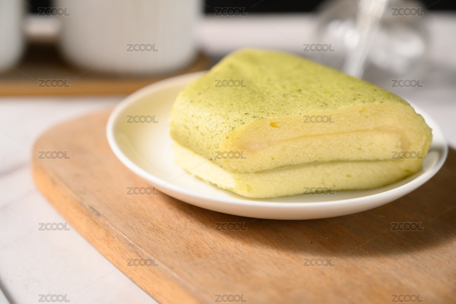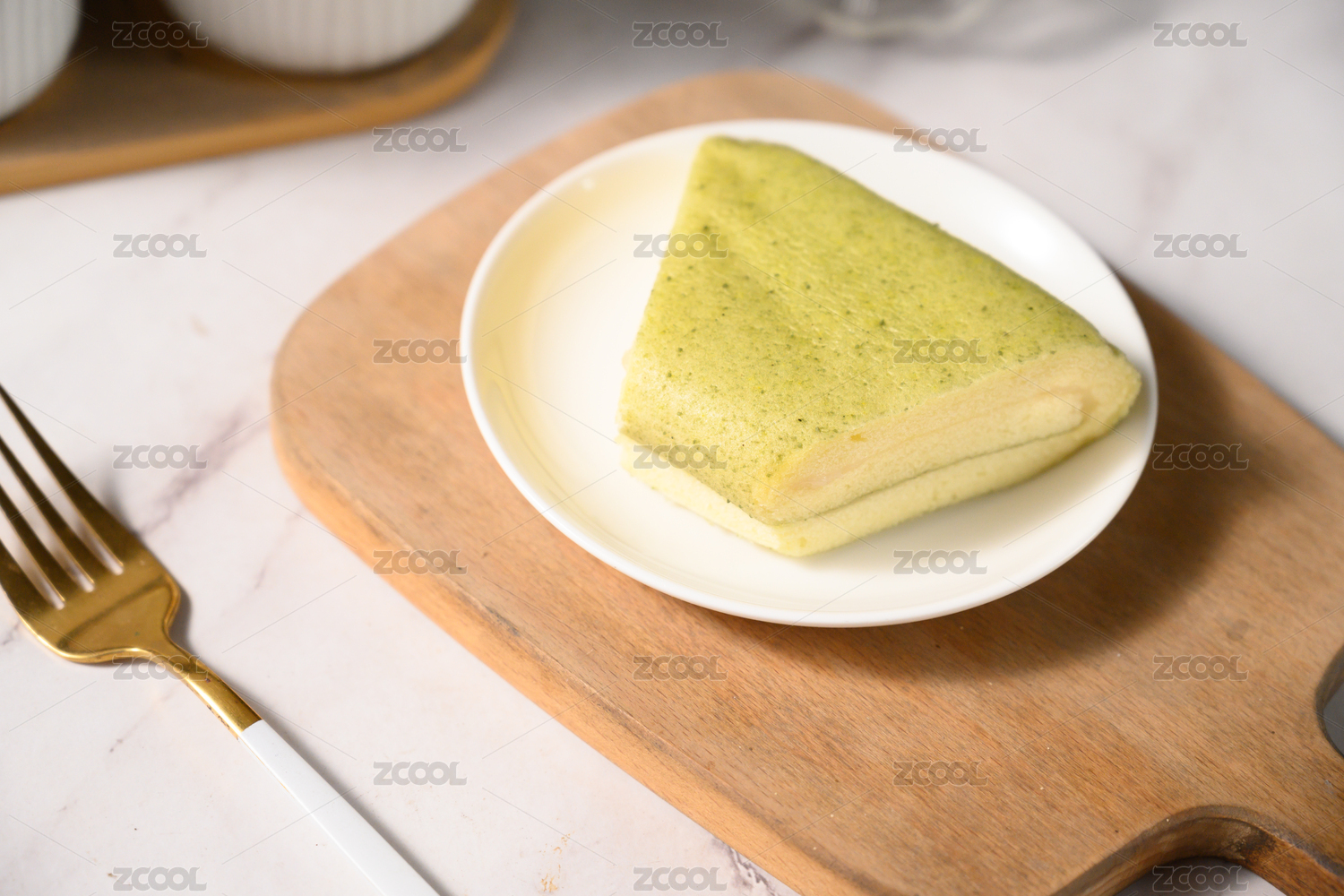 桌面上的盤子里的美味可口的抹茶蛋糕卷