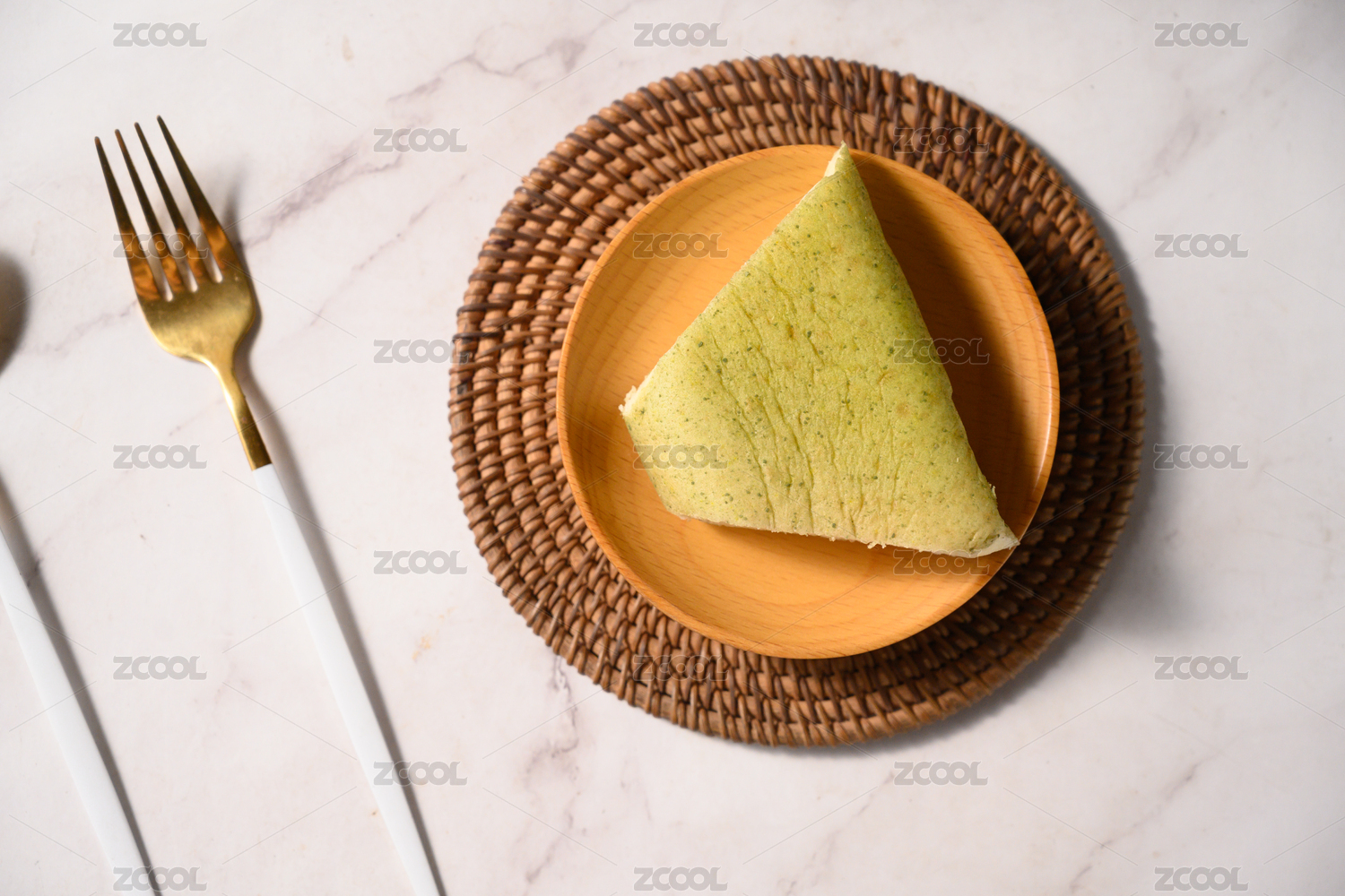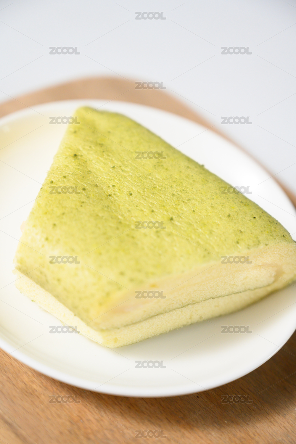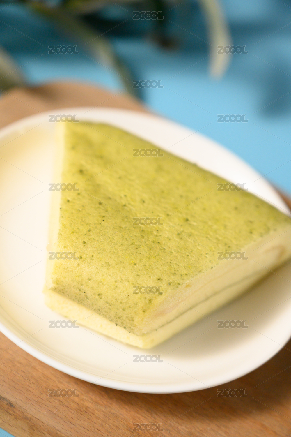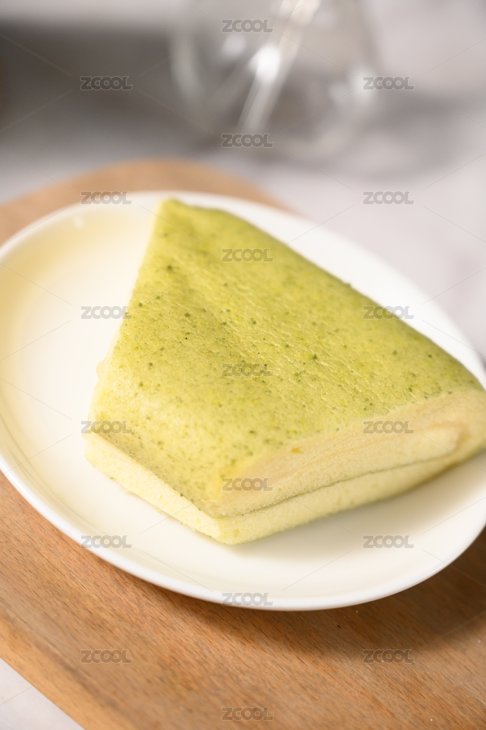 桌面上的盤子里的美味可口的抹茶蛋糕卷