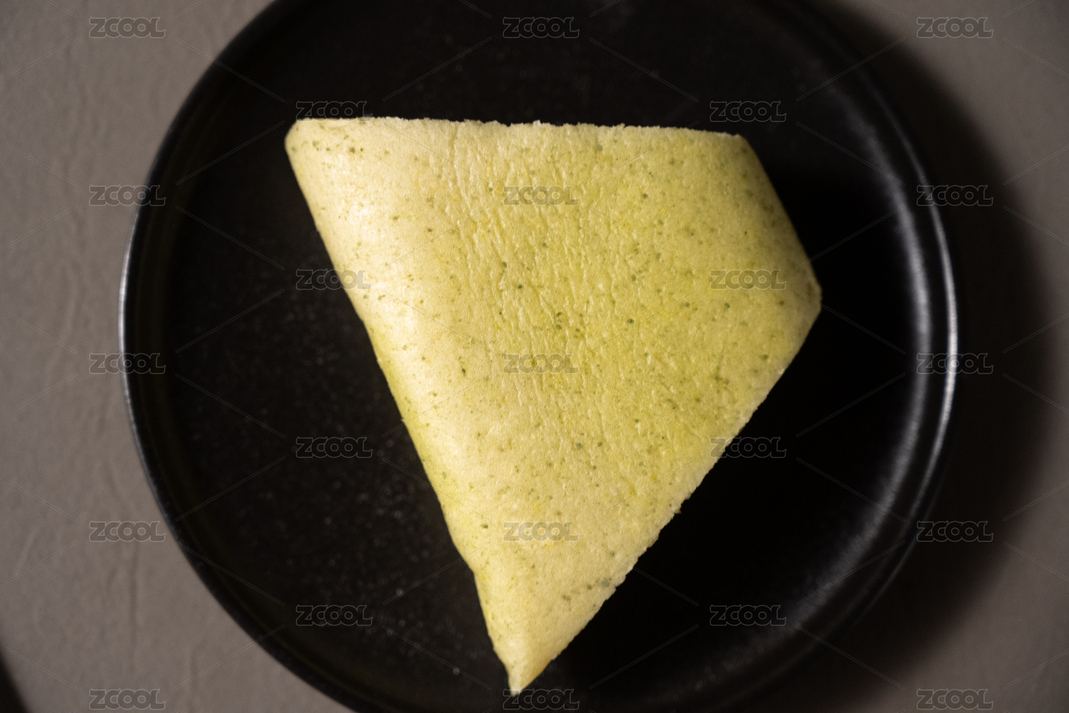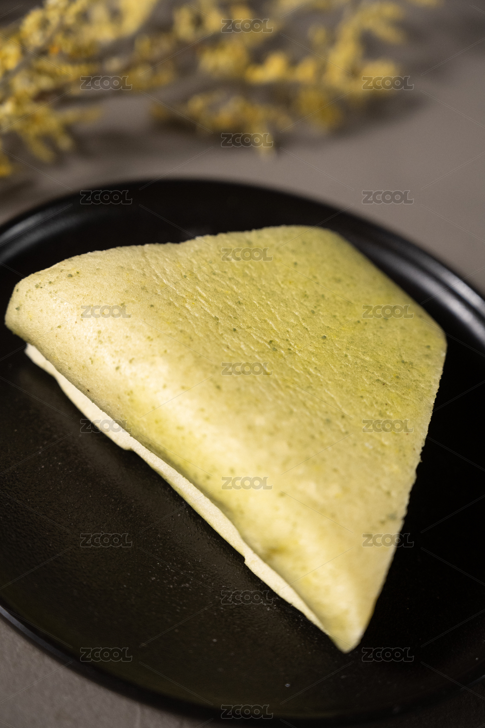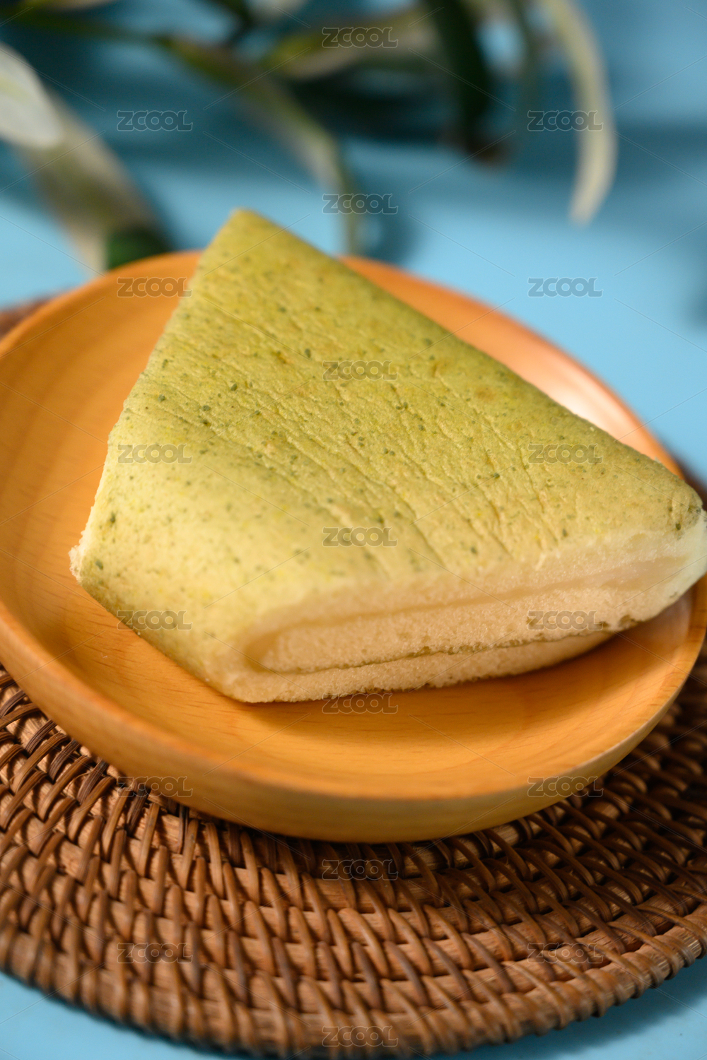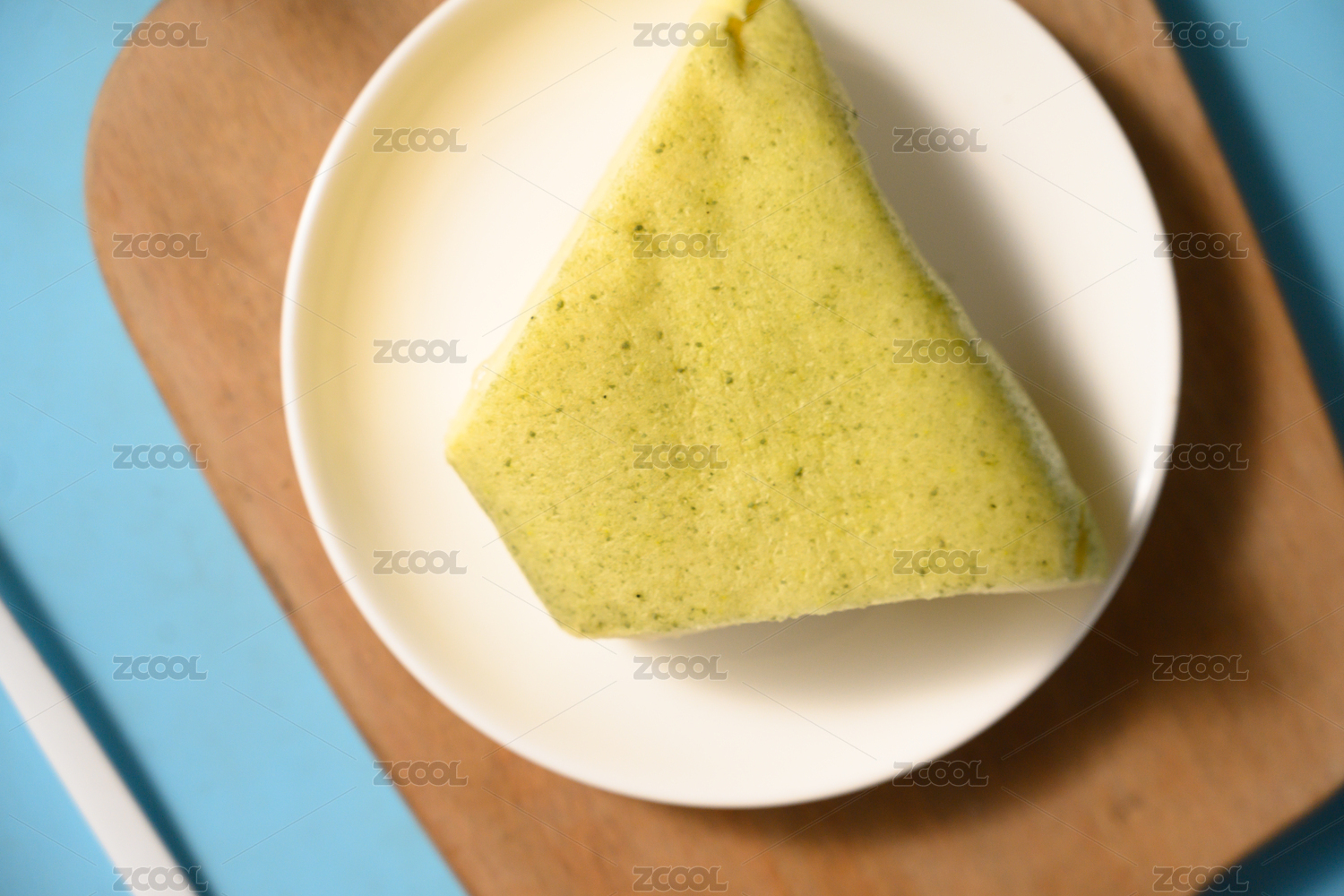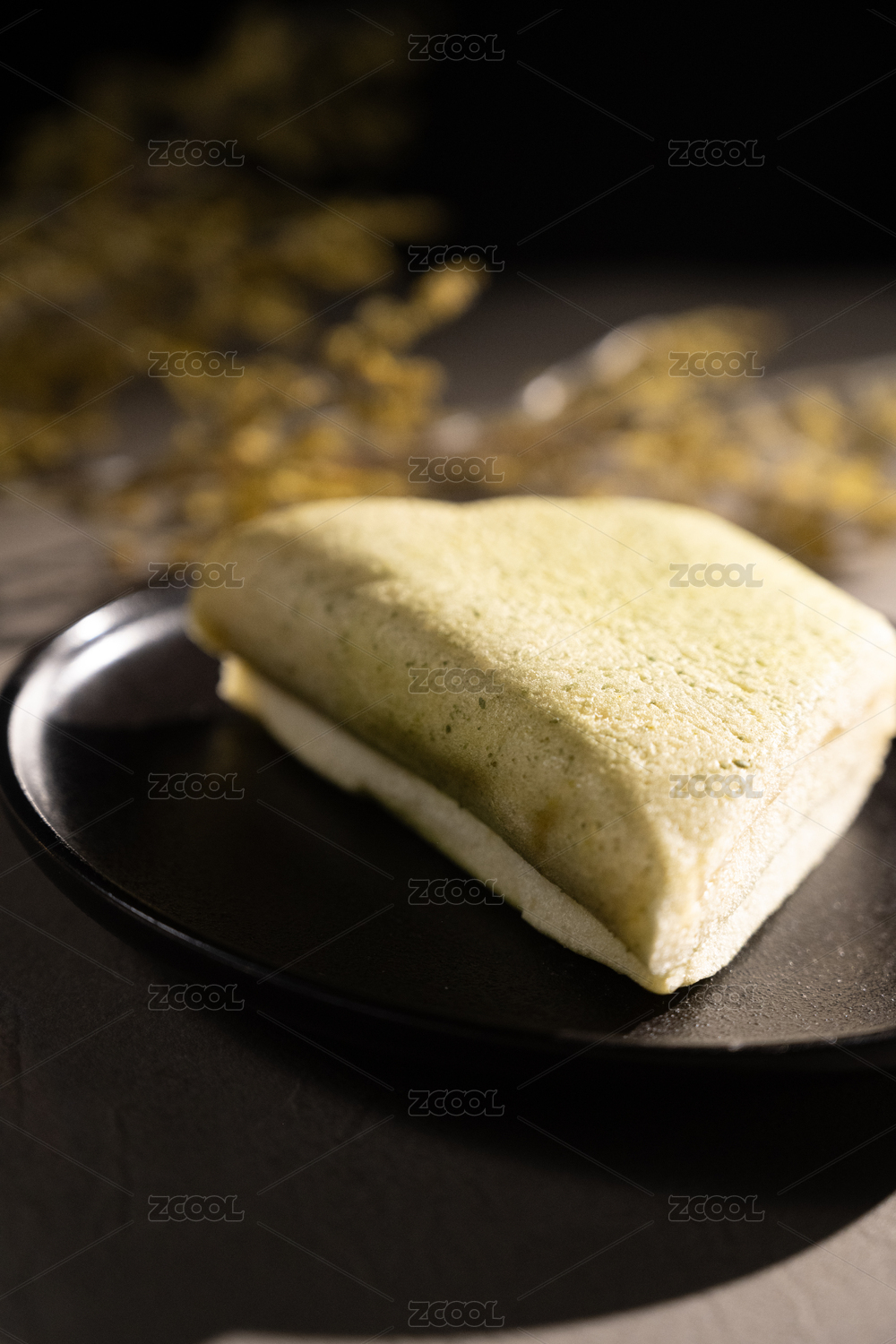 桌面上的盤子里的美味可口的抹茶蛋糕卷