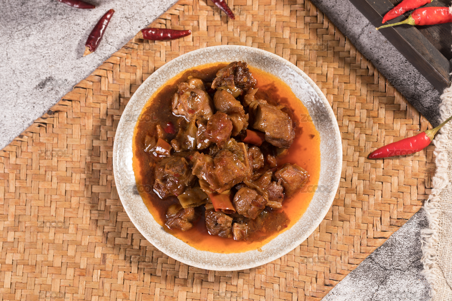 中式復(fù)古背景上用淺色盤子裝著的啤酒鴨小吃