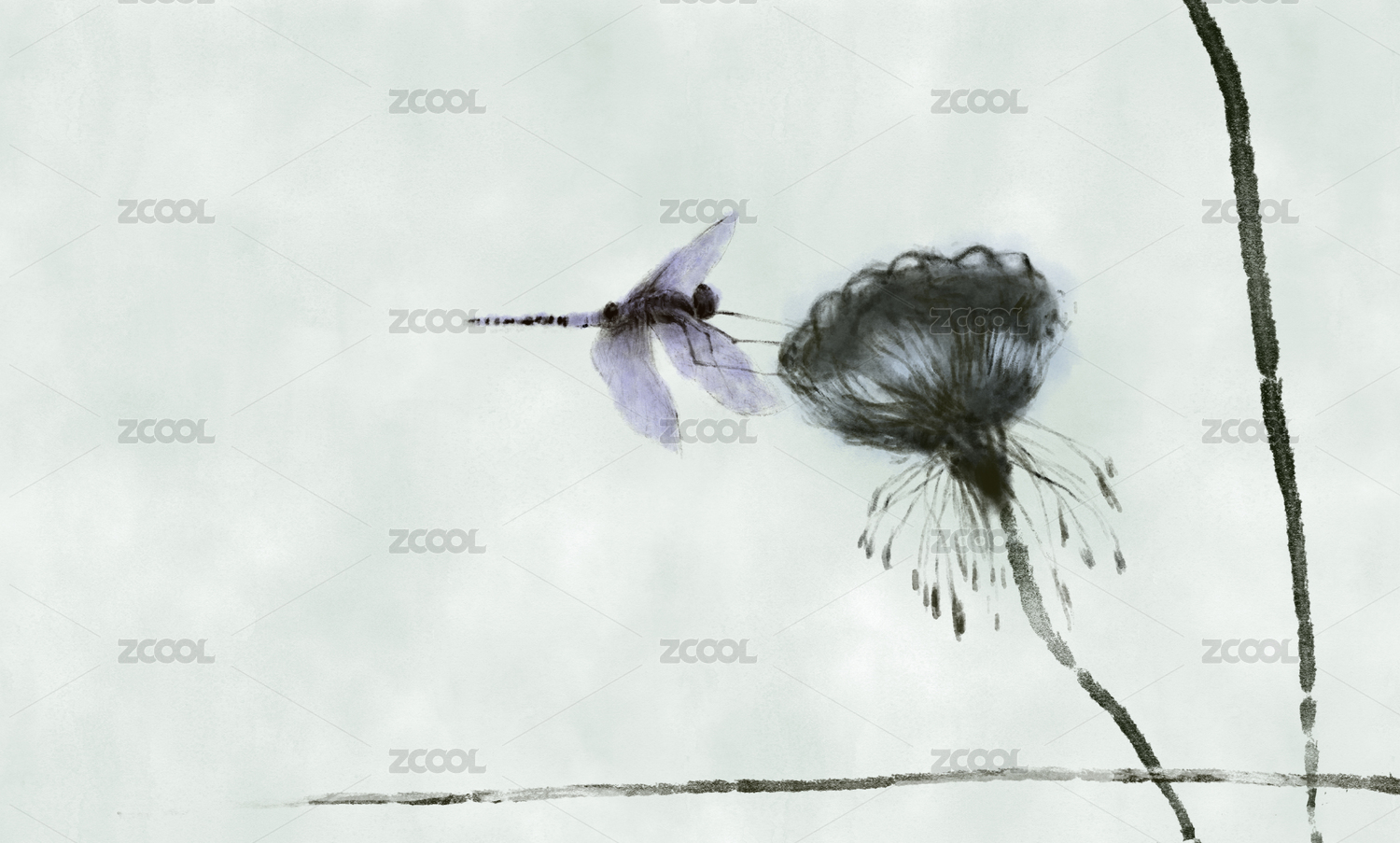荷花蜻蜓水墨畫