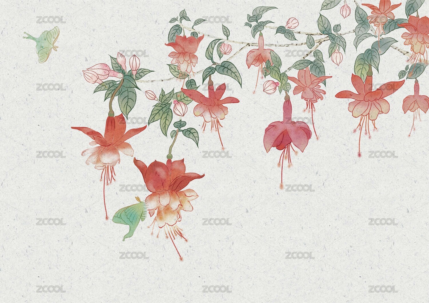 盛開的紅色倒掛金鐘和采蜜的蝴蝶