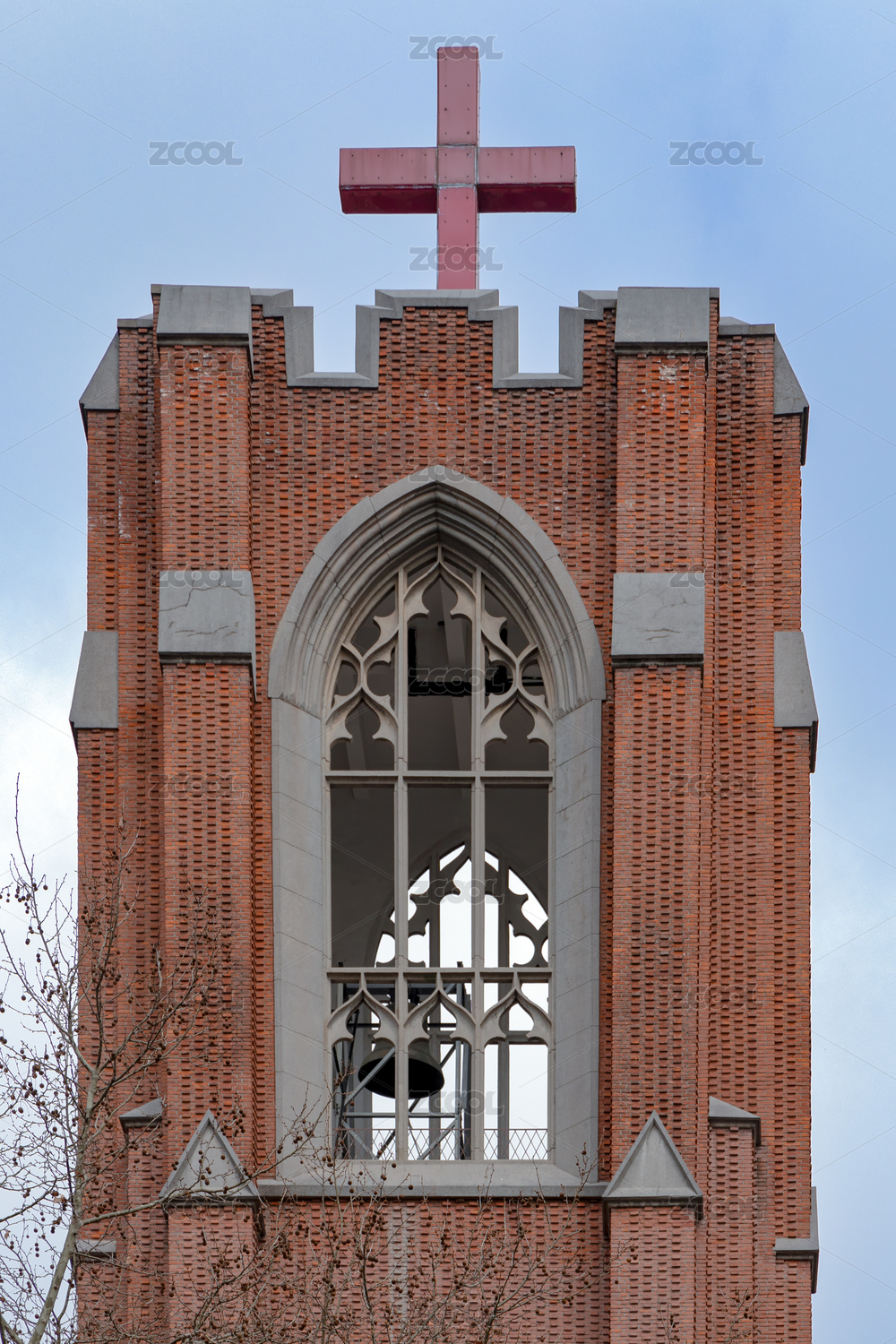 上海沐恩堂塔尖特寫,紅磚結(jié)構(gòu)哥特式教堂