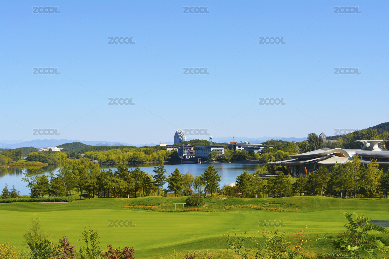 中國北京懷柔雁棲湖邊高爾夫球場及遠處的東方日出酒店