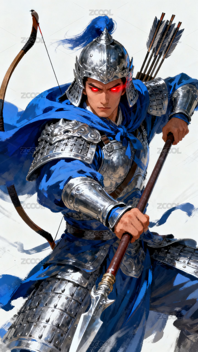 銀甲藍袍武將持槍弓戰(zhàn)斗姿態(tài)