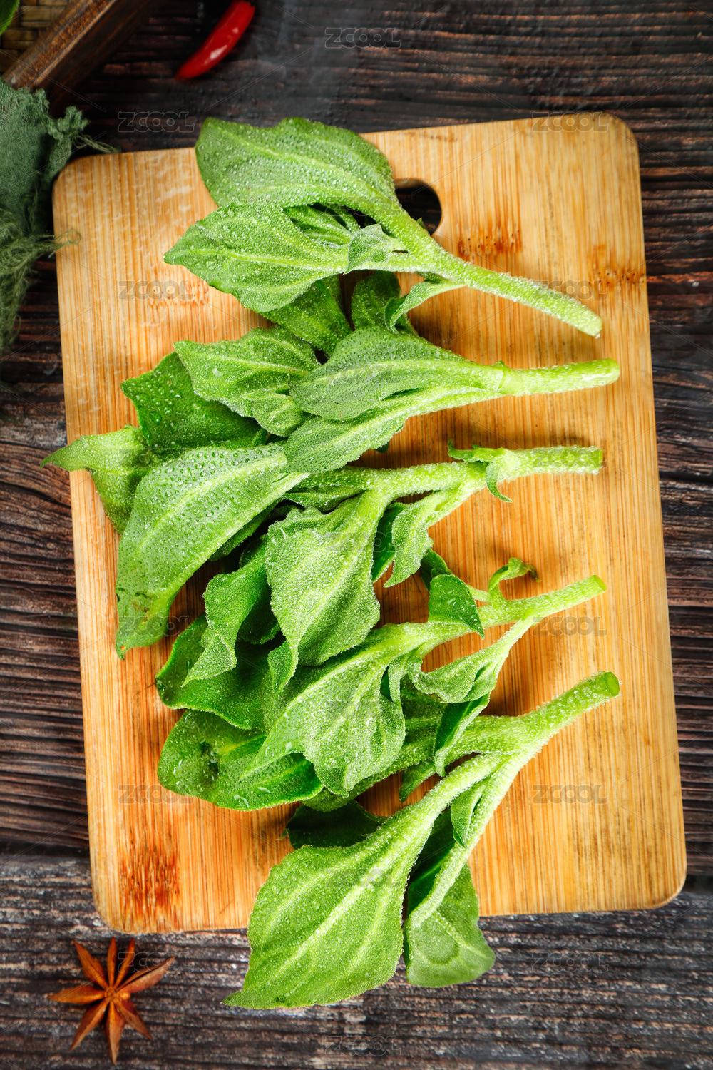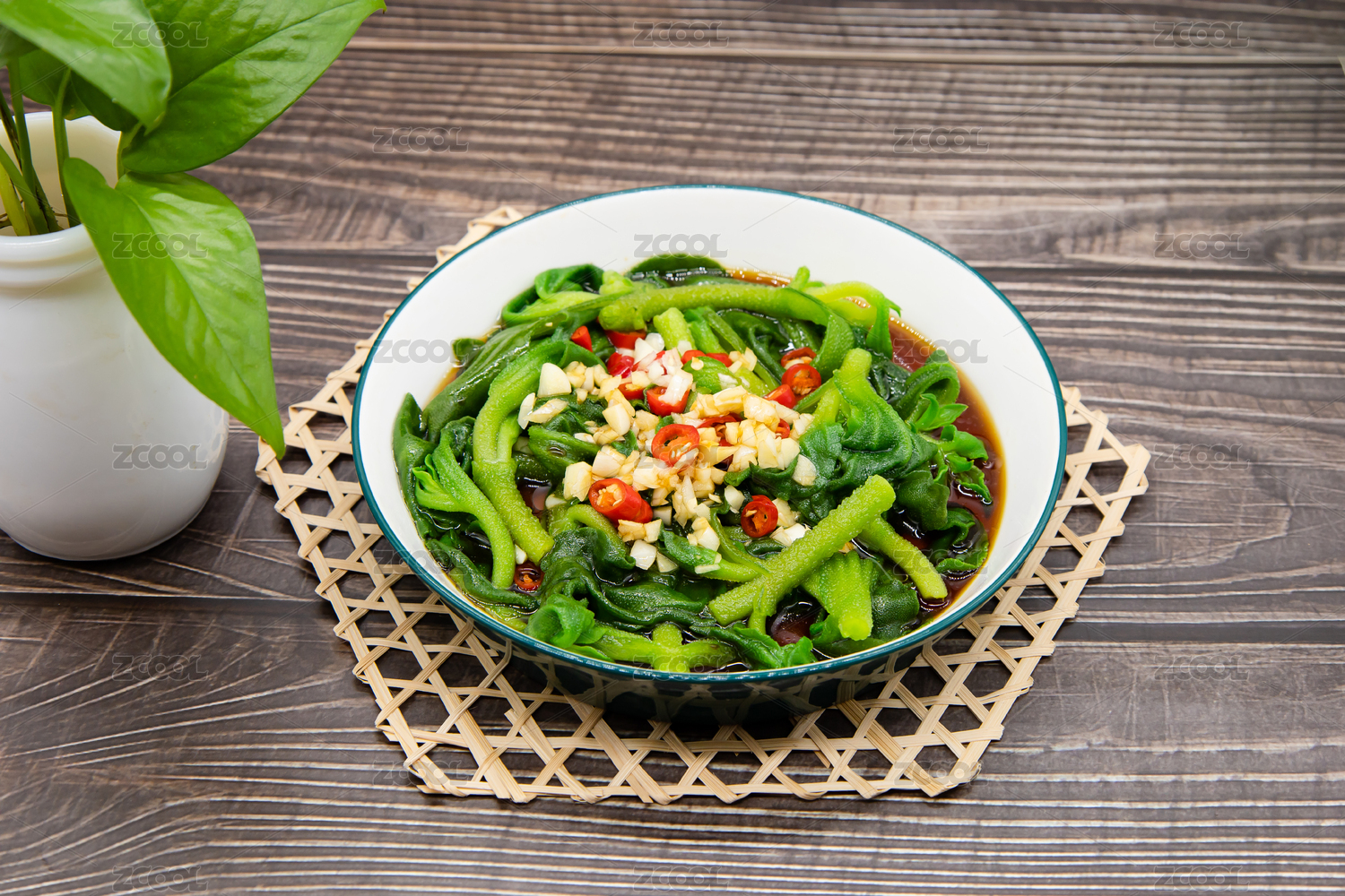 木桌背景一盤涼拌冰菜