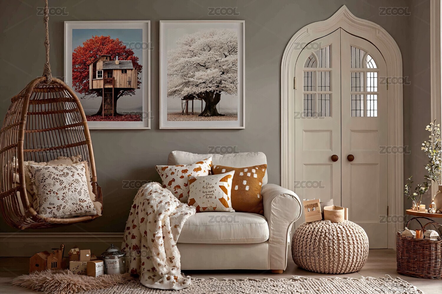 秋日氛圍感家居一角,溫暖舒適的編織座椅