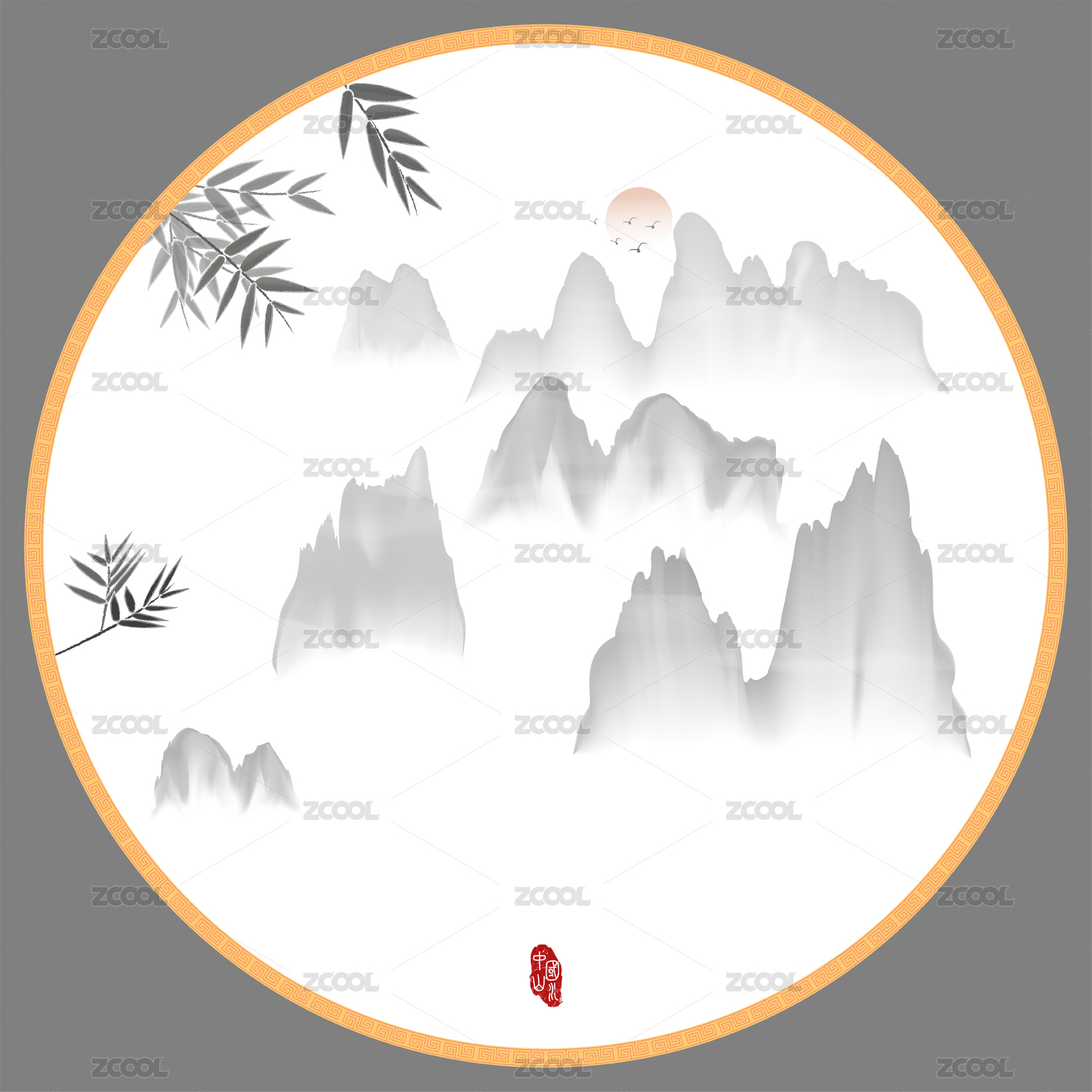 圓形中國風(fēng)意境水墨竹子山水裝飾矢量圖