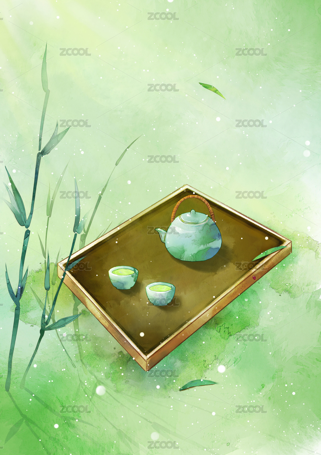 綠色環(huán)境下的茶古風(fēng)水彩禪茶