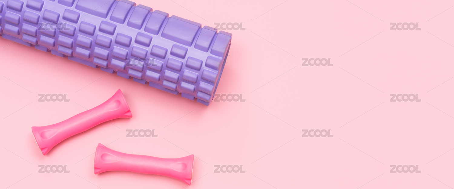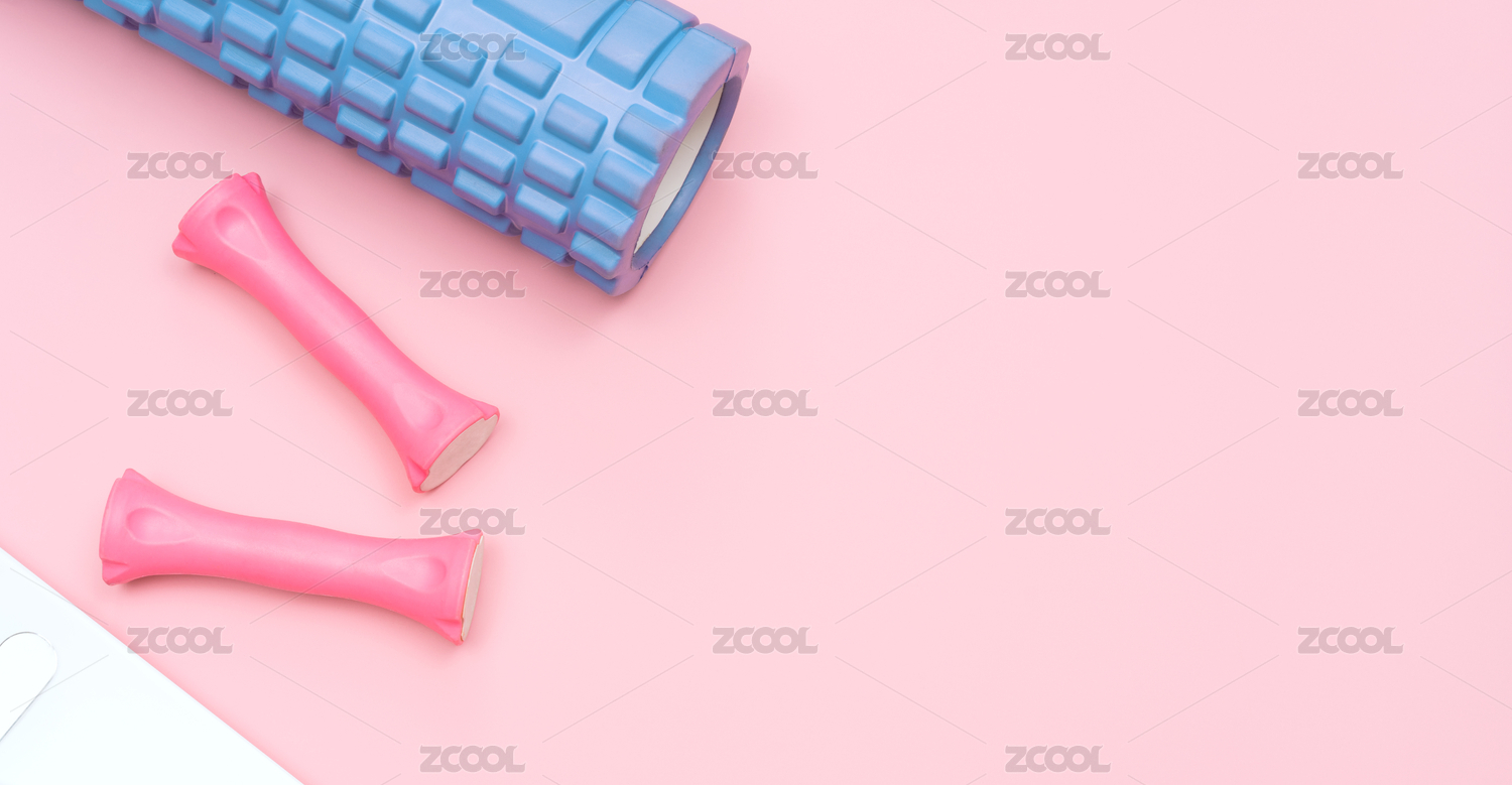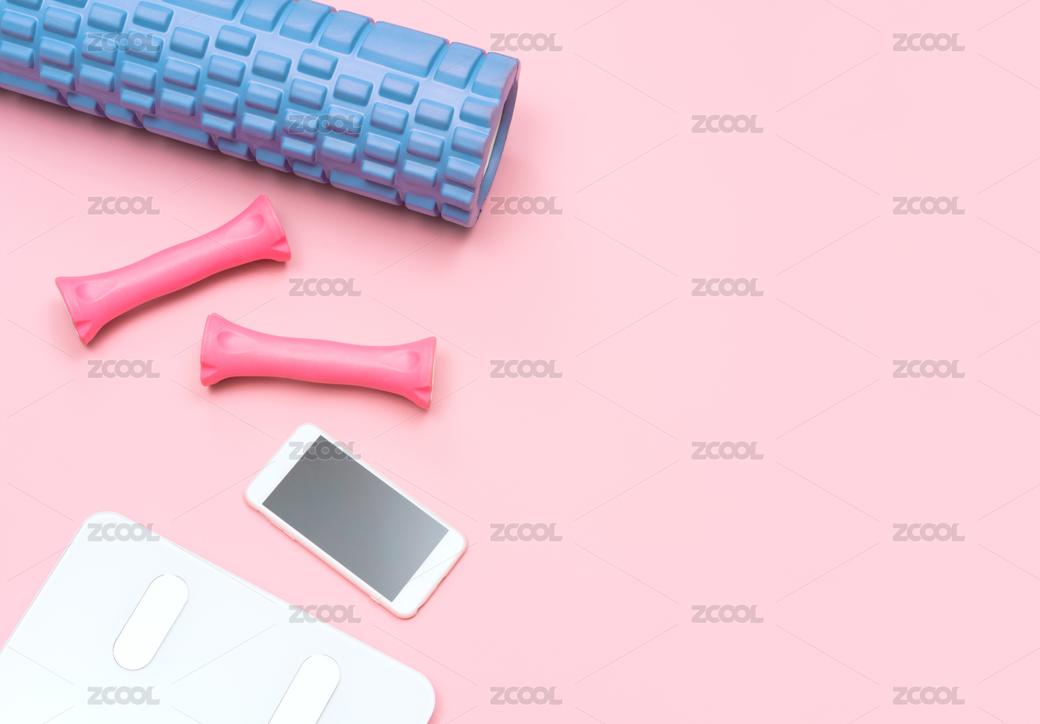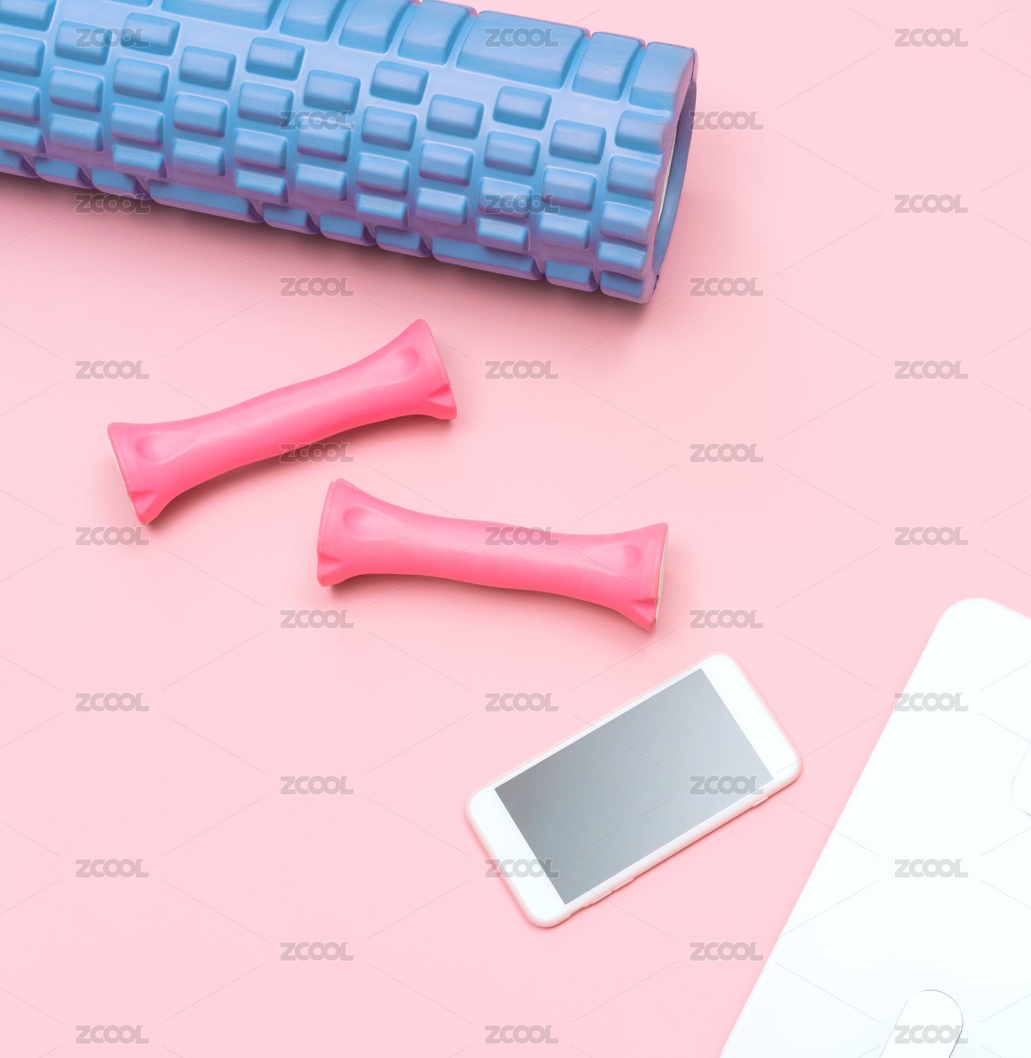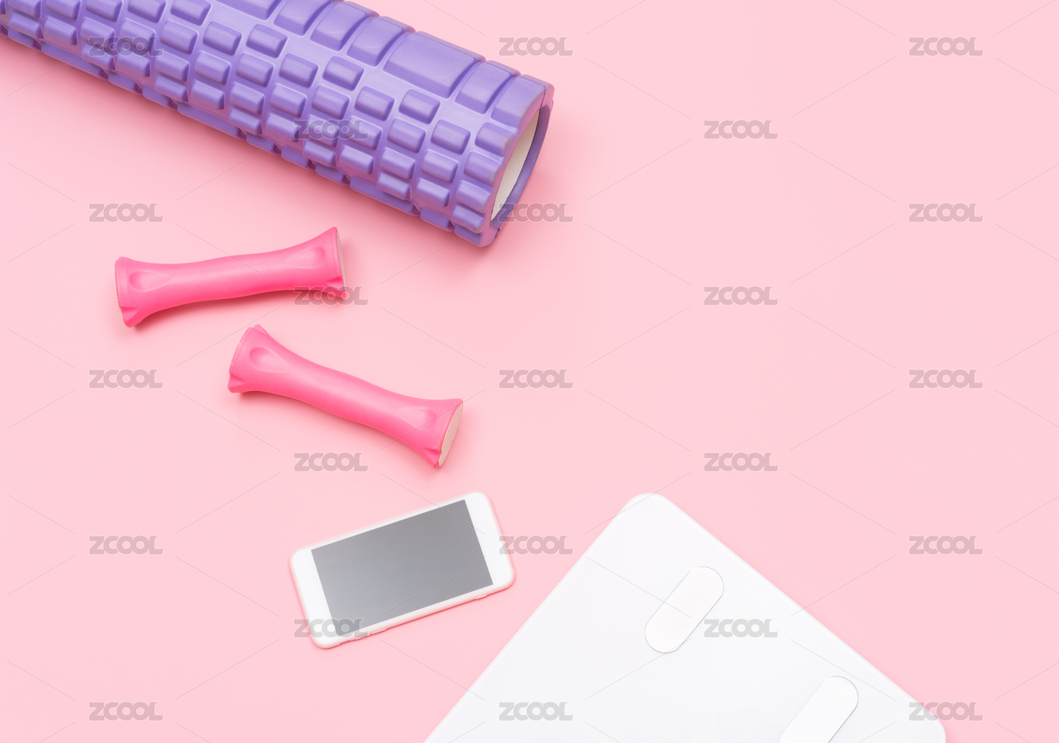 泡沫軸、人體體重秤和一副啞鈴在粉色的背景上