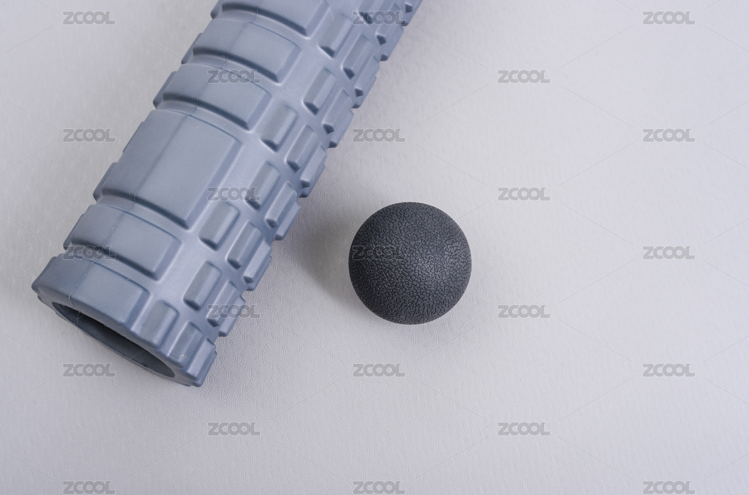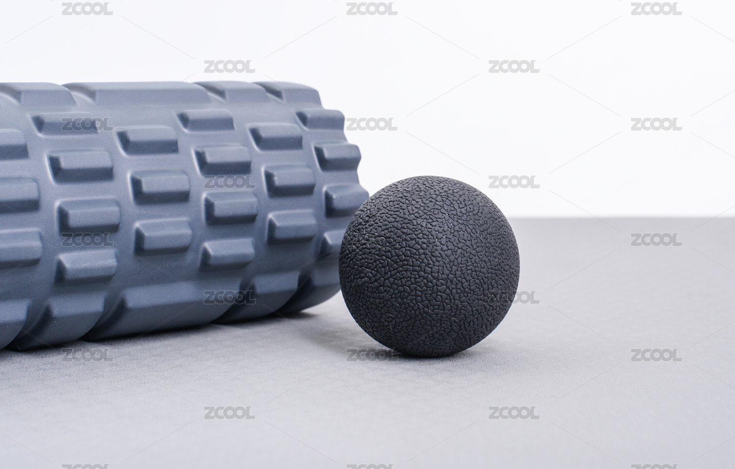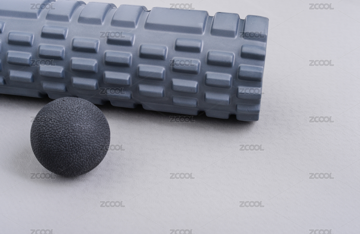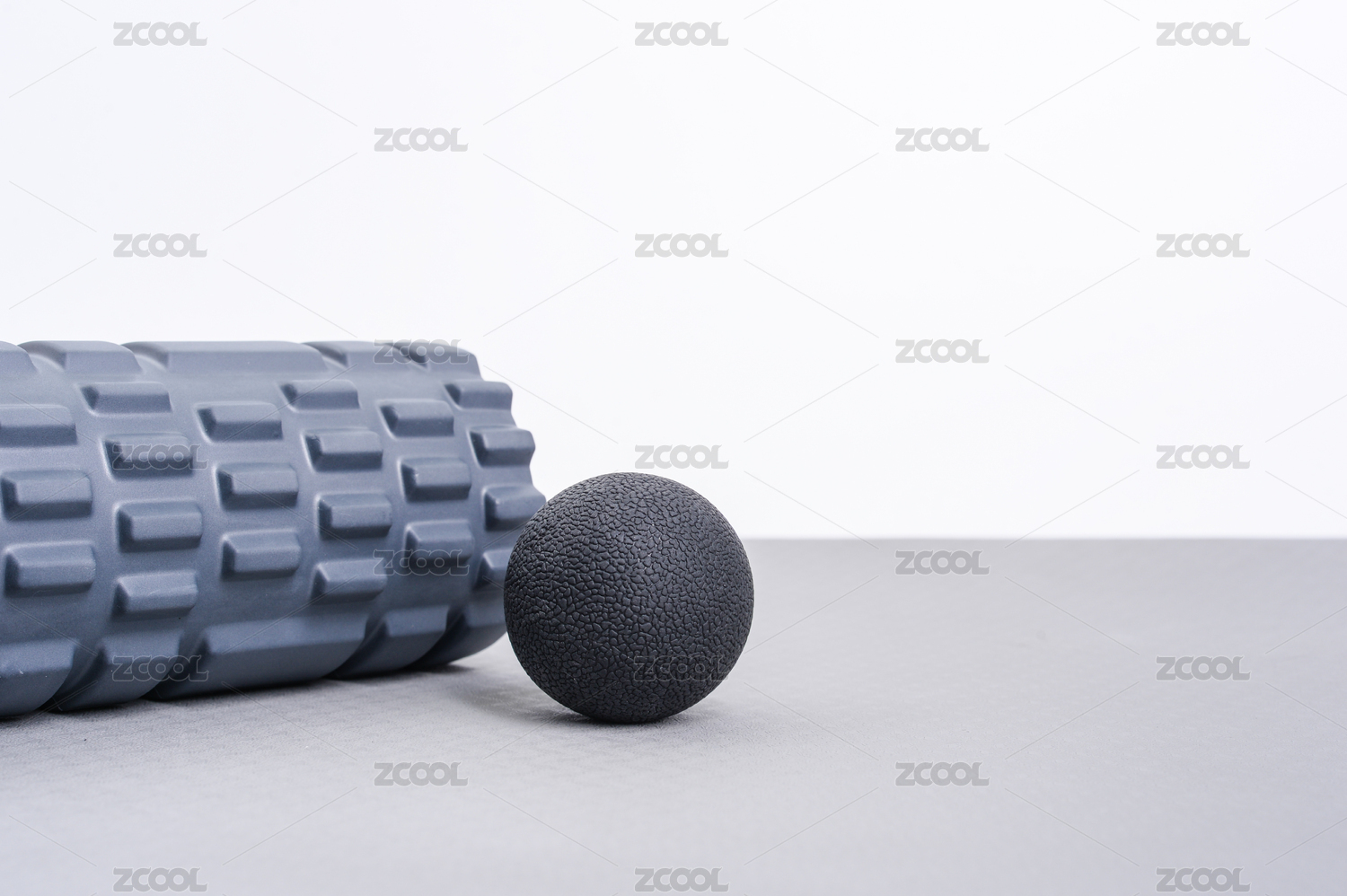 堆放在地面上的放松軸及各色壺鈴墻面背景