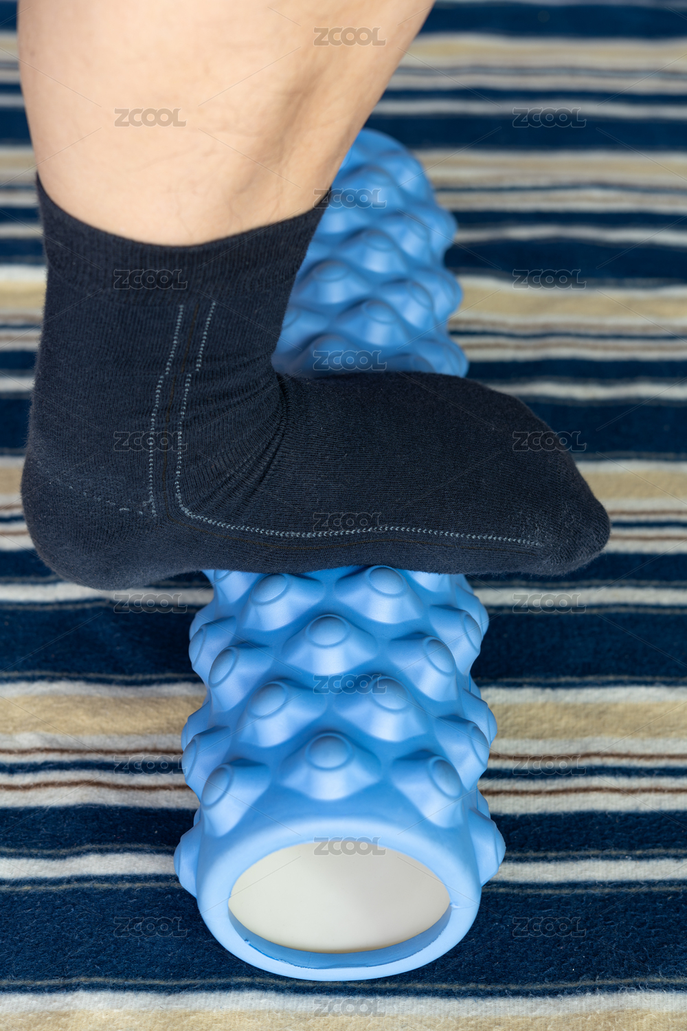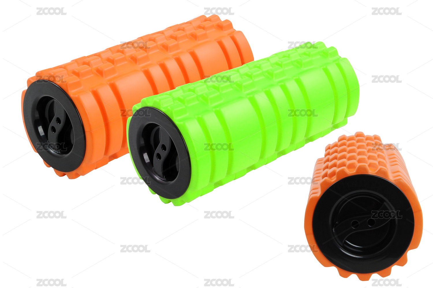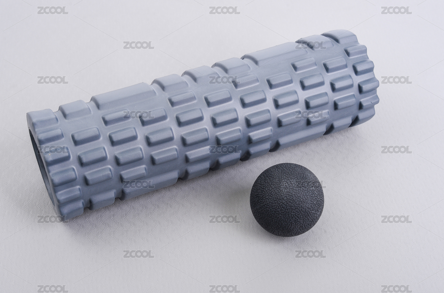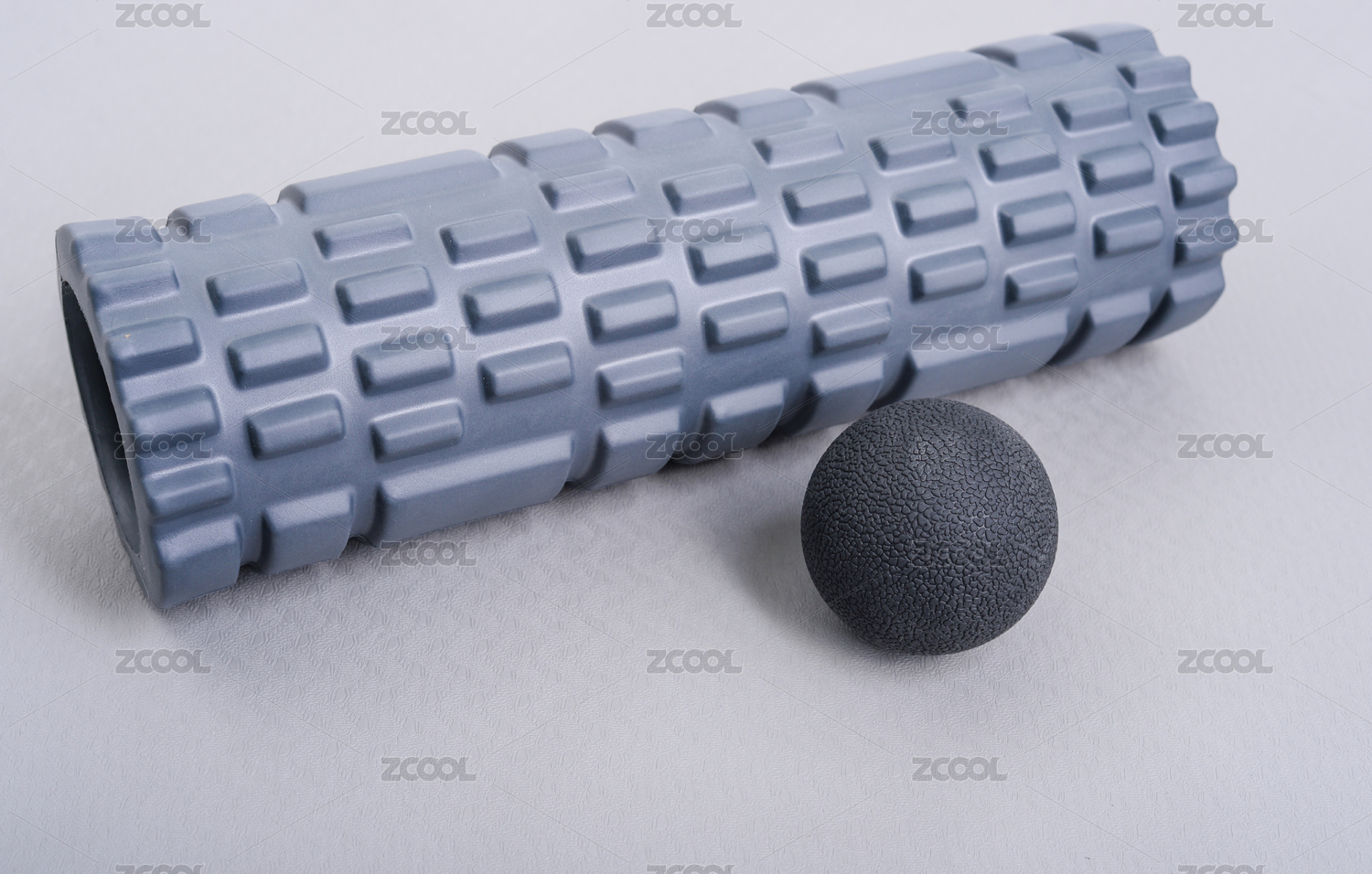 堆放在地面上的放松軸及各色壺鈴墻面背景