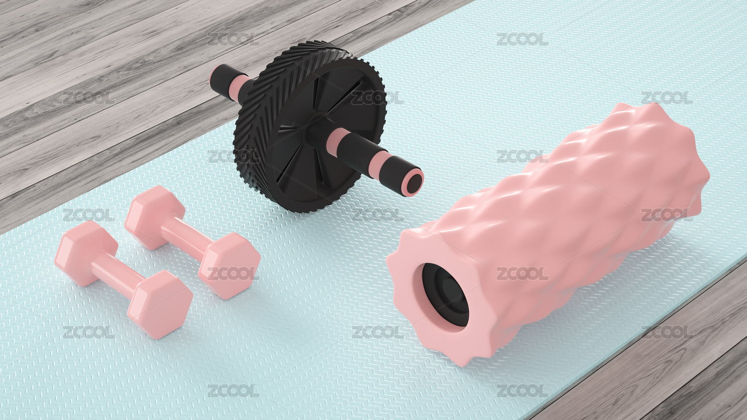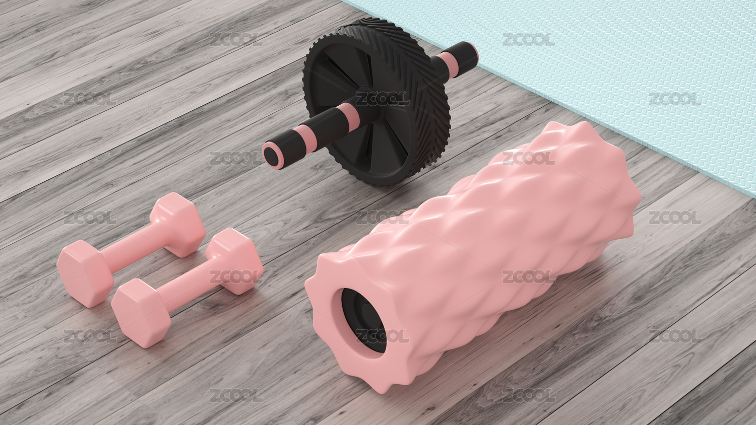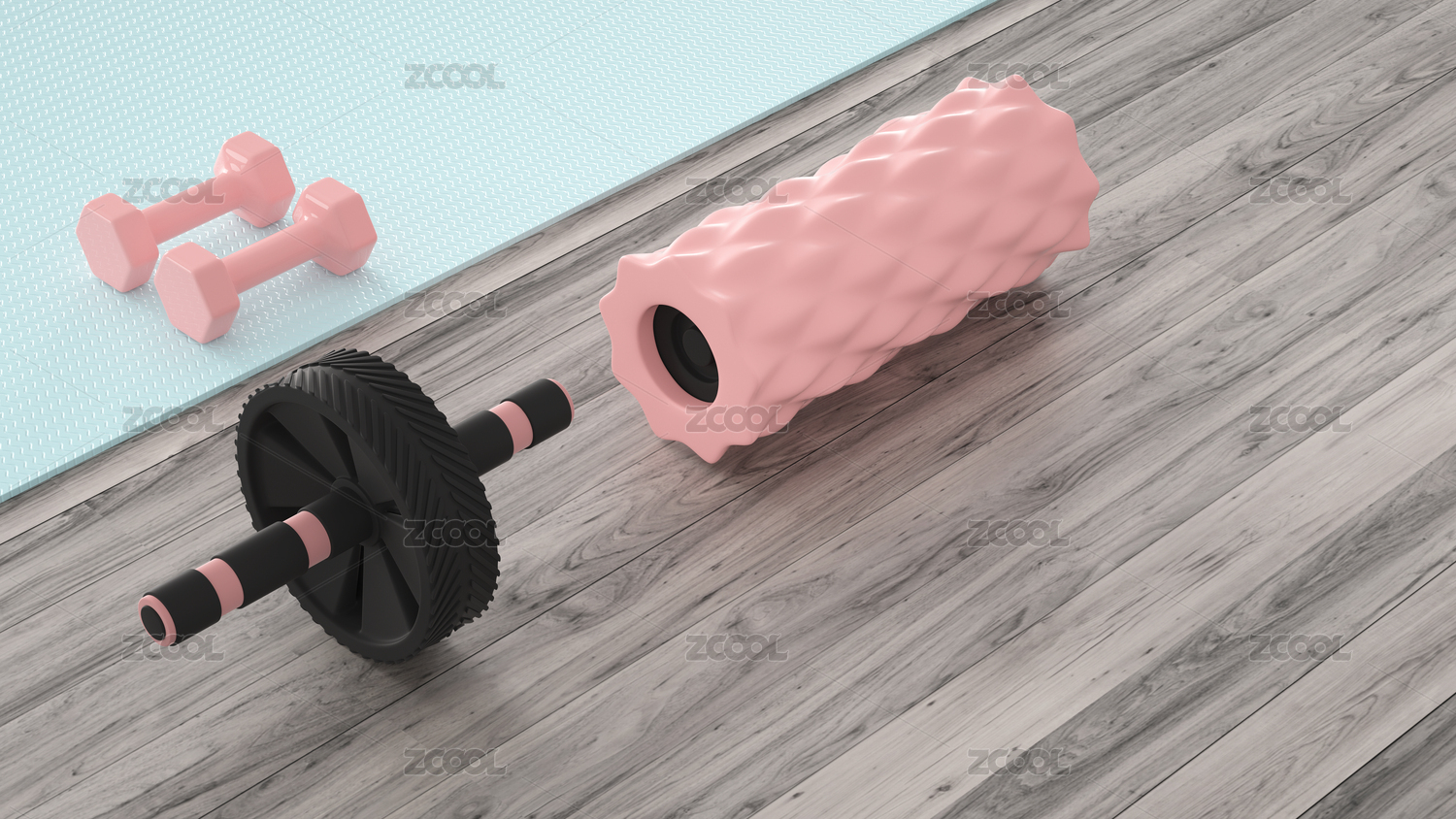 健身題材的木質(zhì)地板上的塑膠健腹輪,泡沫軸和瑜伽墊,3d渲染