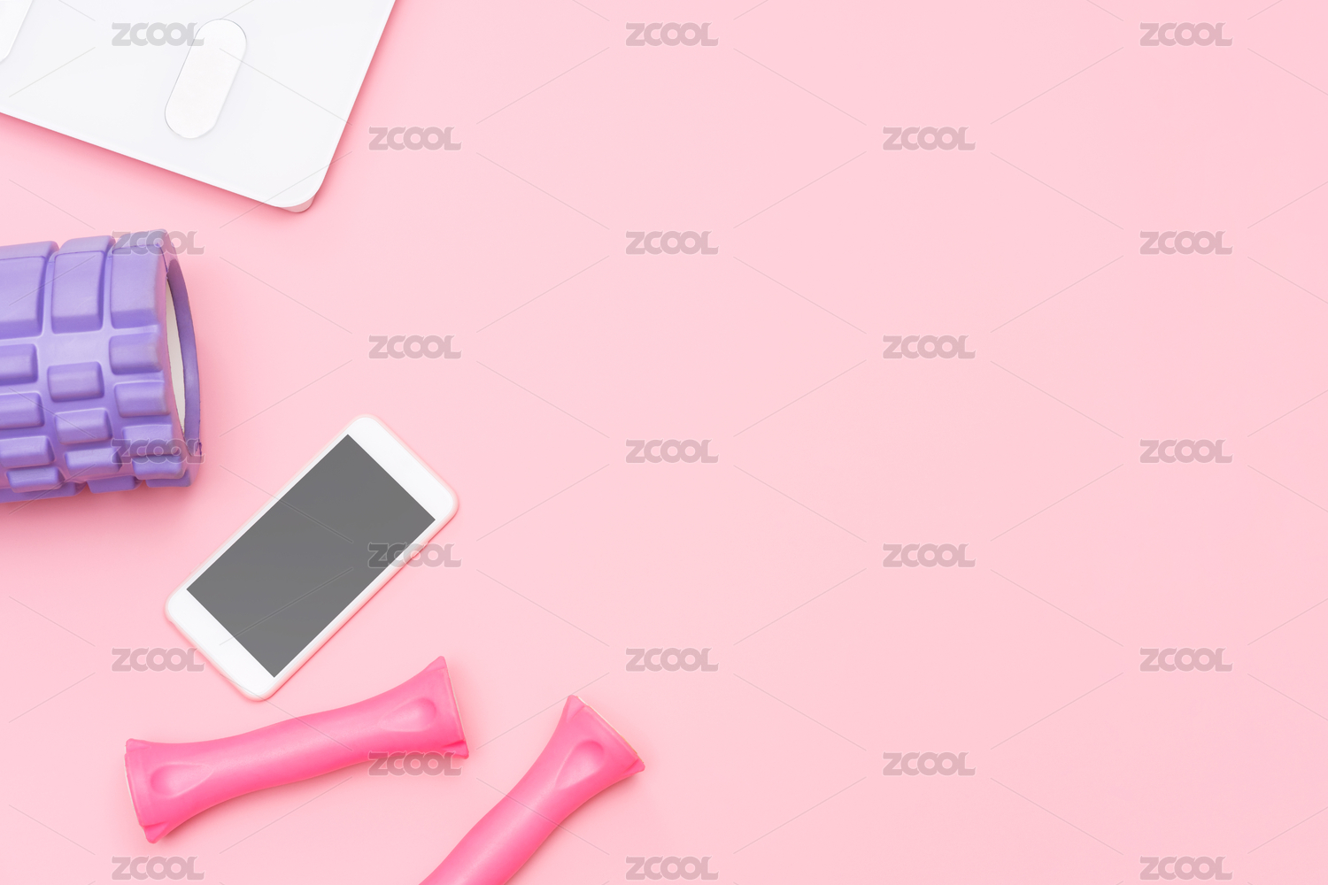 泡沫軸、啞鈴、手機和體重秤在粉色的背景上