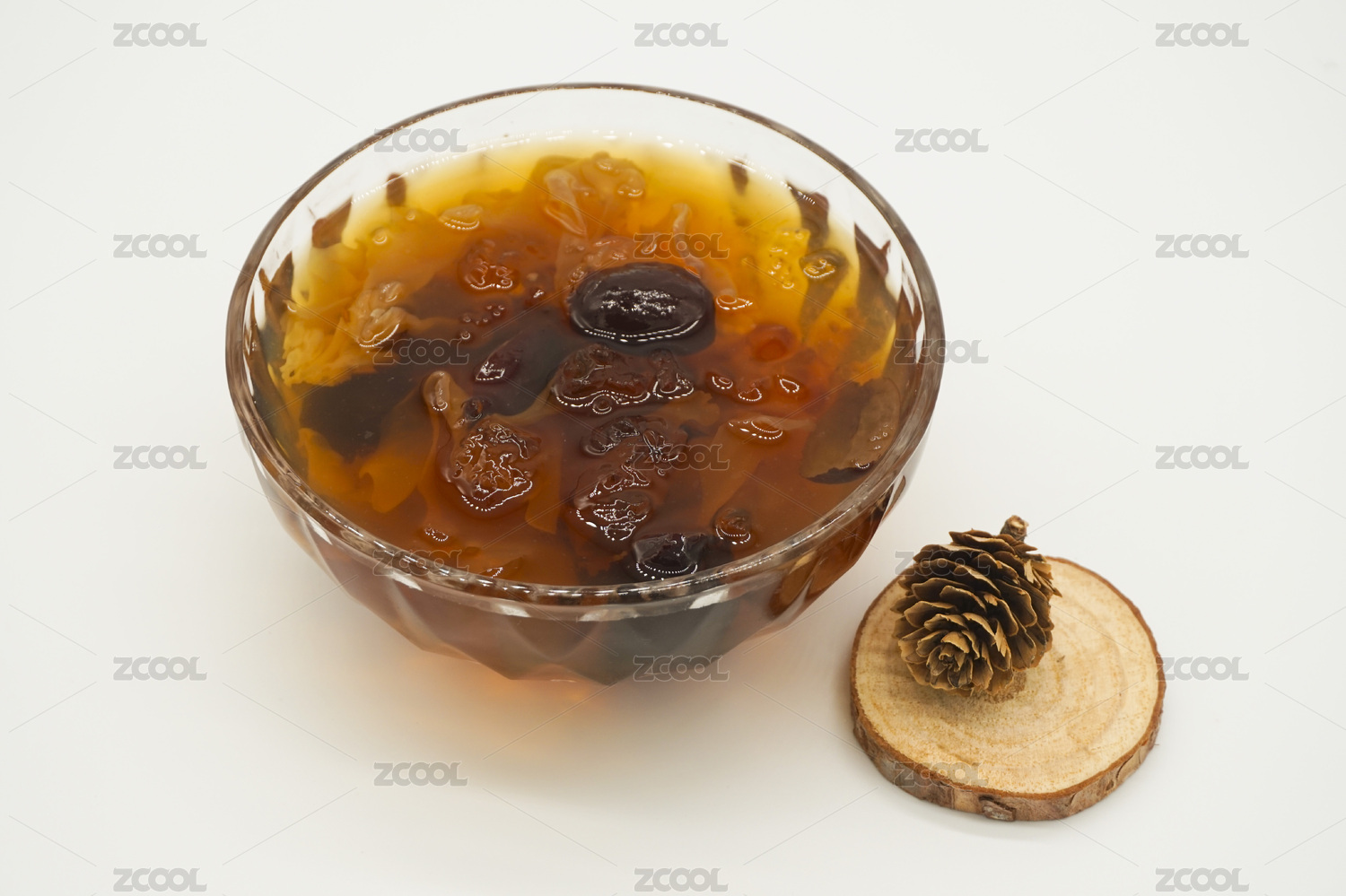 白色背景水晶碗中的桃膠銀耳甜品