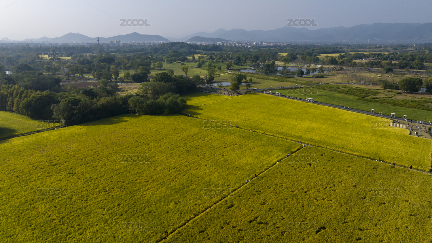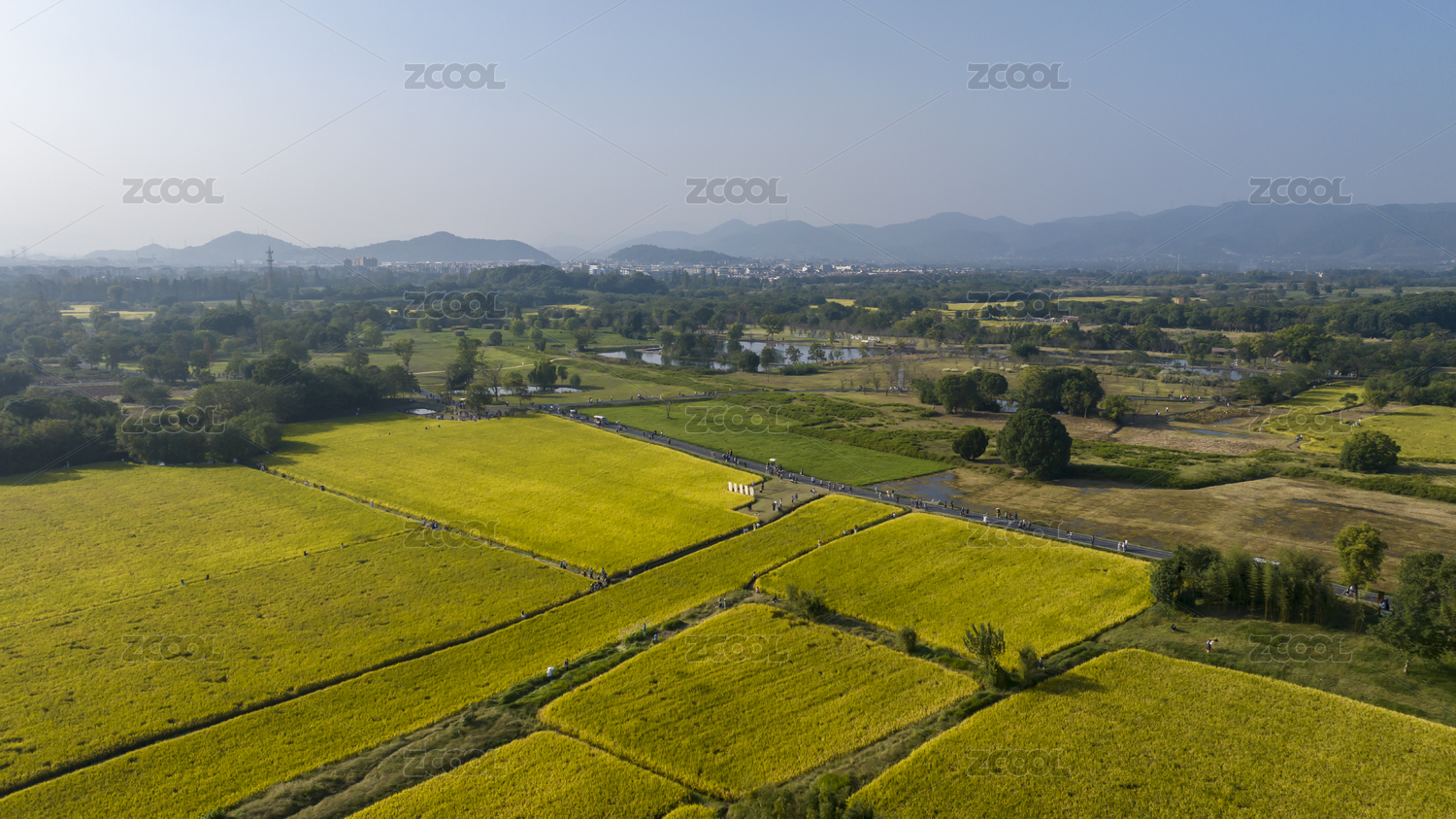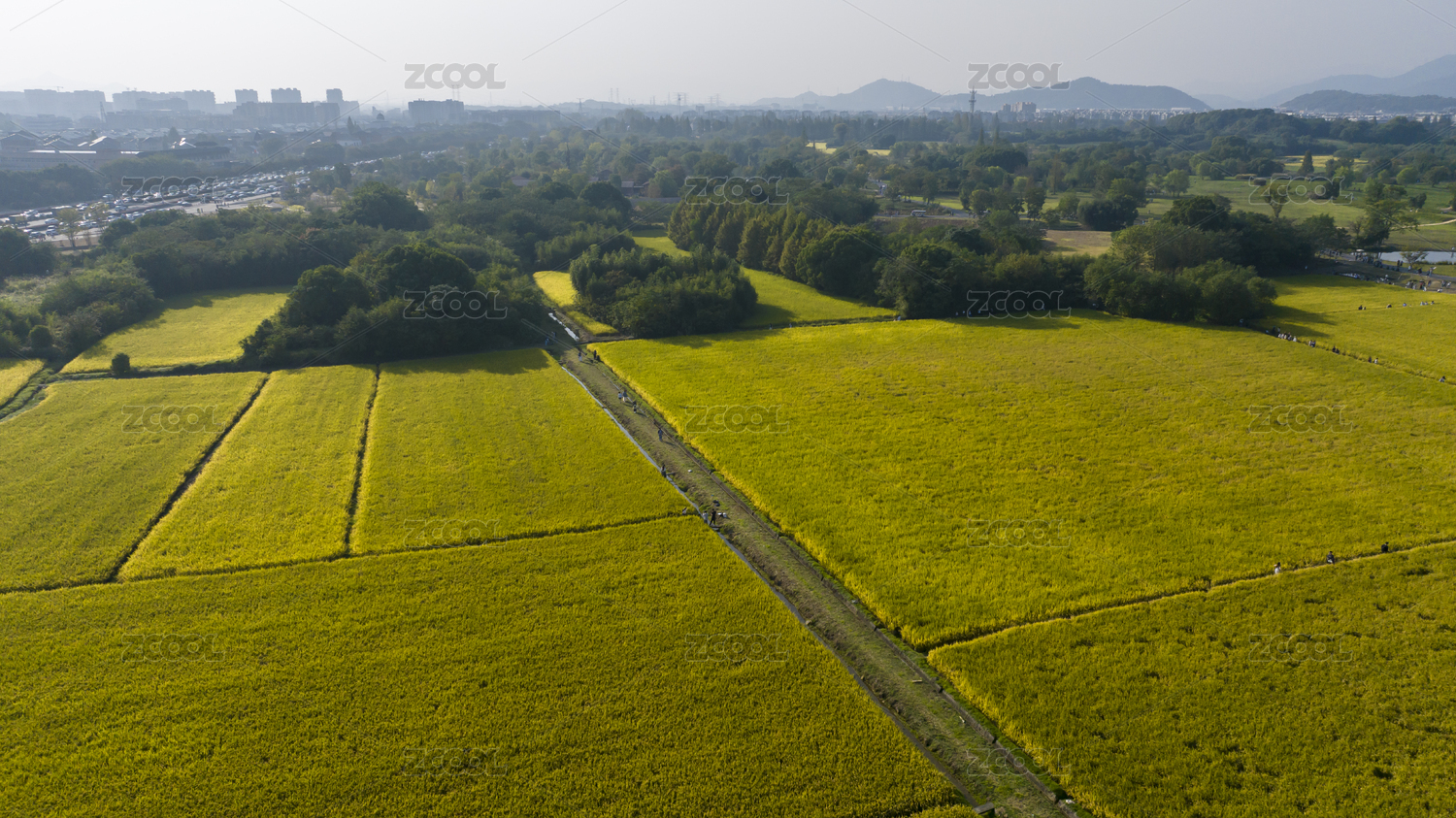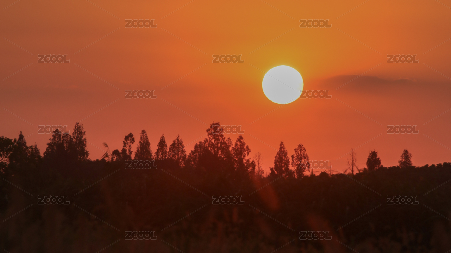 杭州良渚遺址公園夕陽下田野上的樹木和天空