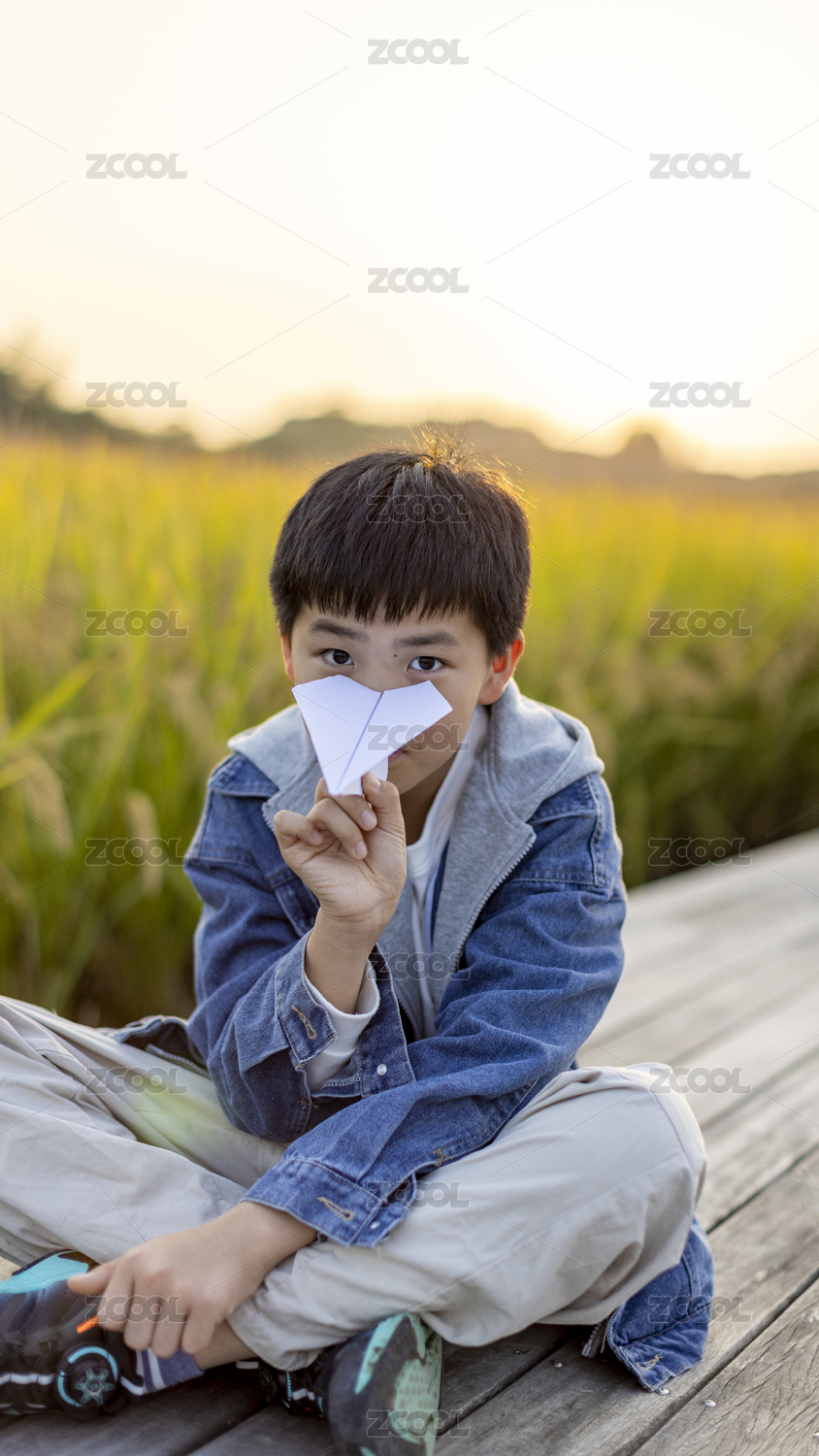 男孩在杭州良渚遺址公園稻田里玩紙飛機