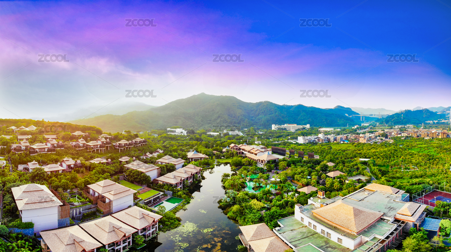 航拍廣州市從化區(qū)跑馬場(chǎng)下被植物環(huán)繞的建筑群