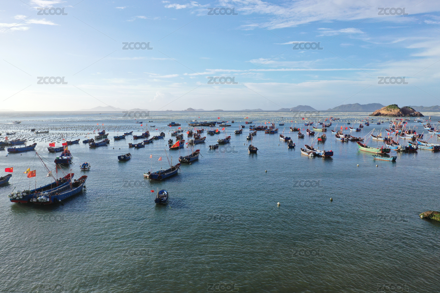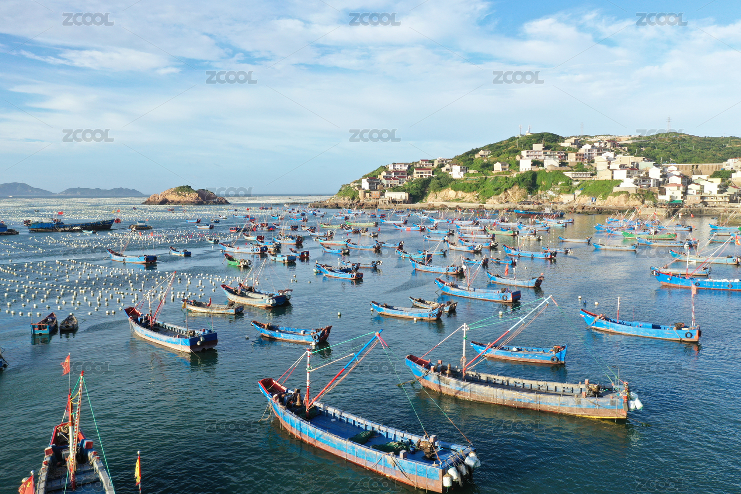 航拍的浙江嵊泗枸杞島旅游地標(biāo)風(fēng)光——??繚O船的海上牧場(chǎng)