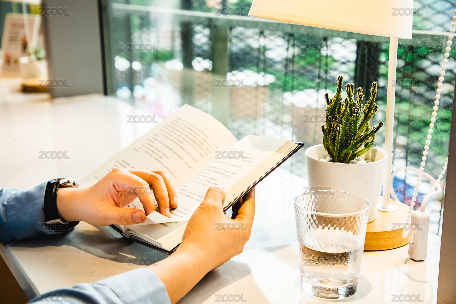 女性坐在落地窗邊大理石長(zhǎng)桌上翻開書閱讀,桌上放著臺(tái)燈仙人掌花茶等