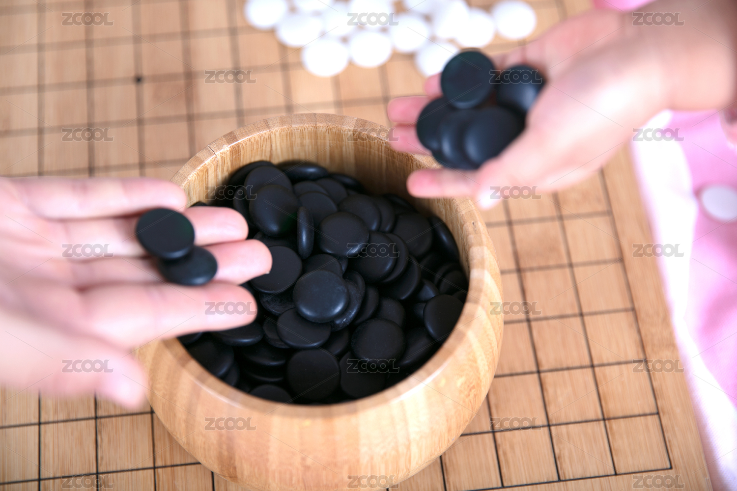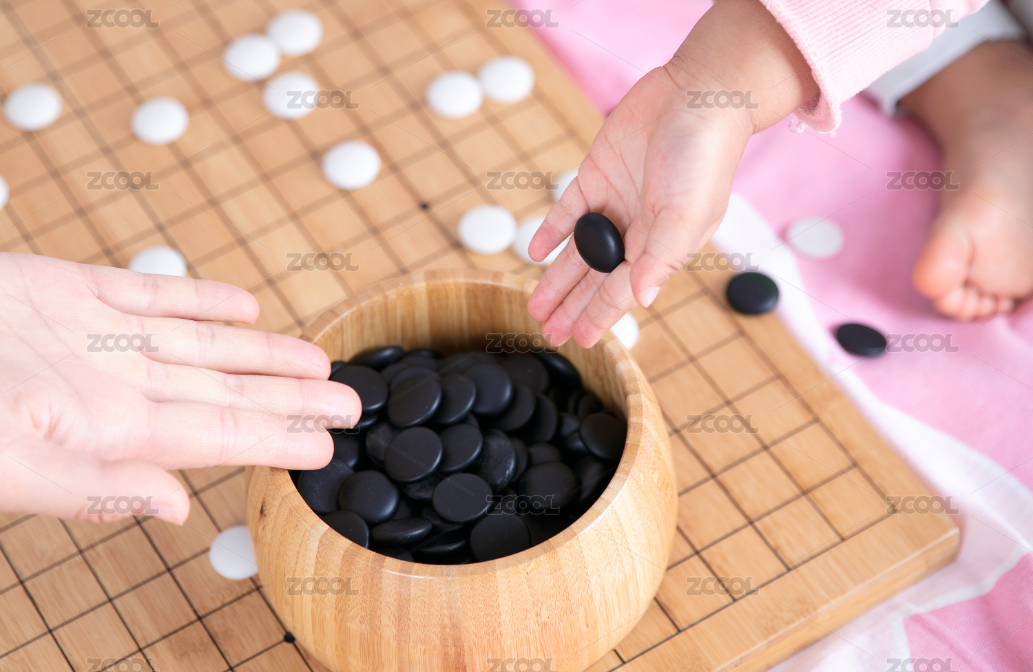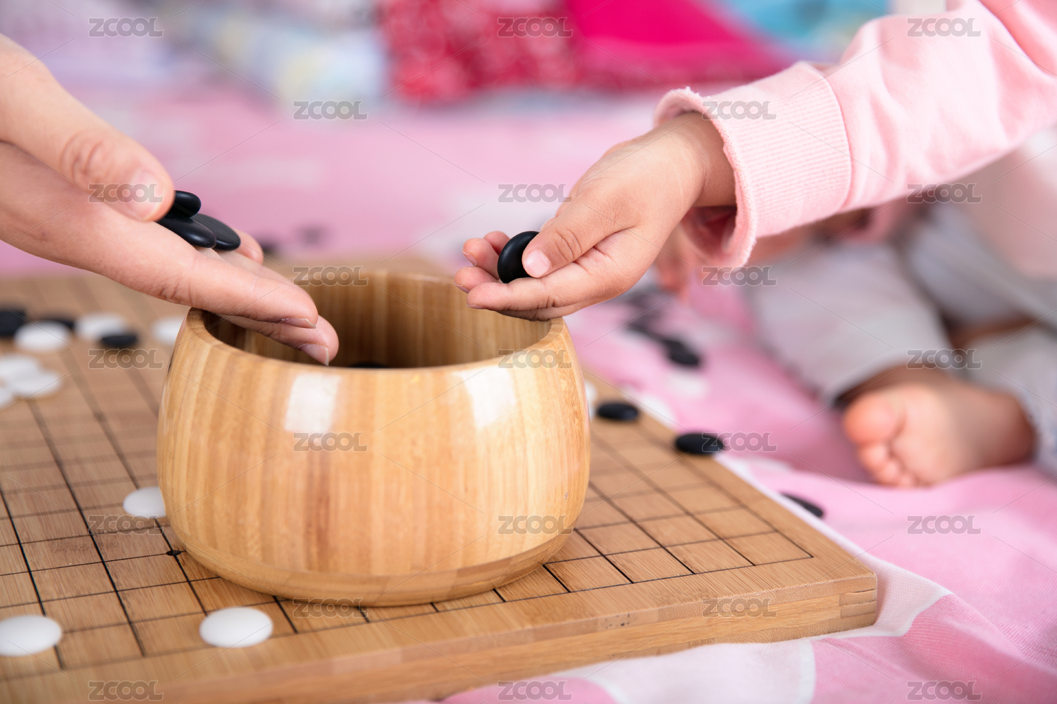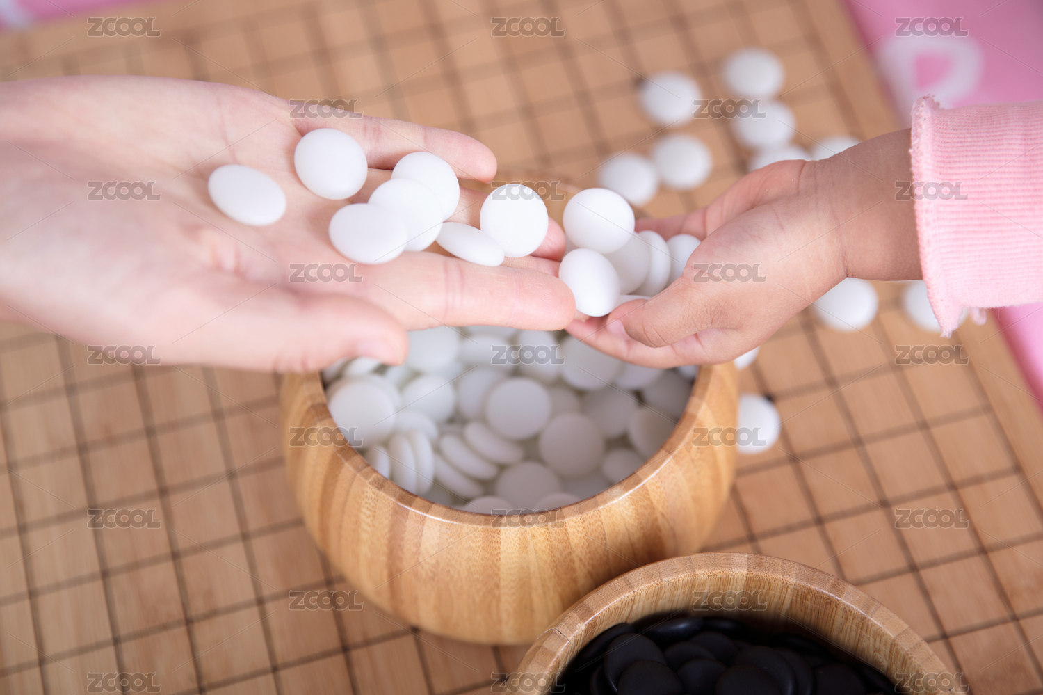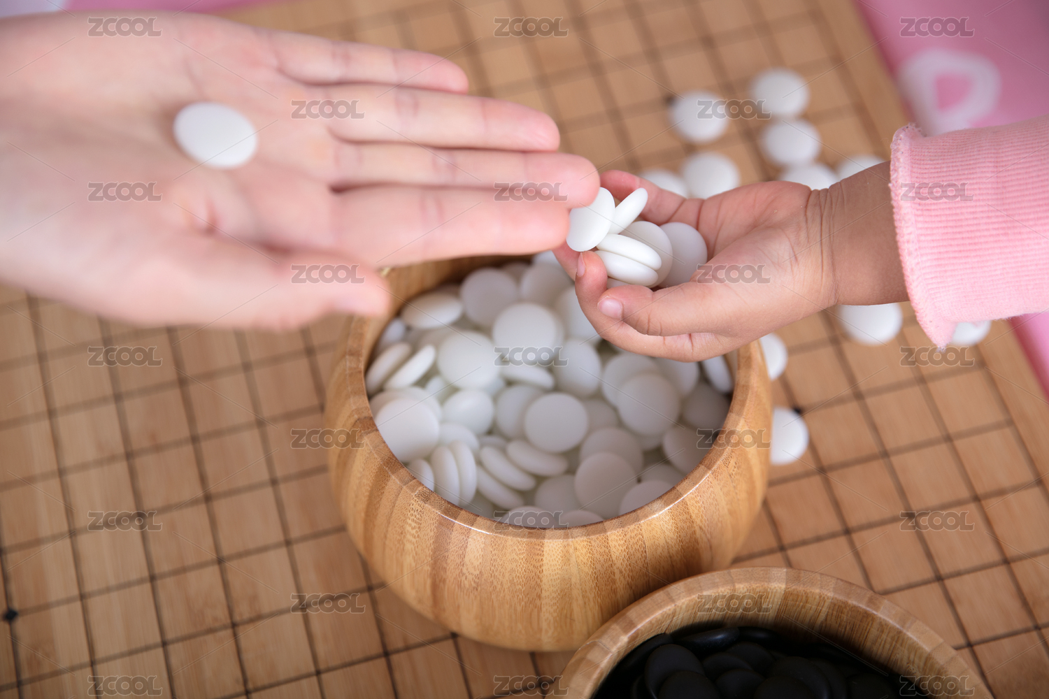 棋局上一只成年人的手和一只孩子的手同時(shí)把棋子放進(jìn)棋盒里