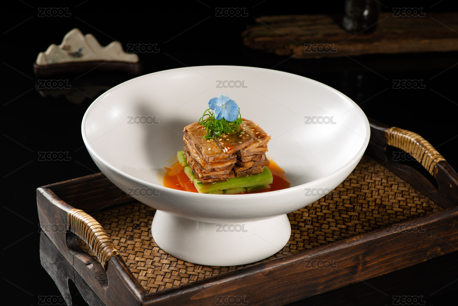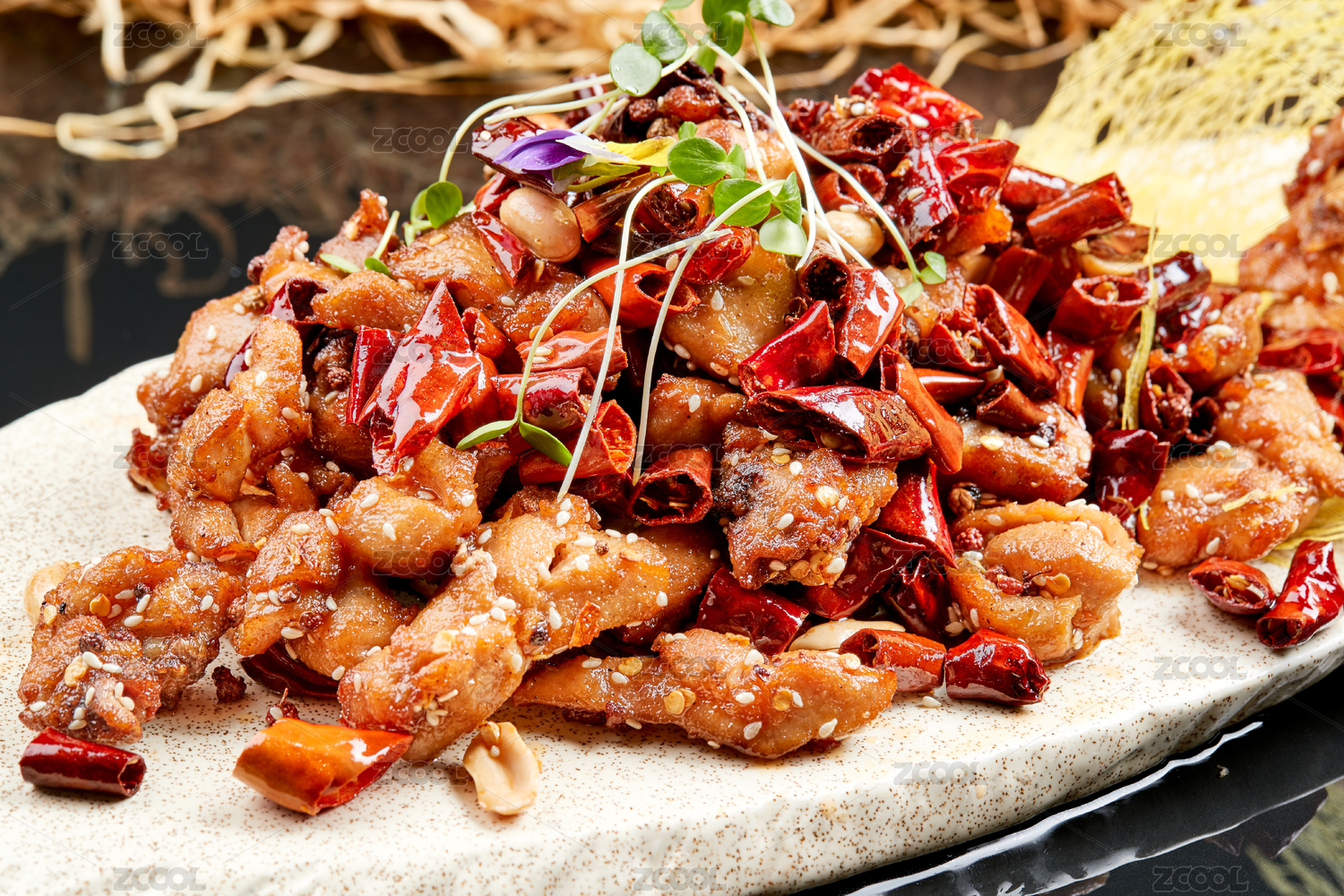 精美餐具裝的香辣豆苗雞腿肉