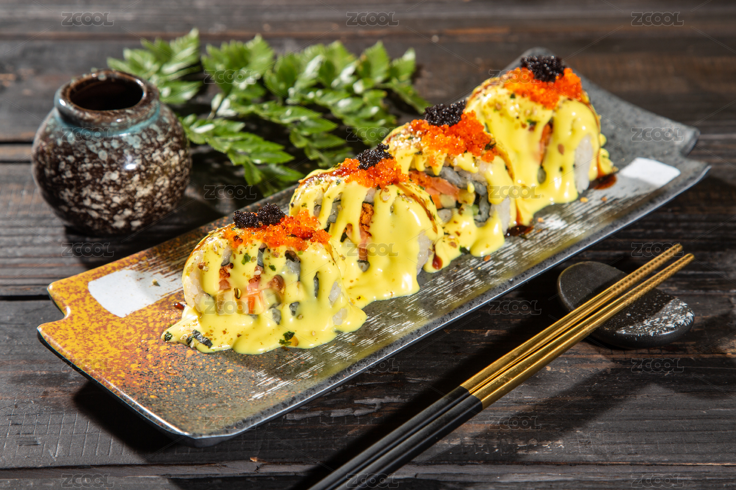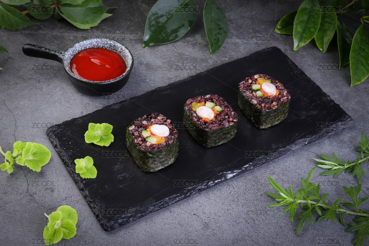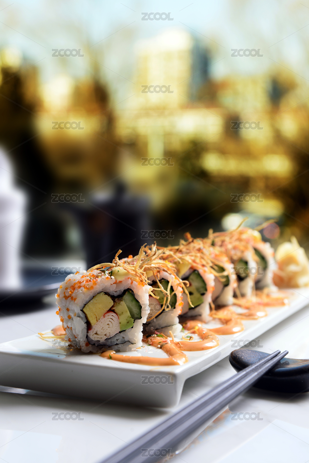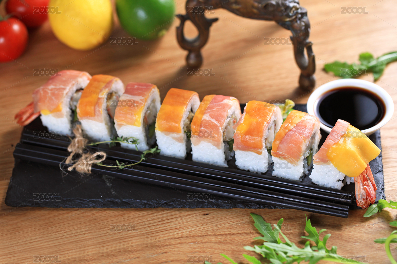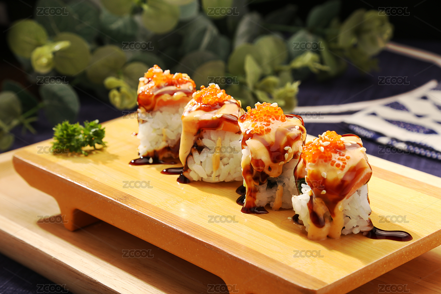 原木色壽司臺上的一排壽司卷,配著綠植餐巾