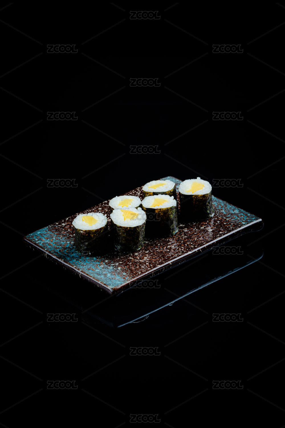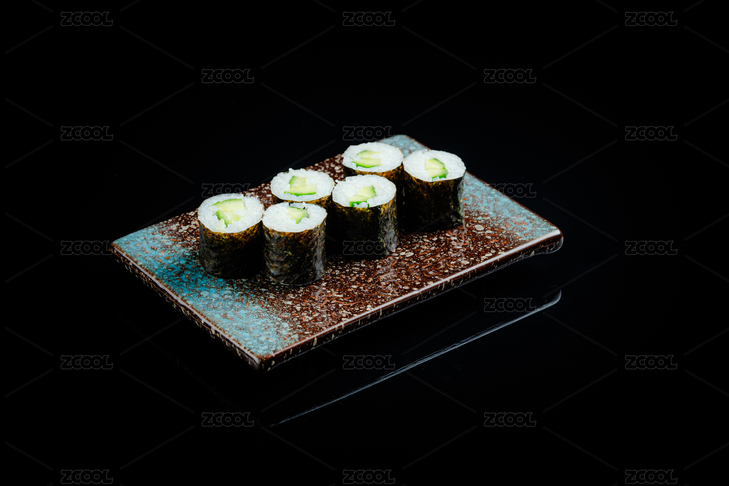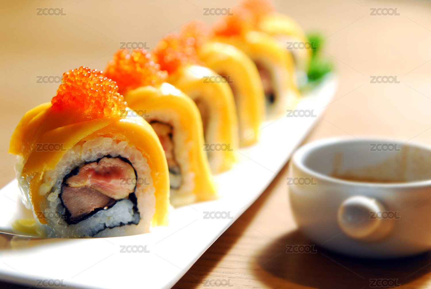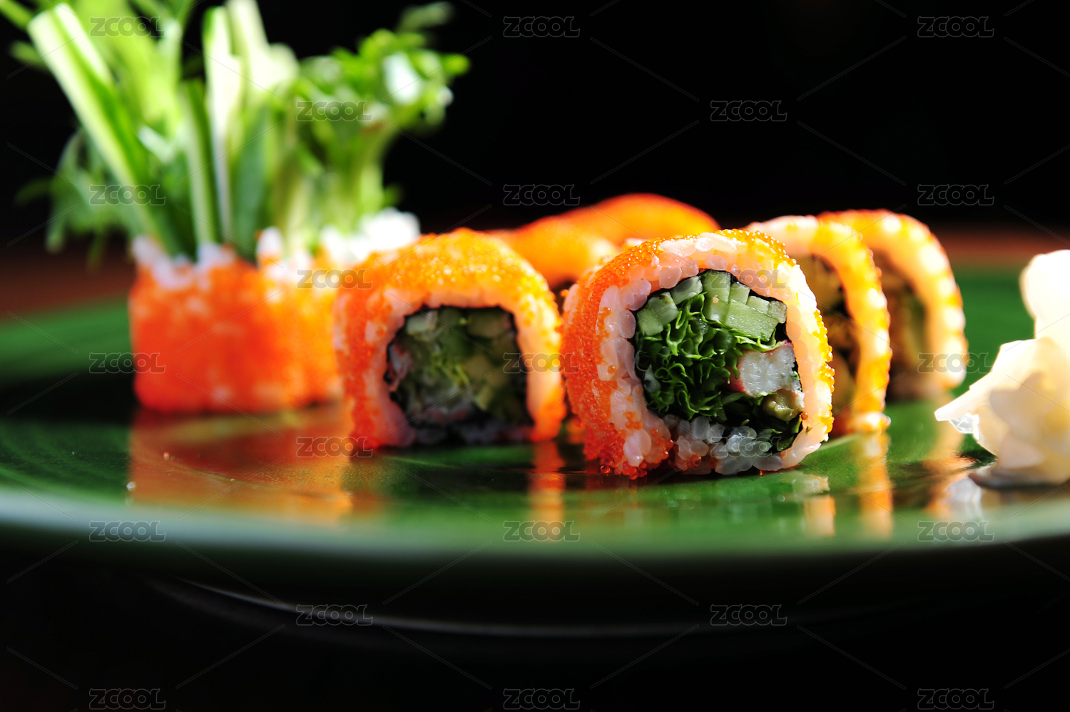 原木色壽司臺上的一排壽司卷,配著綠植餐巾