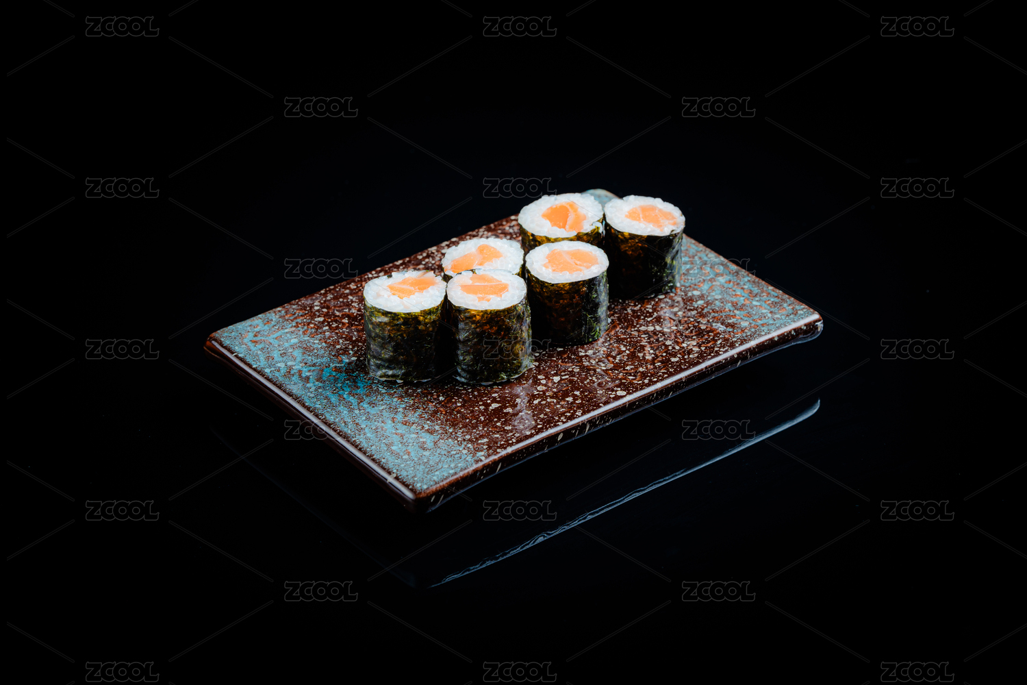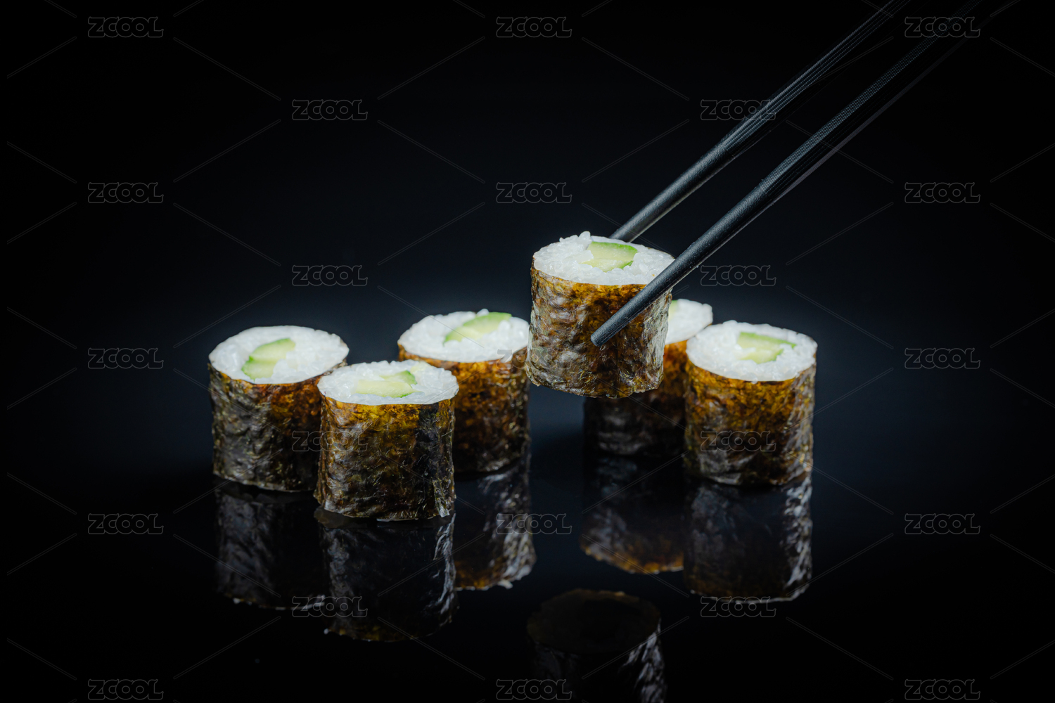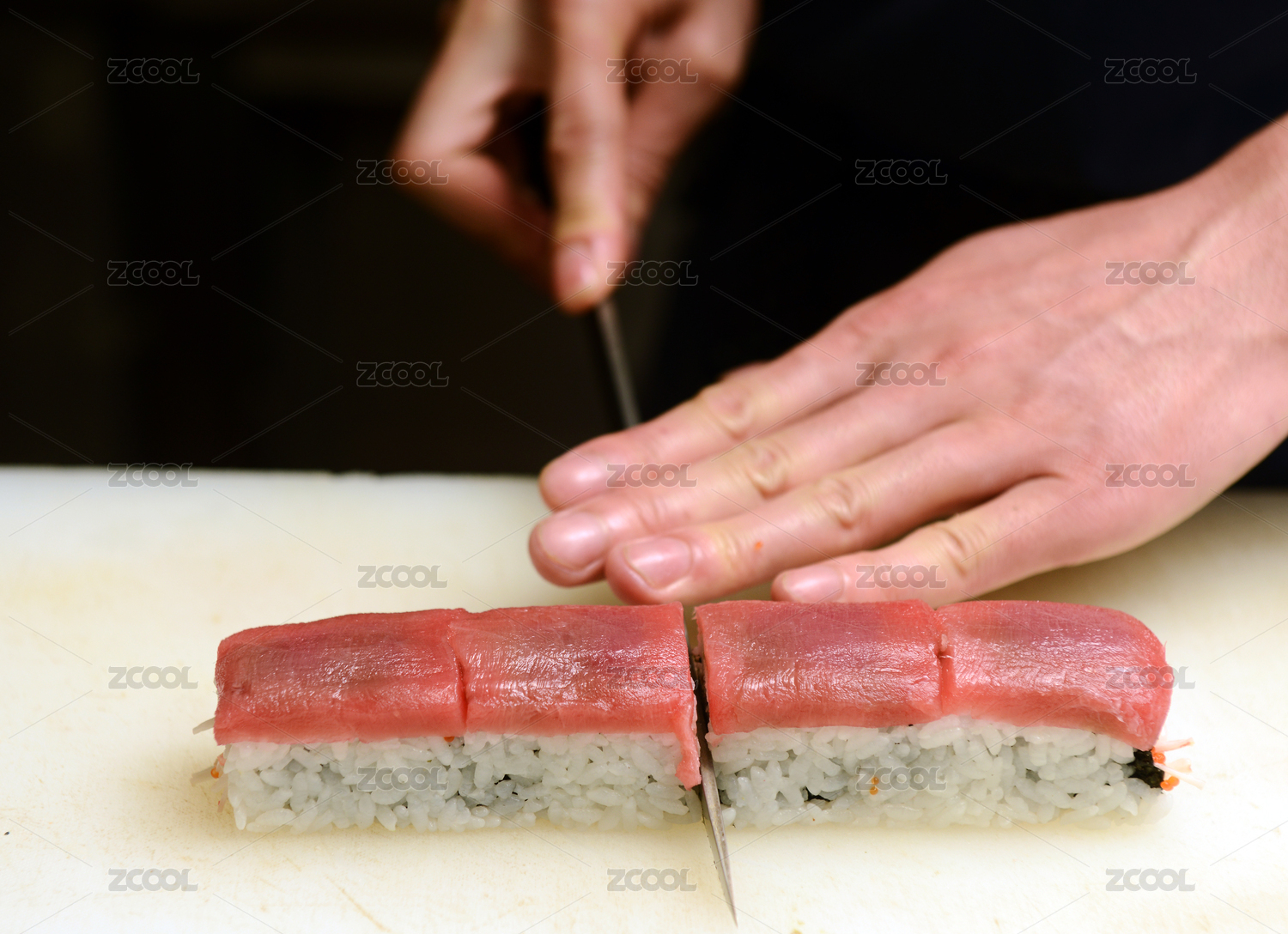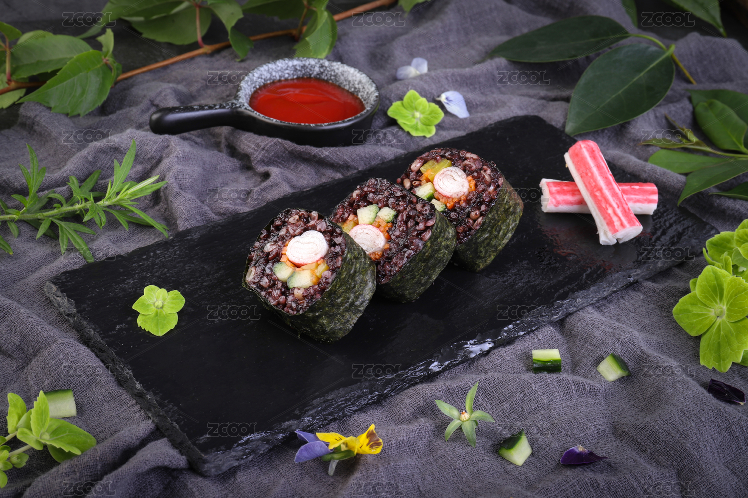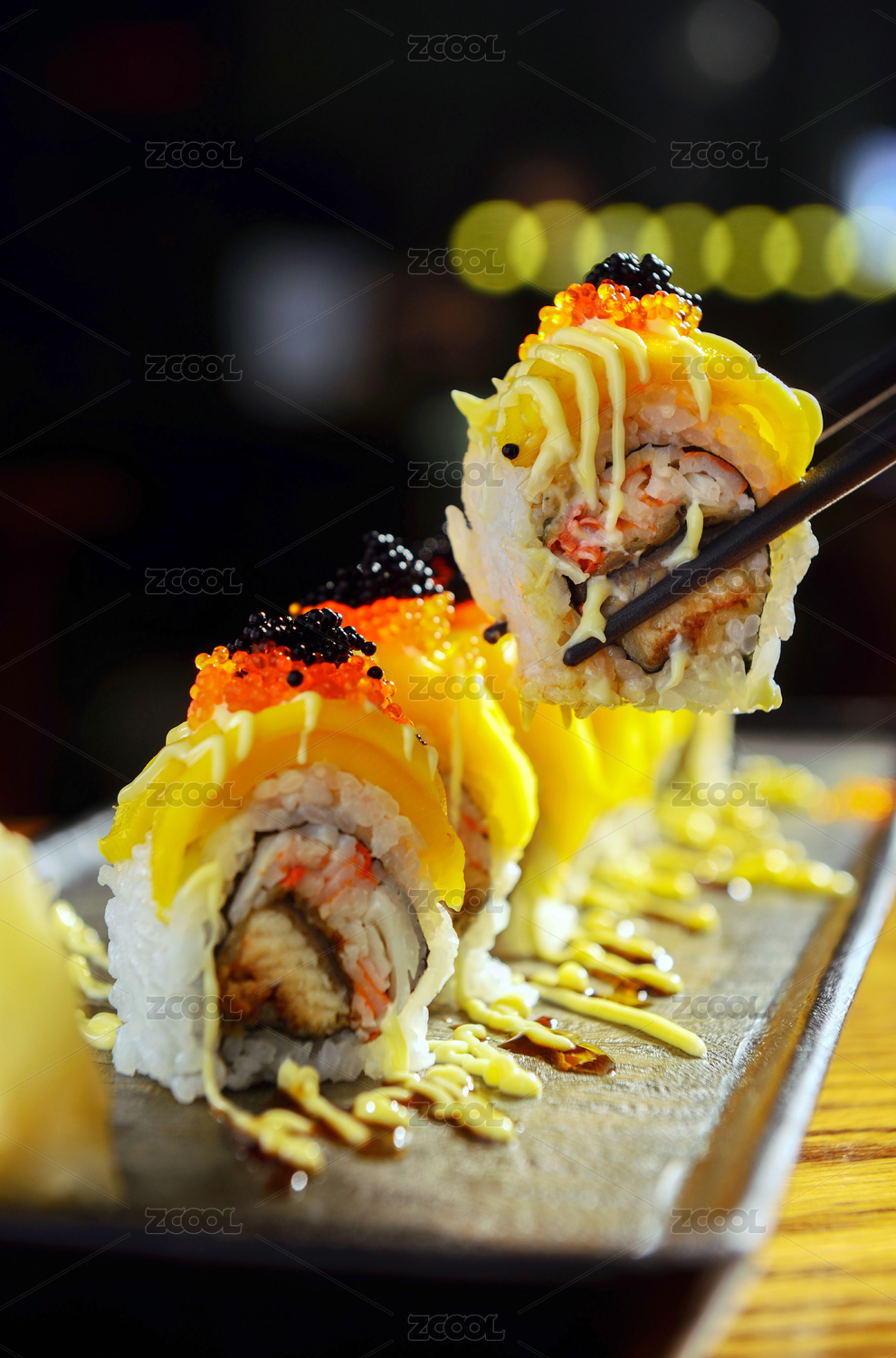 原木色壽司臺上的一排壽司卷,配著綠植餐巾