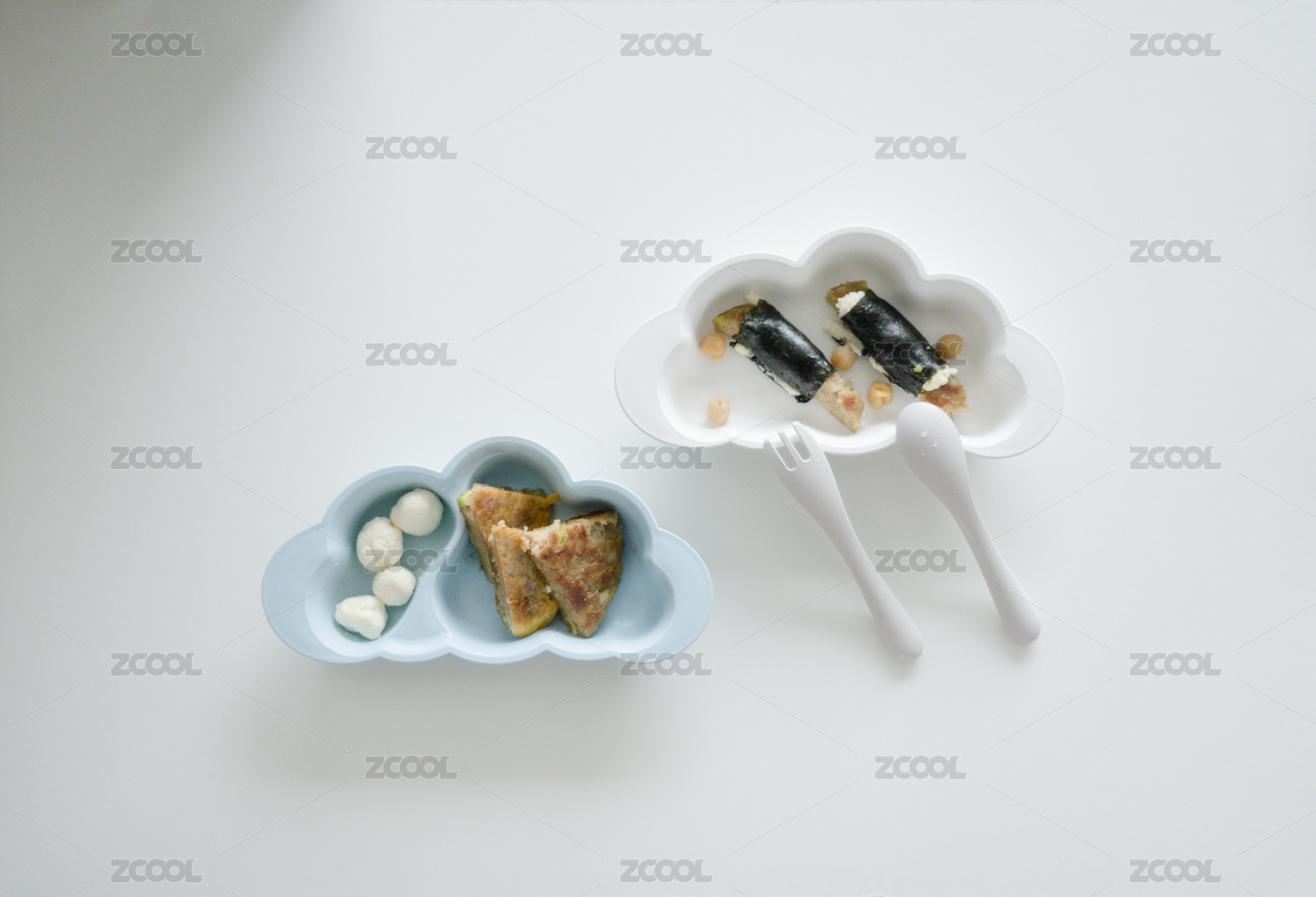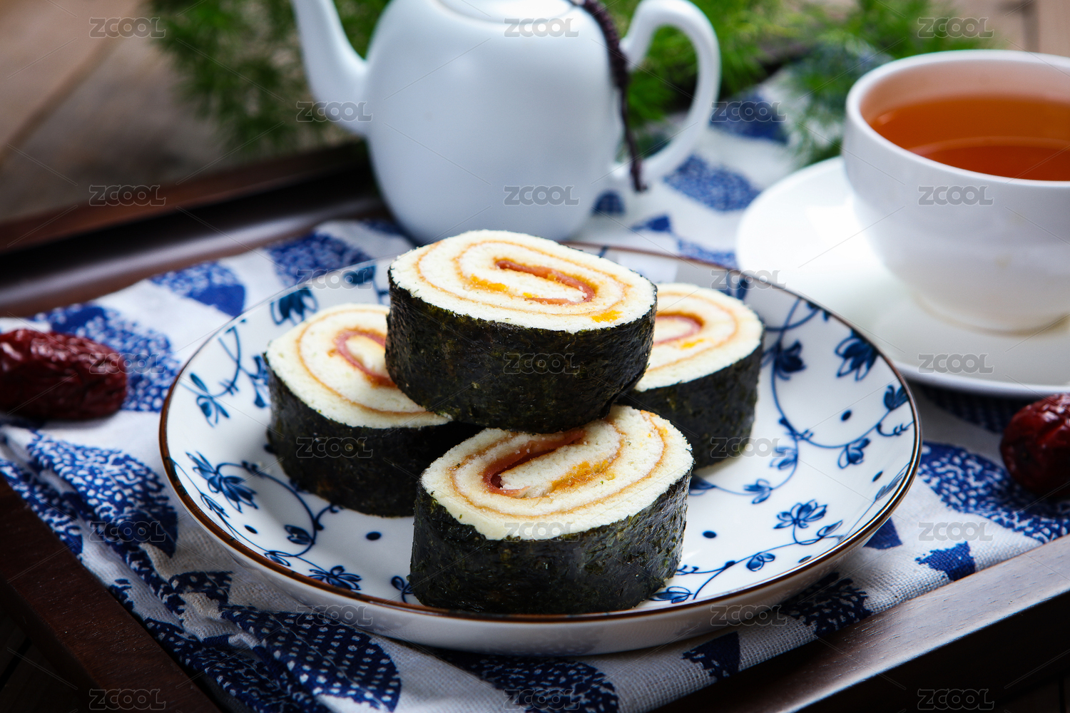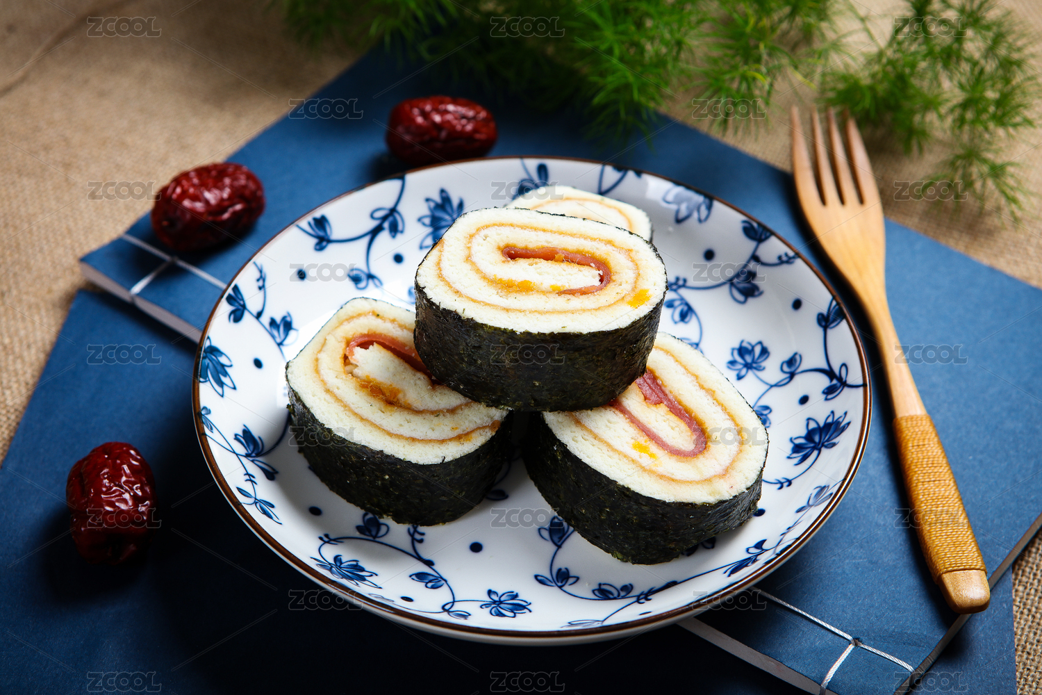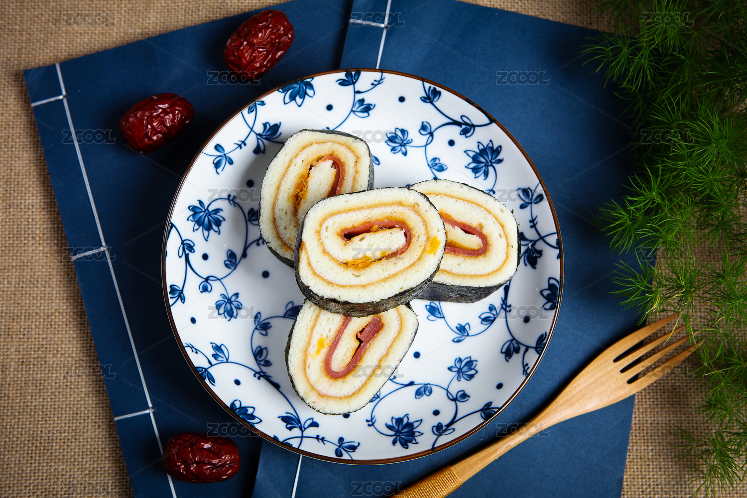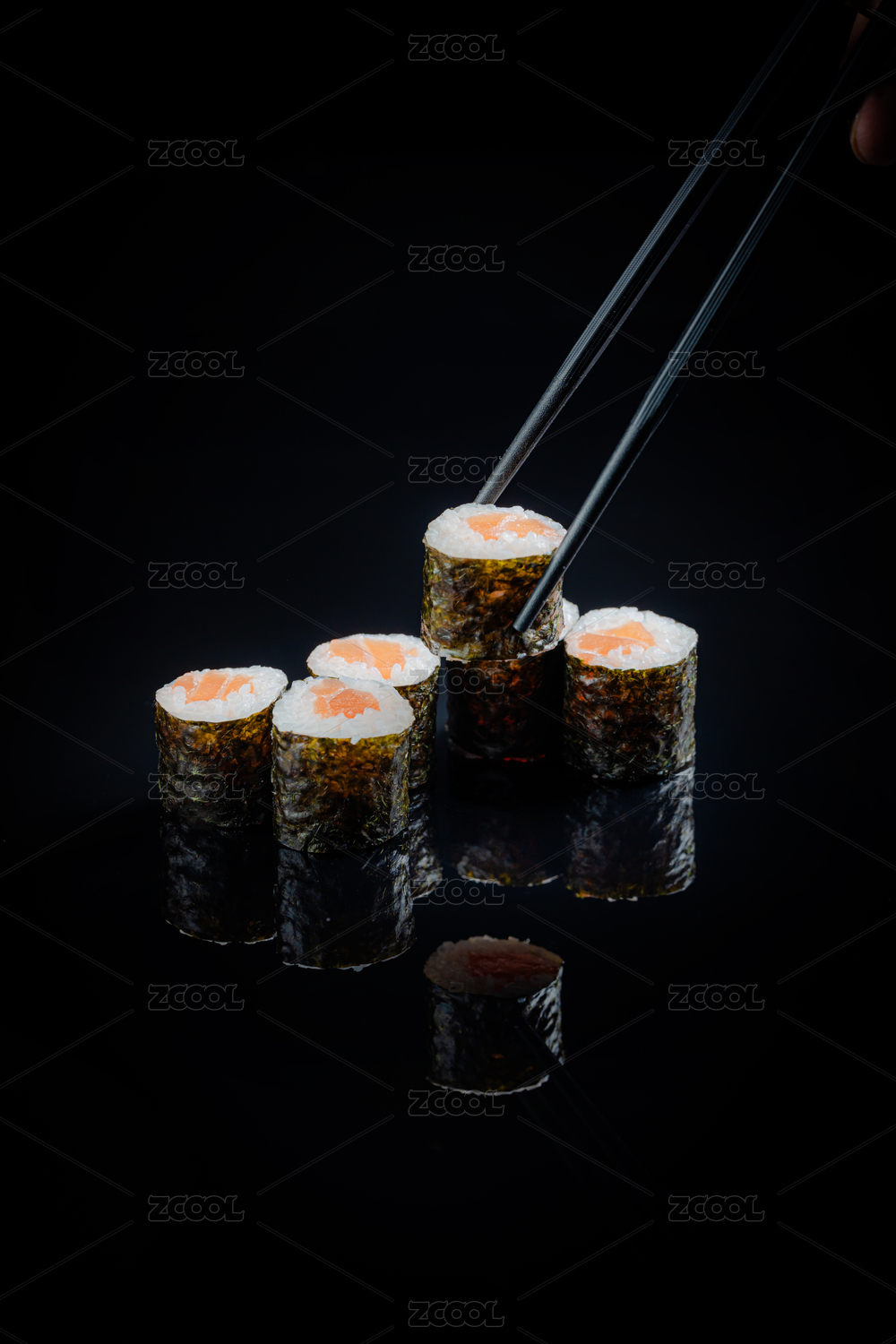 原木色壽司臺上的一排壽司卷,配著綠植餐巾