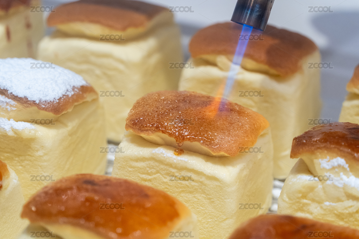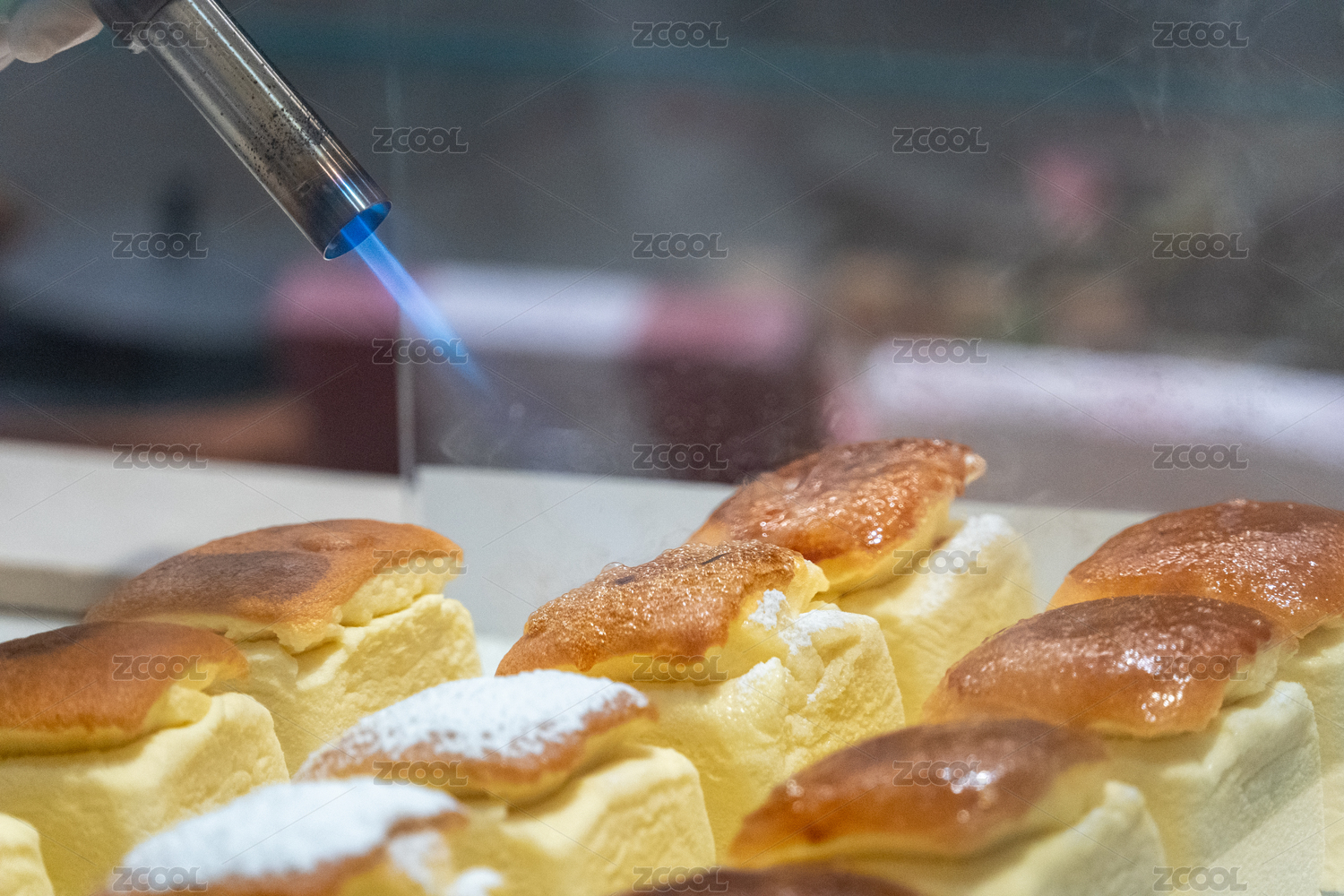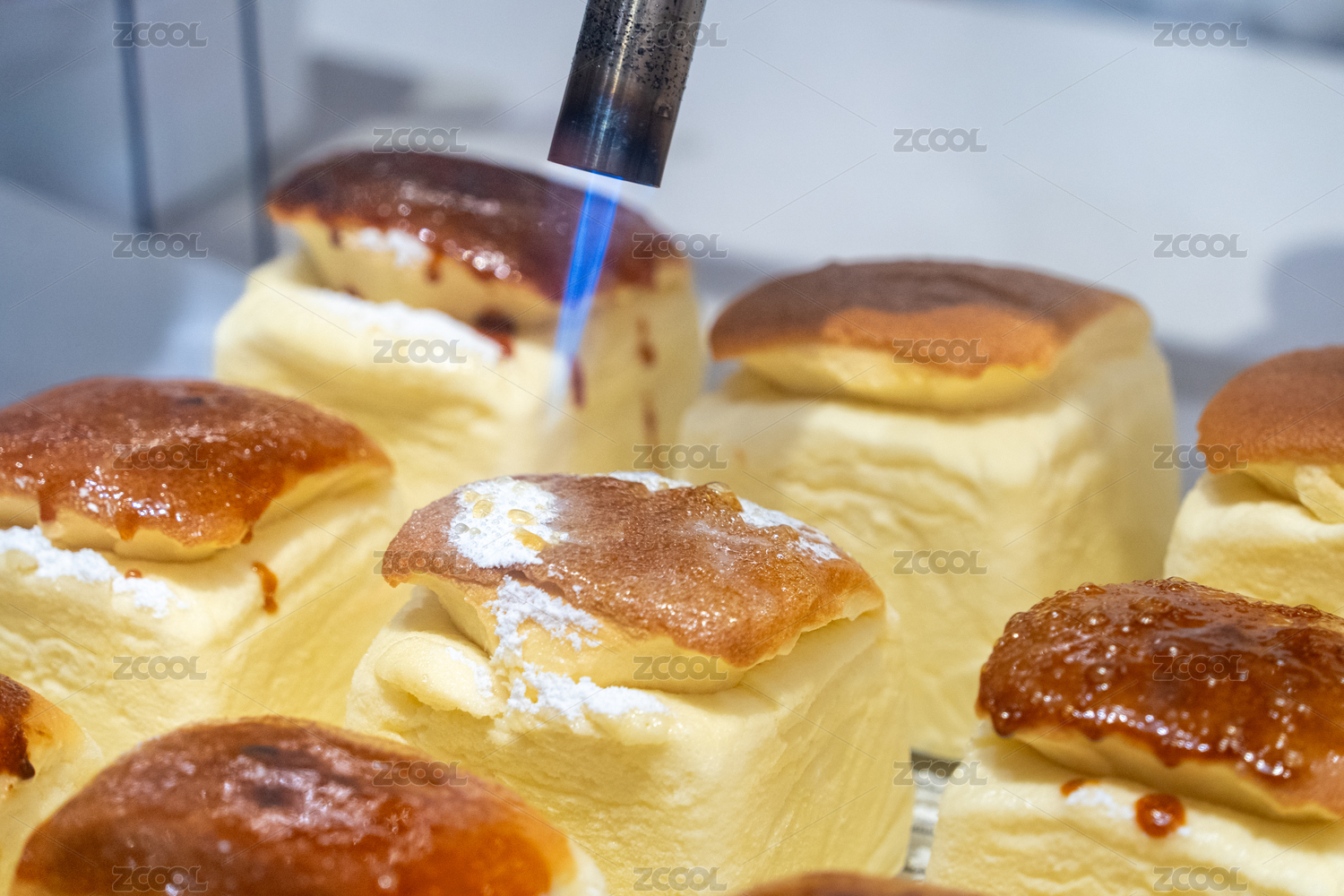 廚師用噴槍為日式芝士蛋糕頂部焦糖化