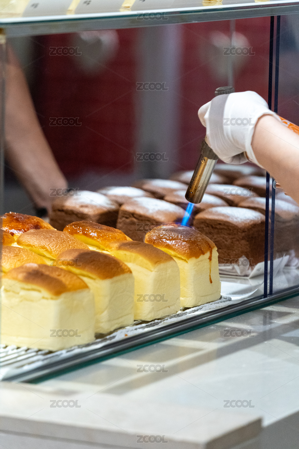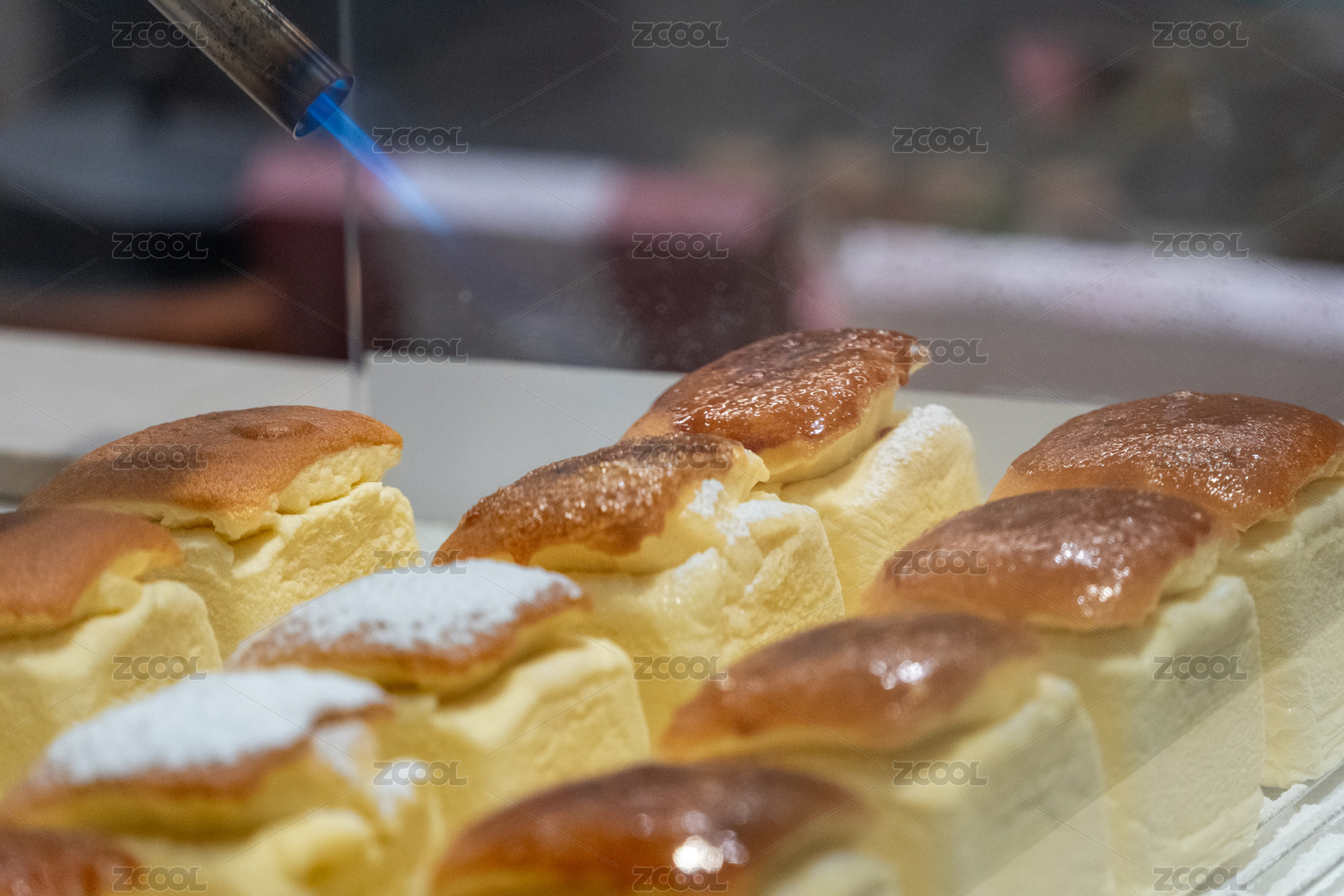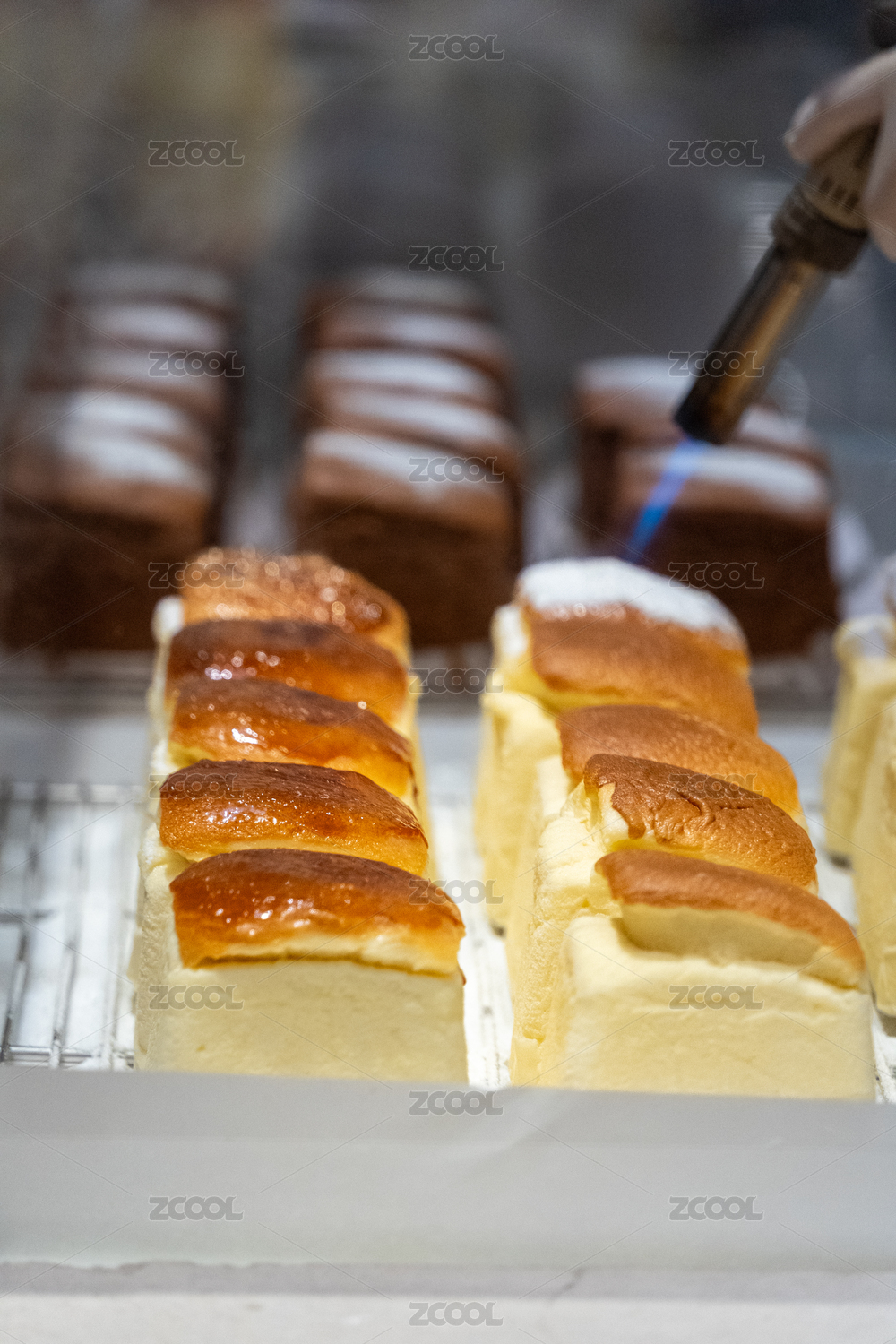 廚師用噴槍為日式芝士蛋糕頂部焦糖化