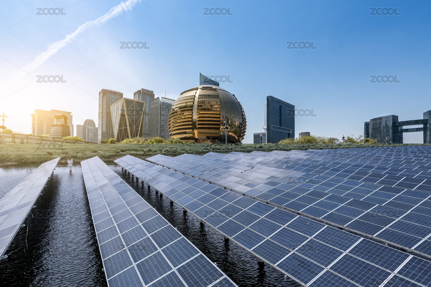 城市天際線與太陽能板