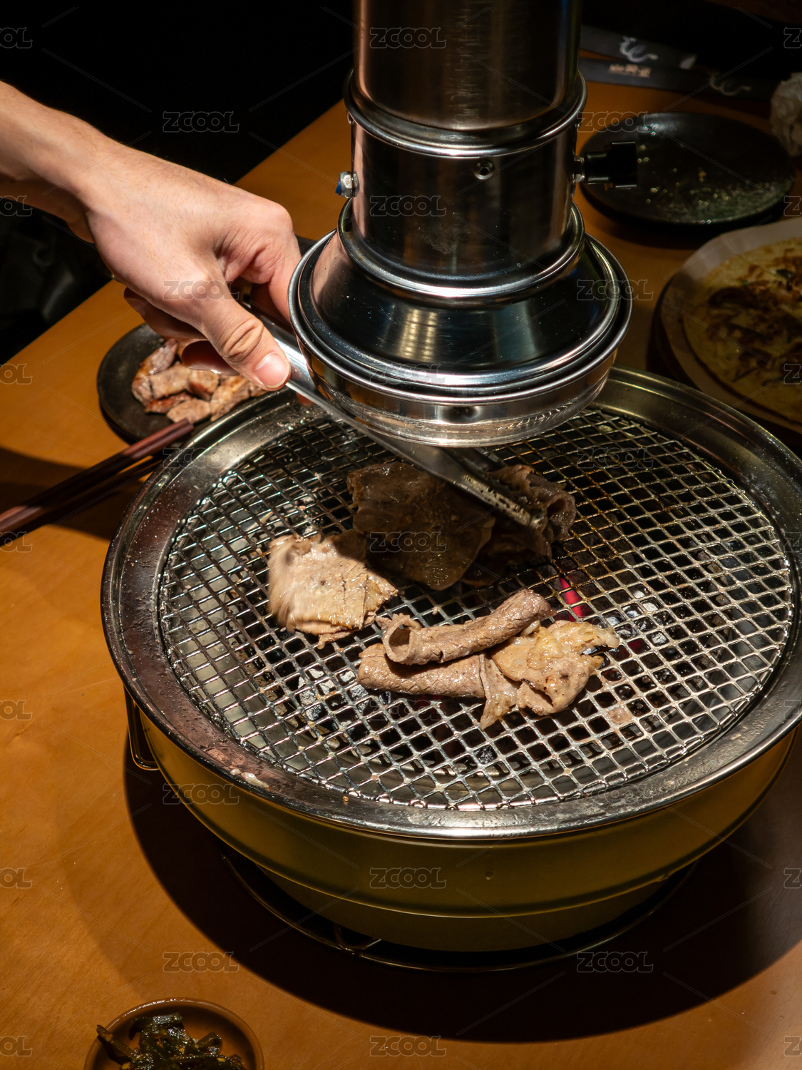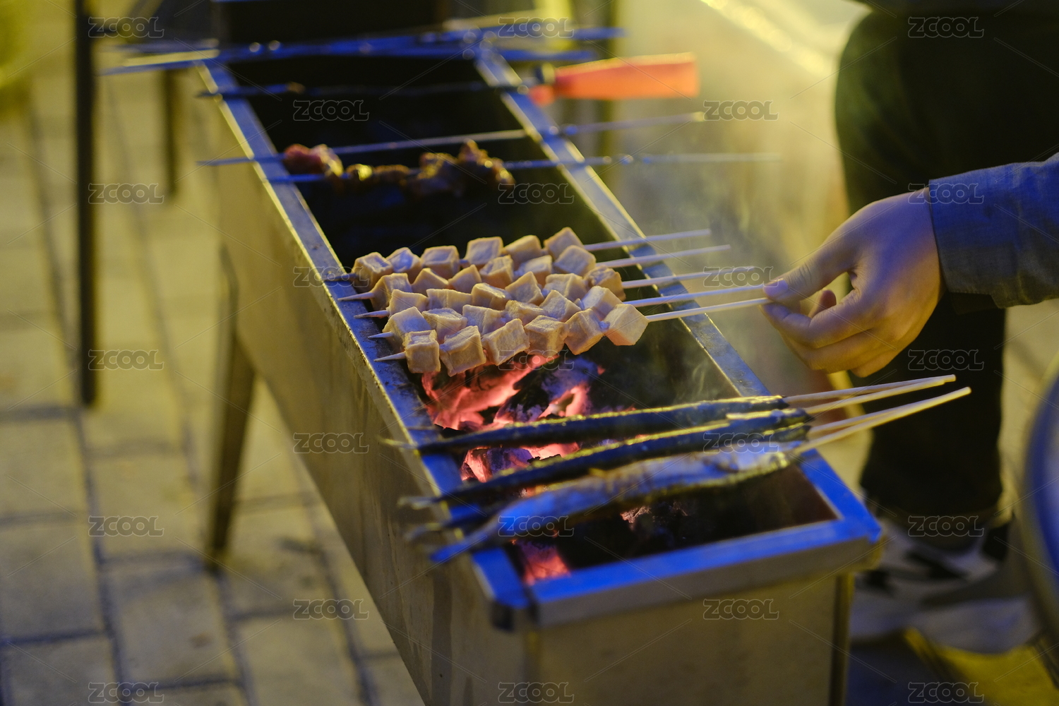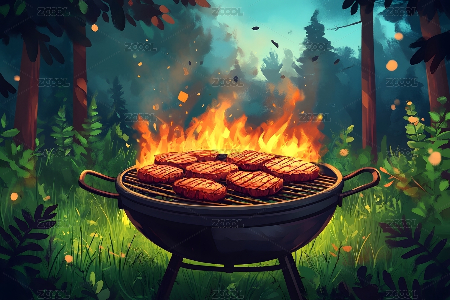 噴槍火焰炙烤網(wǎng)架上的撒粉雪花肥牛特寫