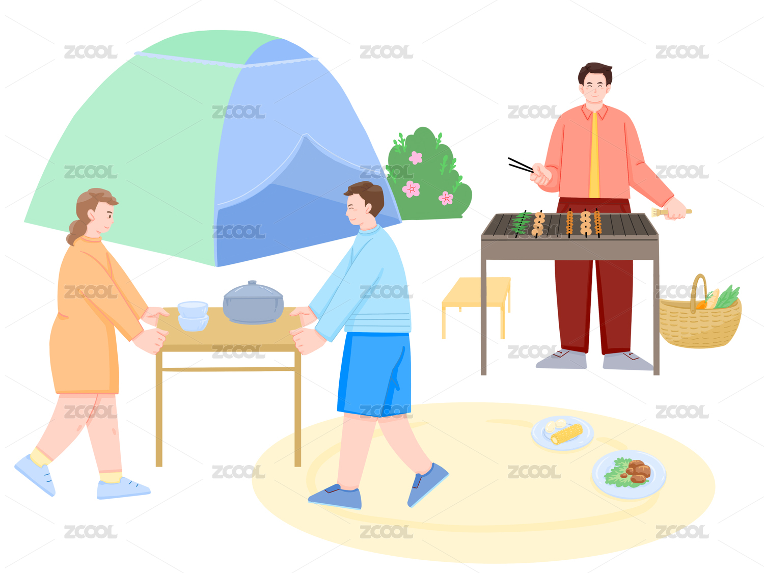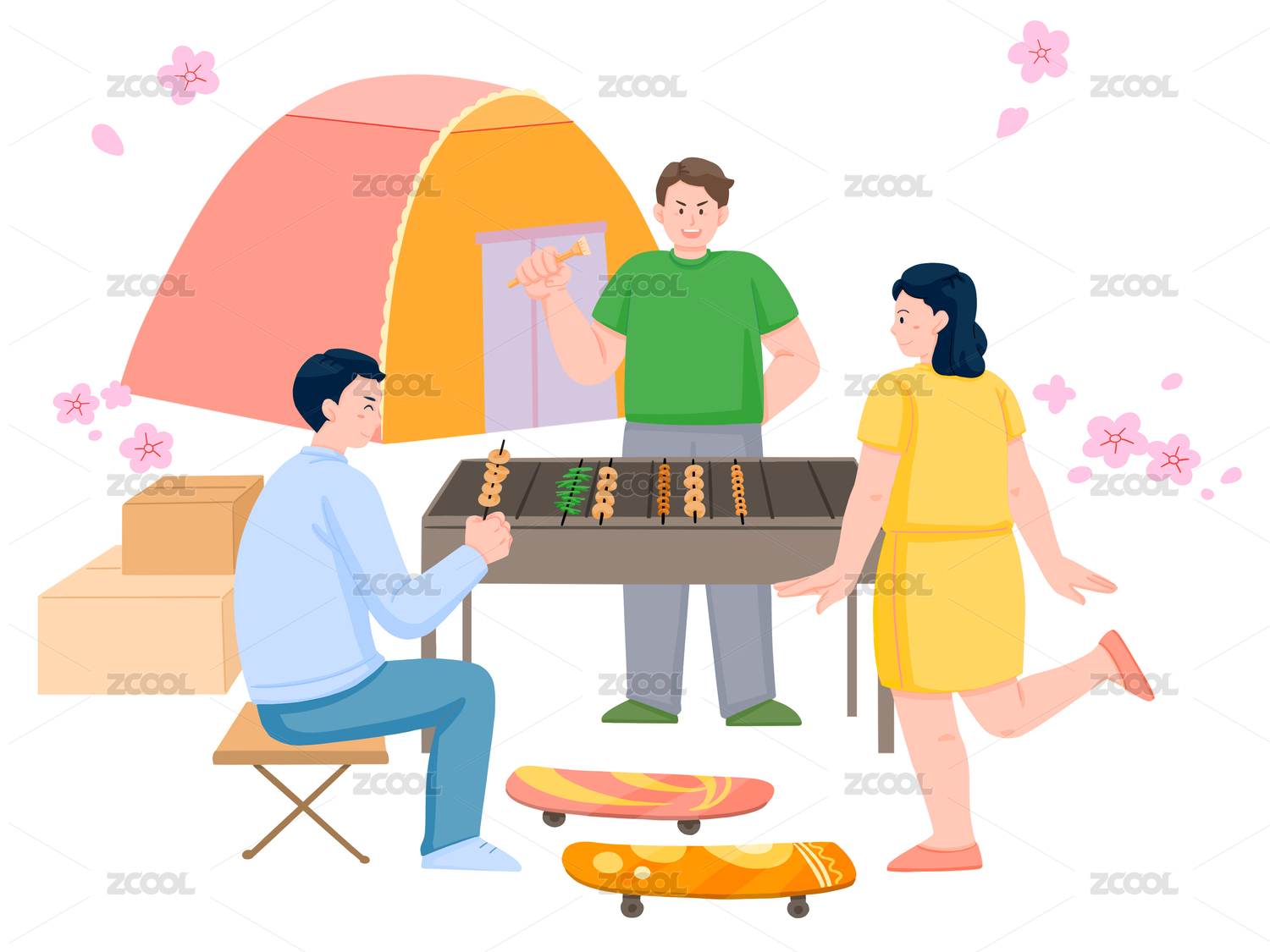 春天春游一群人燒烤游玩年輕人帳篷滑板車
