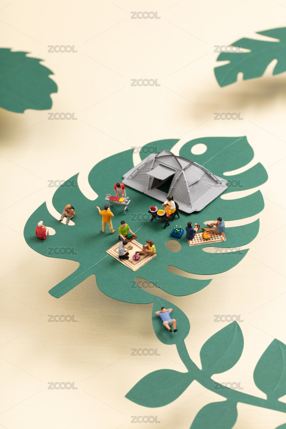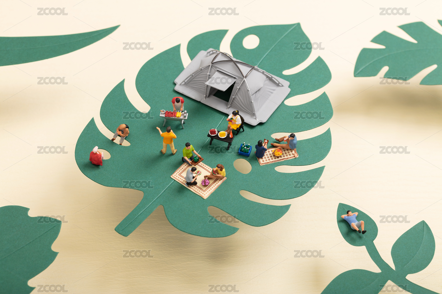 微縮創(chuàng)意在懸浮的葉子上露營燒烤的人群