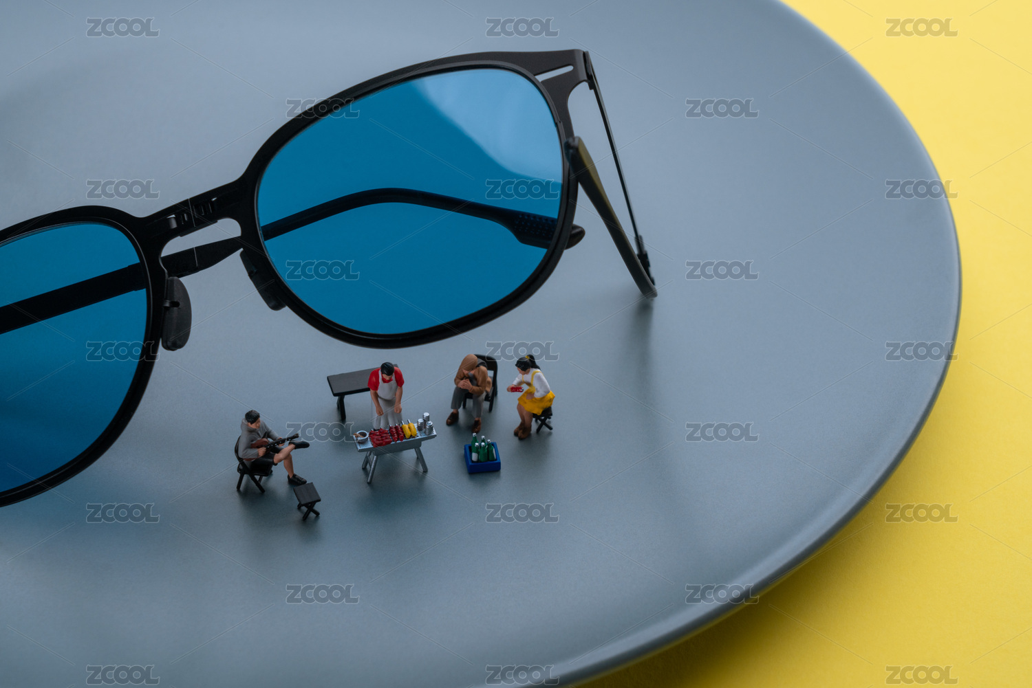 灰色盤子中幾個(gè)人在太陽鏡下燒烤微縮創(chuàng)意圖