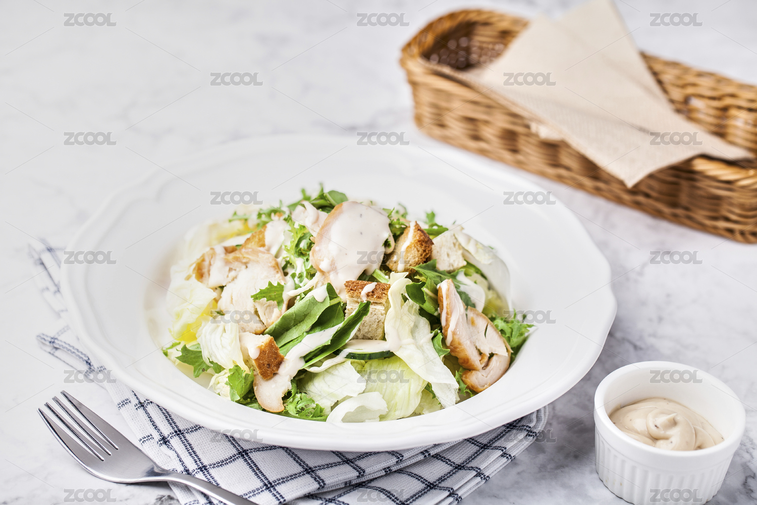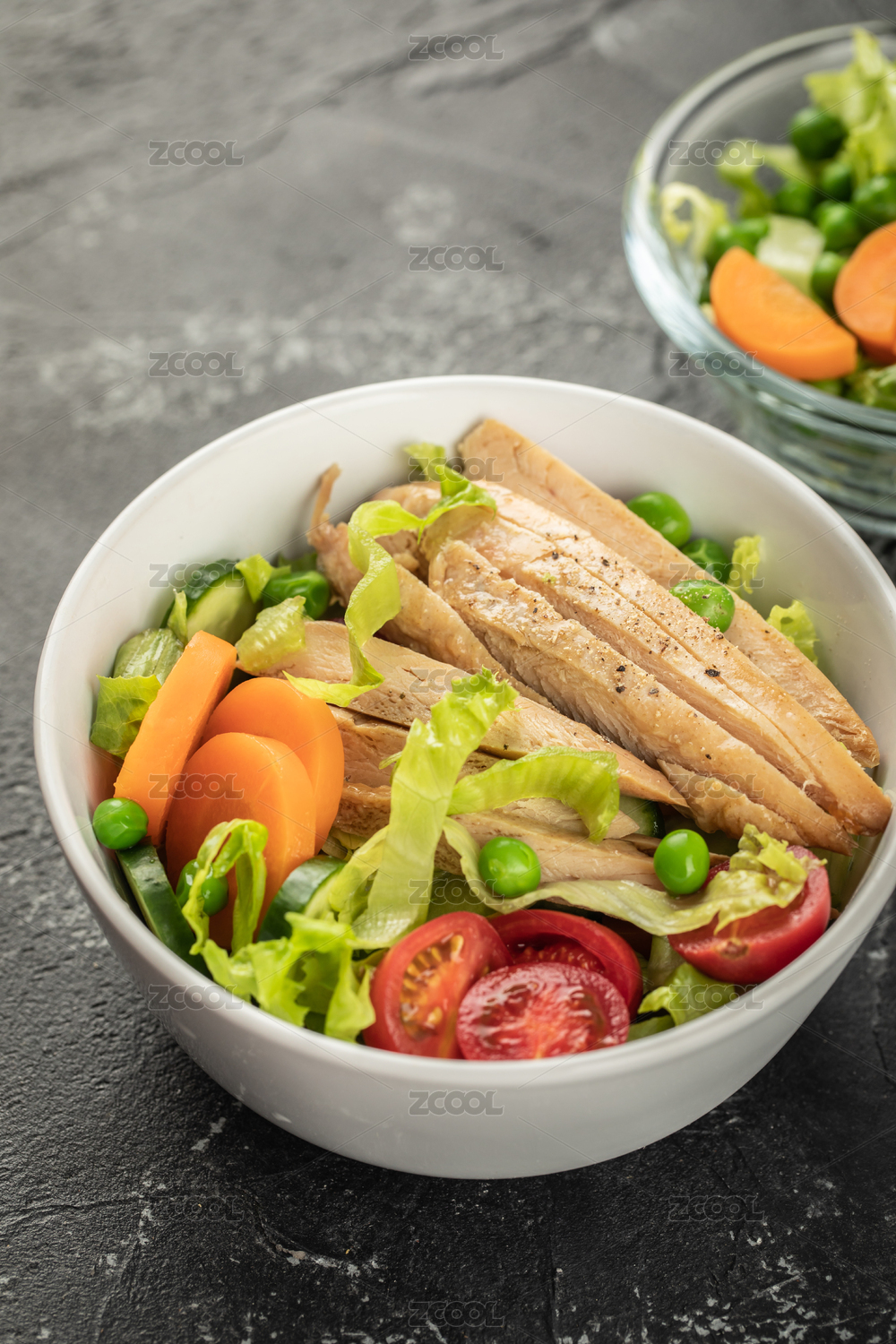 水泥紋桌面上有一碗鹽烤黑椒雞肉沙拉