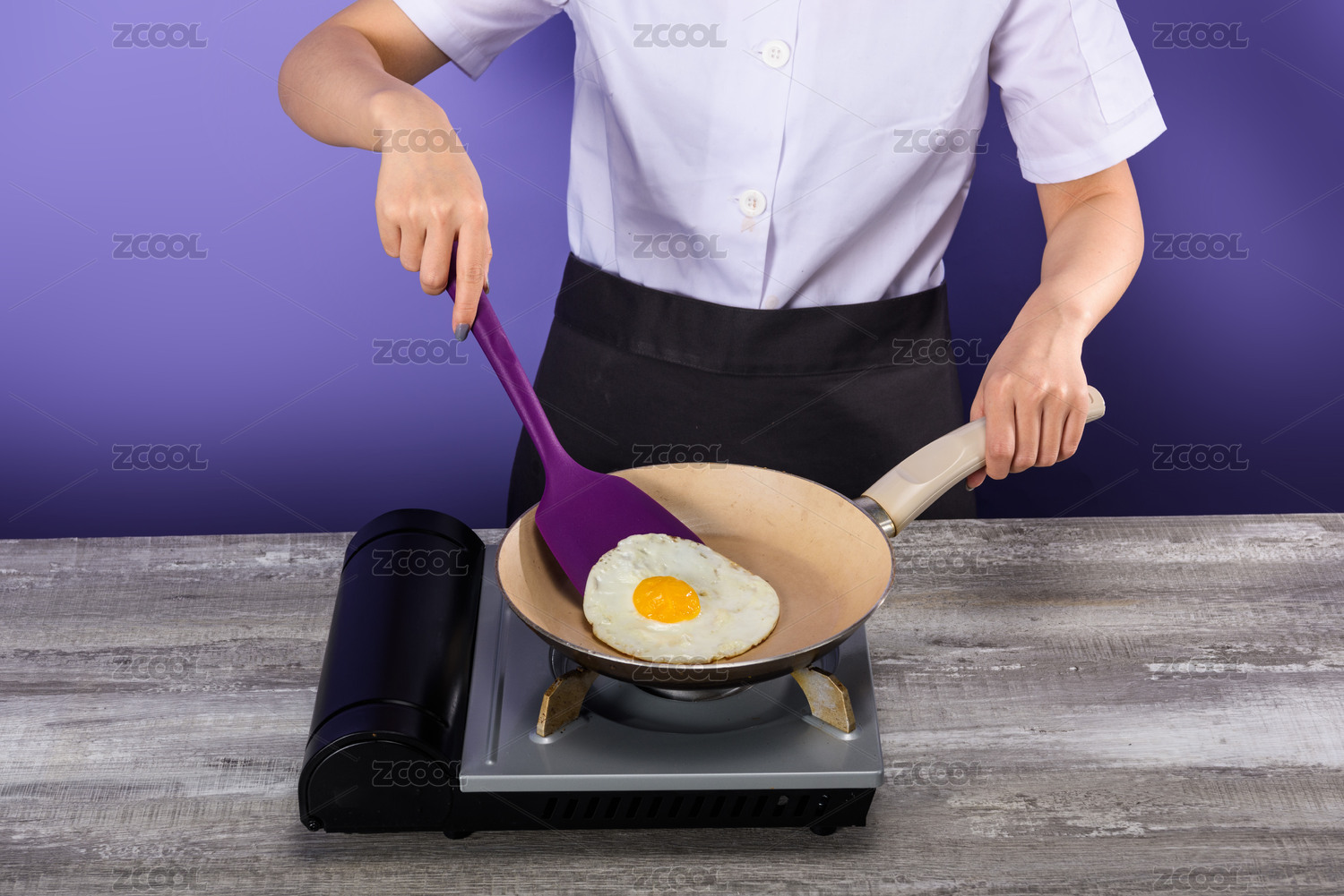 用紫色硅膠鏟在卡式爐灶上煎雞蛋