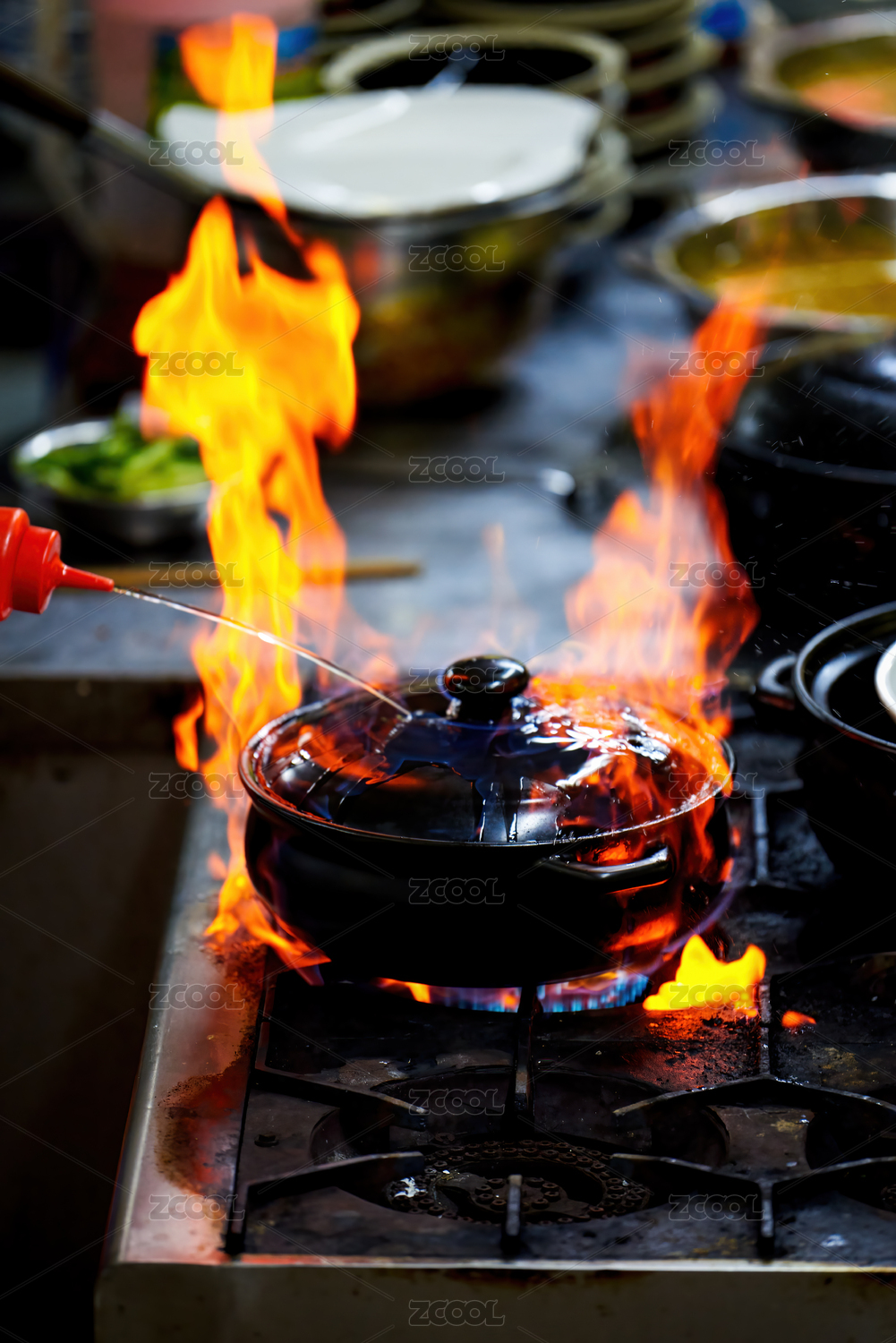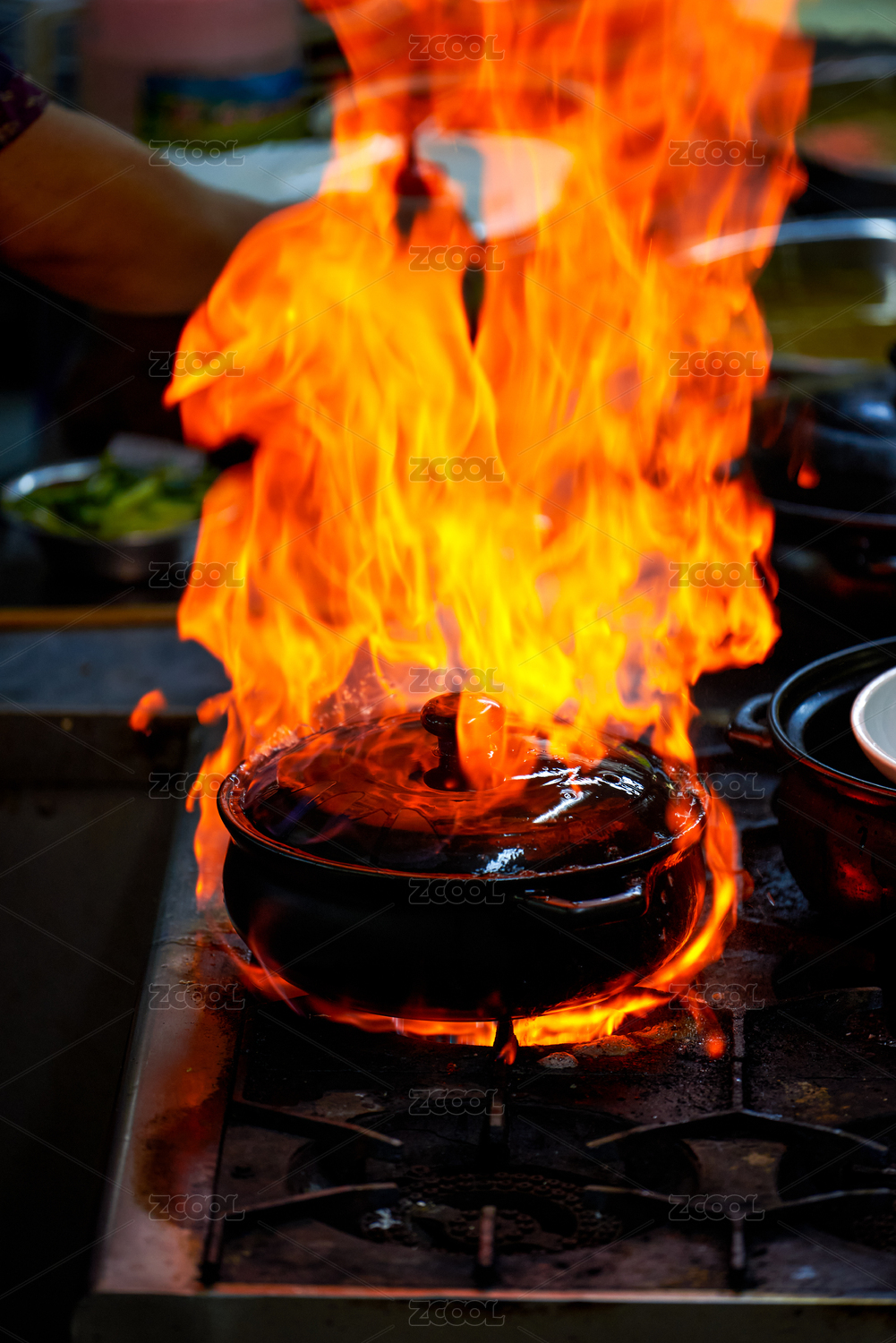 爐灶上的廣東菜啫啫煲淋上白酒后的火焰