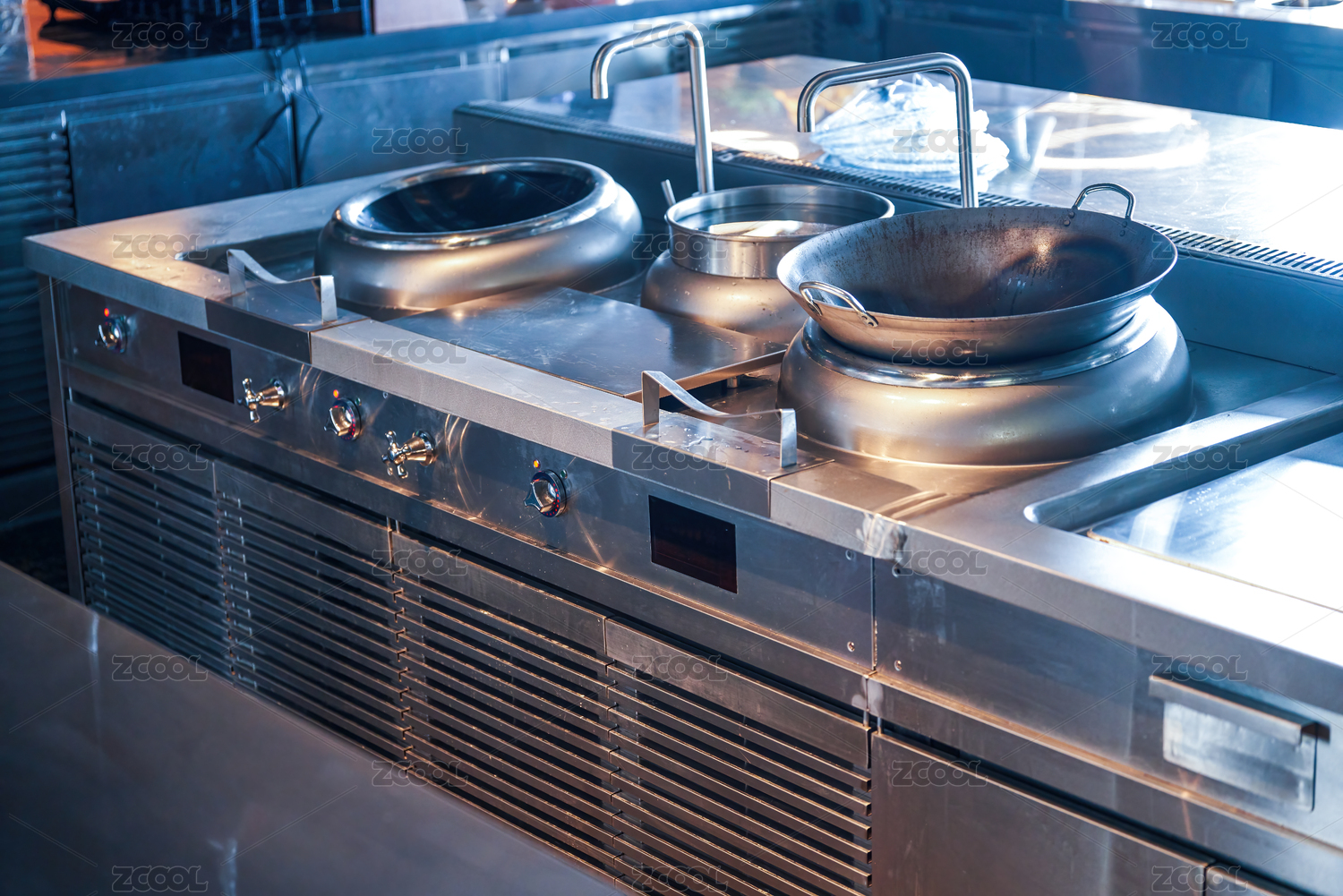 一個(gè)配有不銹鋼器具和大型爐灶的商業(yè)廚房